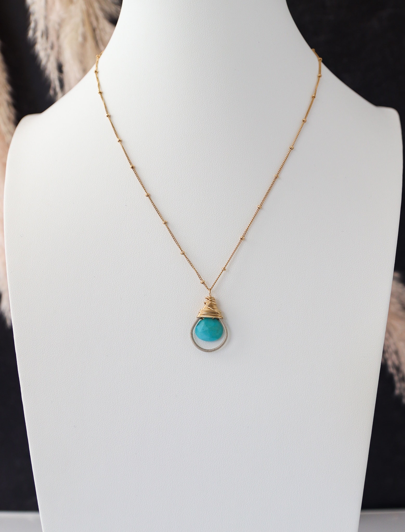 Experience the timeless elegance of a Sleeping Beauty Turquoise briolette, beautifully set in a handcrafted bezel pendant combining the warmth of 14k gold fill with the cool touch of sterling silver. This delicate piece features a custom-made clasp adorned with aquamarine rondelles, adding a subtle touch of color and sophistication. The 16" 14k gold-filled satellite chain offers a perfect length for layering or wearing solo.