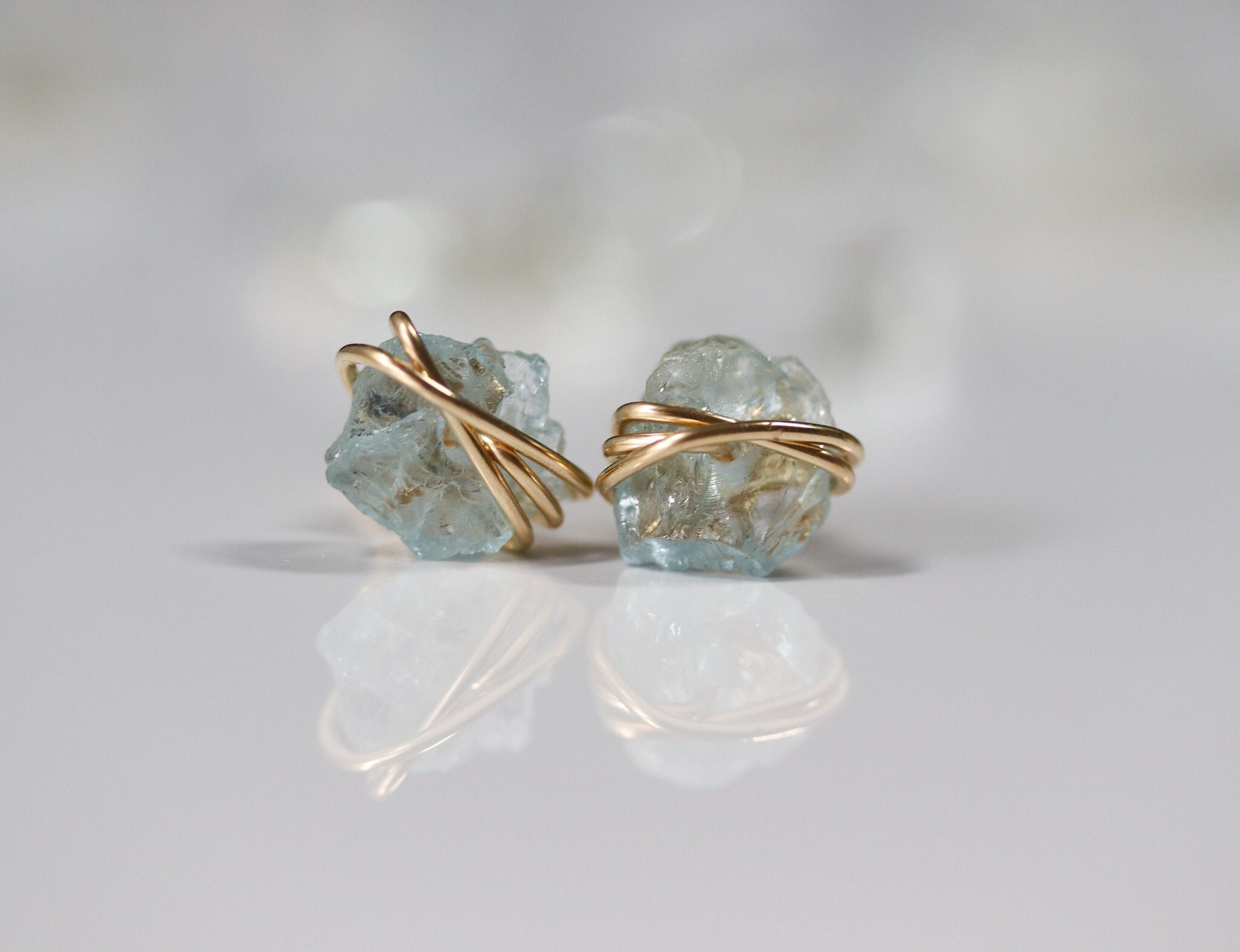 These Aquamarine crystal studs are hand-wrapped in either 14k Gold Filled or Sterling Silver to highlight the natural shape of each stone. The raw gems have beautiful, organic variations that make every pair unique—no two stones ever look the same.