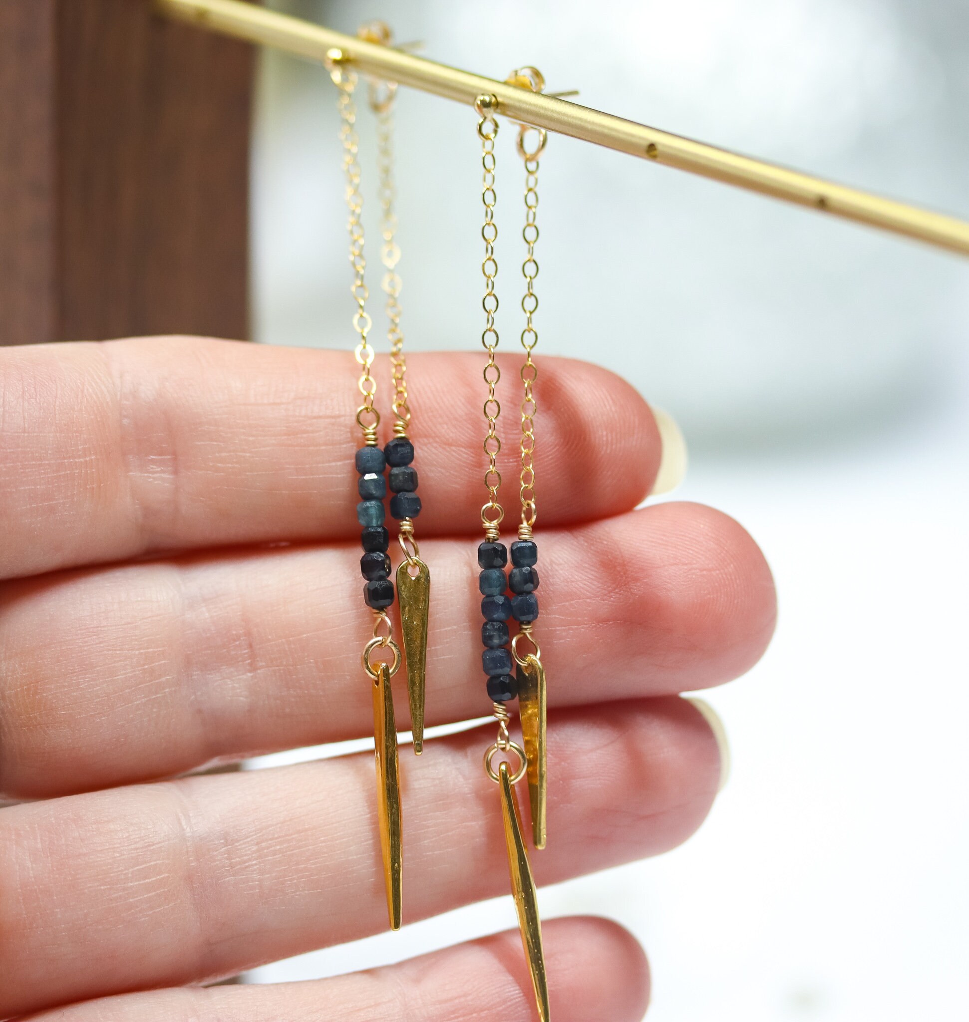 Indulge in the glamour of the night with these exquisite double-sided chain earrings, featuring stunning rare midnight blue Tourmaline and gleaming gold spikes. The unique design of these earrings allows for a luxurious, edgy look that will effortlessly elevate any outfit. Perfect for special occasions or to add a touch of sophistication to your everyday style. Don't miss out on the chance to showcase your bold and chic personality with these Go for Lux earrings.