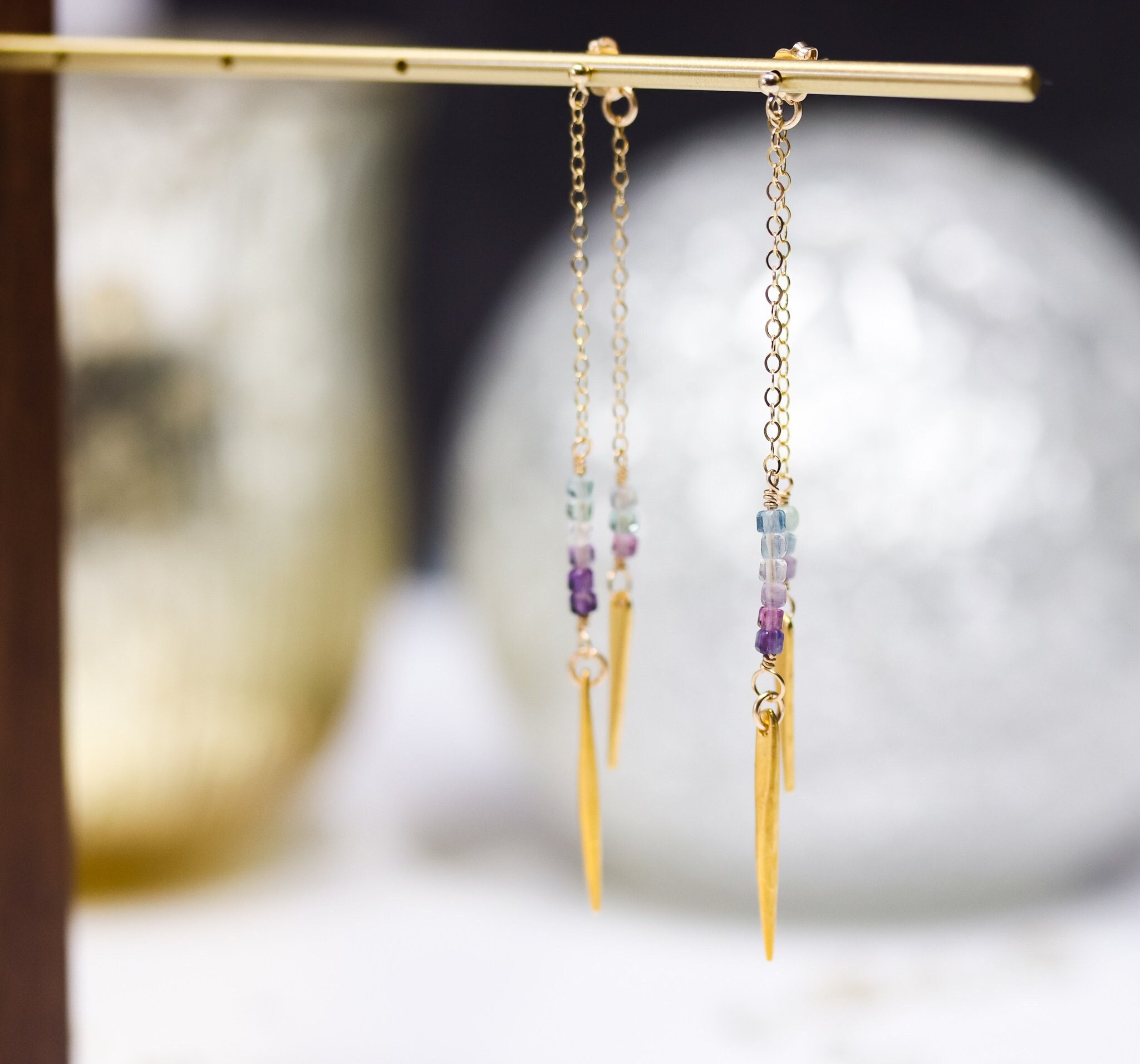 Upgrade your jewelry game with these stunning double-sided chain earrings featuring a captivating combination of purple and blue Rainbow Fluorite and gold spikes. The unique design allows you to show off both sides of the earrings, adding a touch of versatility to your style. Let the iridescent hues of the Fluorite reflect your vibrant personality while the gold spikes add a touch of edginess to your look. Whether you're dressing up for a special occasion or adding some flair to your everyday outfit, these earrings are sure to turn heads and make a statement. Treat yourself or a loved one to the ultimate Go for Lux earrings.