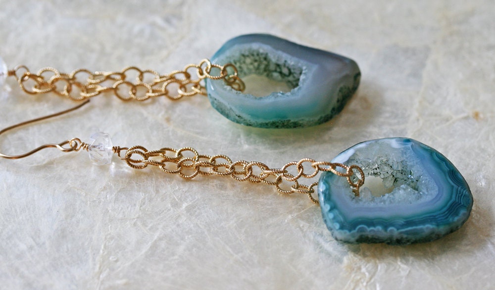 Light green druzy geode slices dangle from 14k gold filled chain with a moonstone rondelle. Every slice of geode druzy is one of kind. Each geode slice has a center cut out with a glistening druse of crystals.