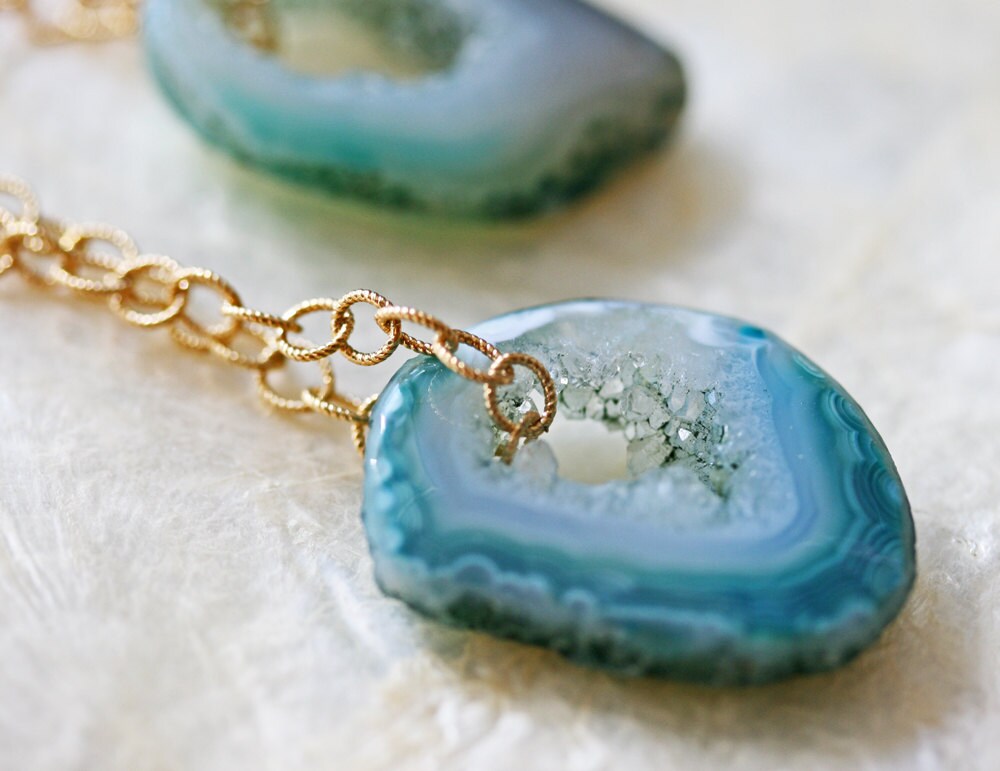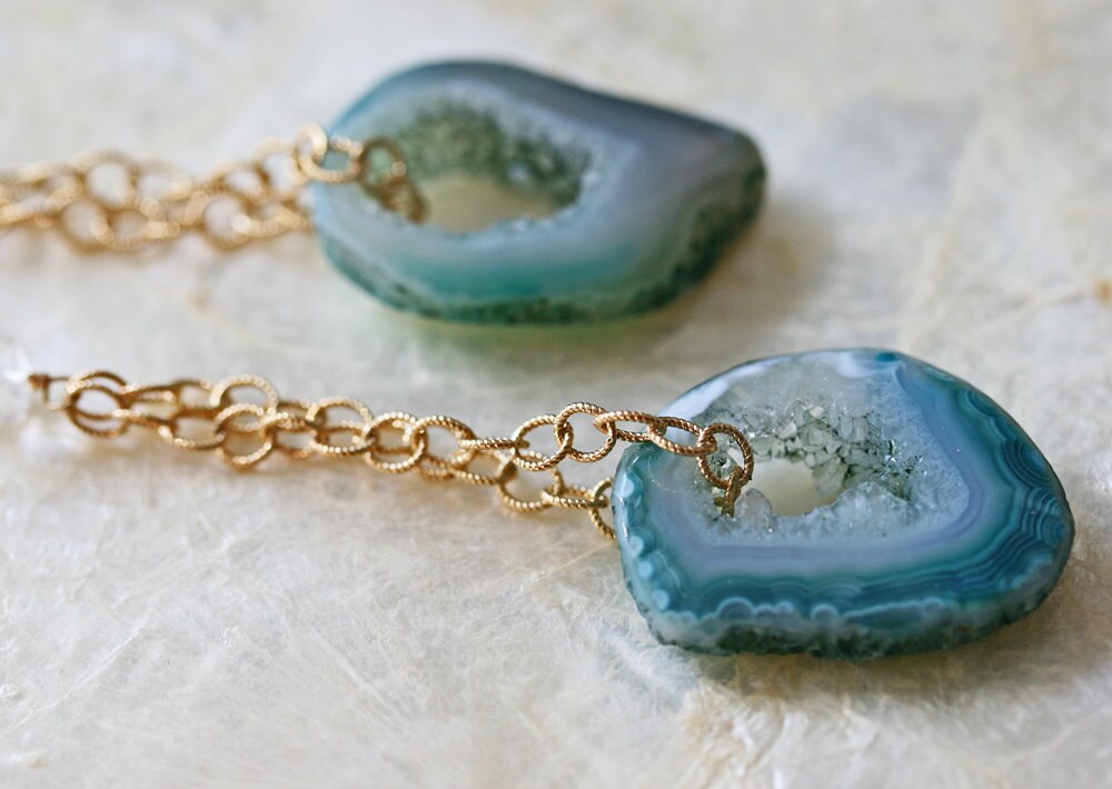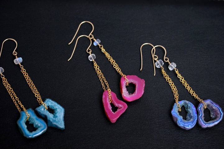 All geodes, druzy, crystals, and raw gems are unique and one of a kind. I do my best to pair them based on color or size. With that being said, when you order a pair of earrings they will NOT be identical. (Think sisters, not twins) This is what I find interesting and beautiful about these earrings. Geode slices are delicate. Take care not to drop them on hard surfaces and they will last for years to come.