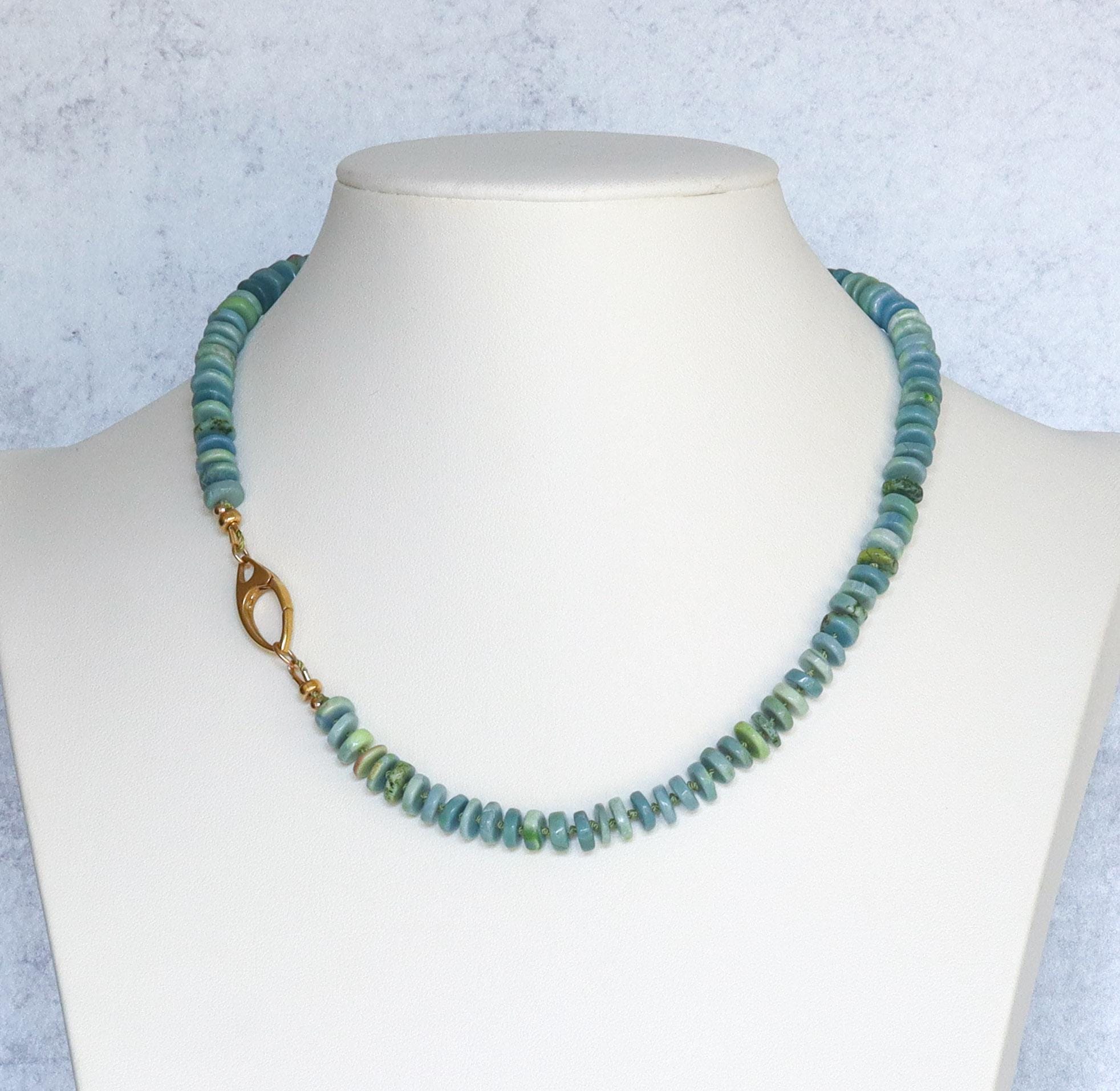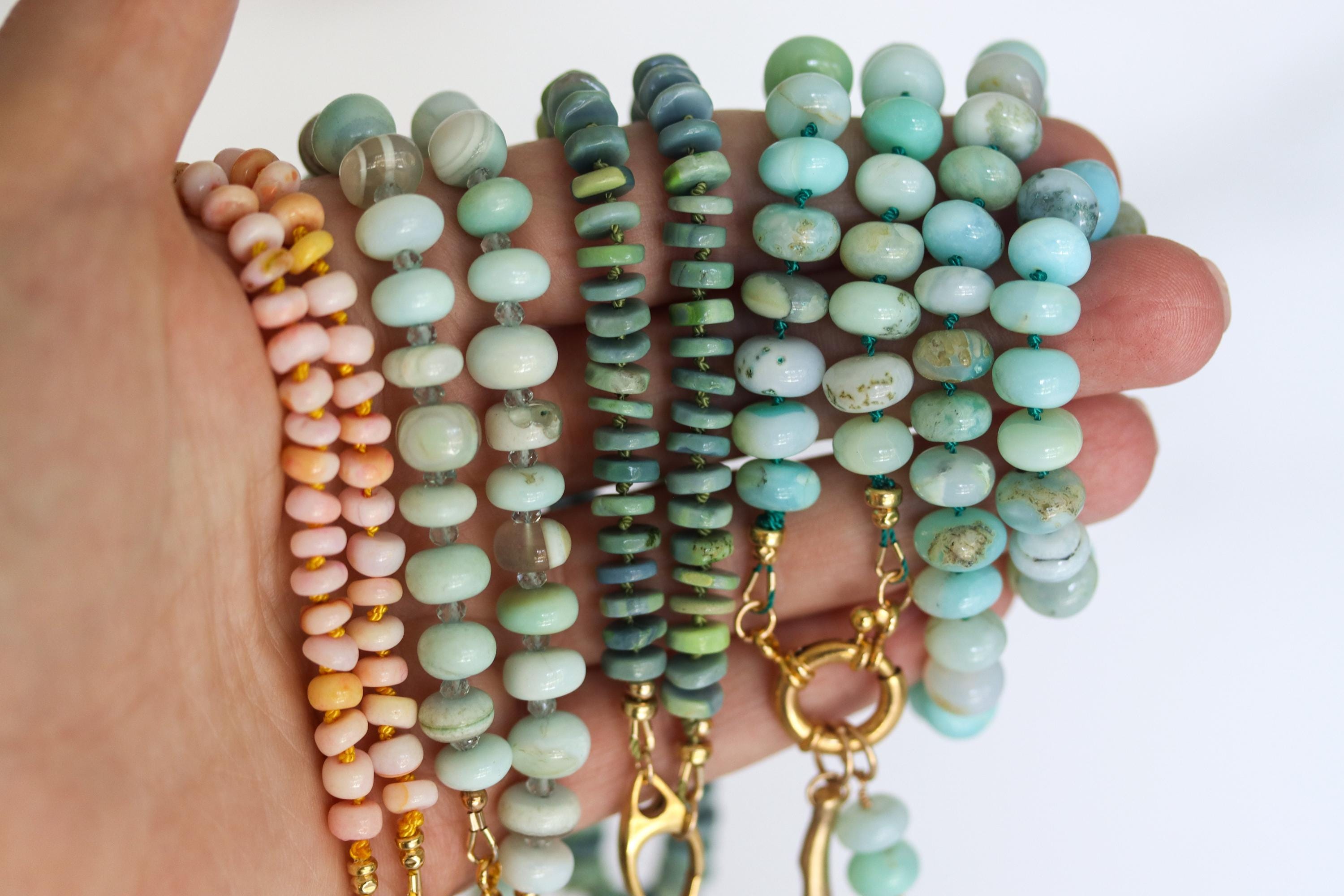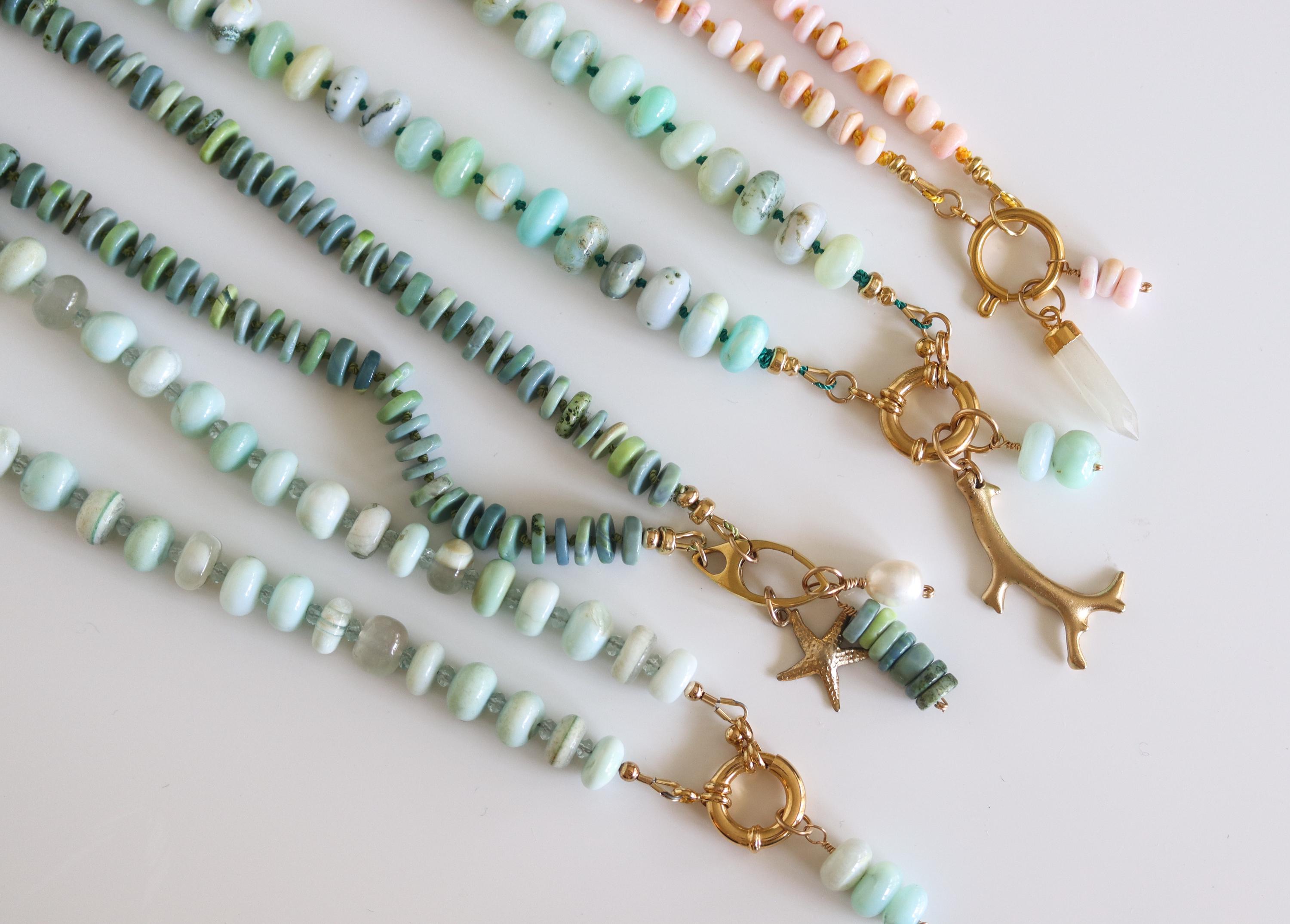 Striking green-blue Peruvian Opal heishi beads are hand-knotted on silk and finished with a gold vermeil charm holder clasp, creating a necklace that’s both earthy and elegant with a touch of coastal charm.