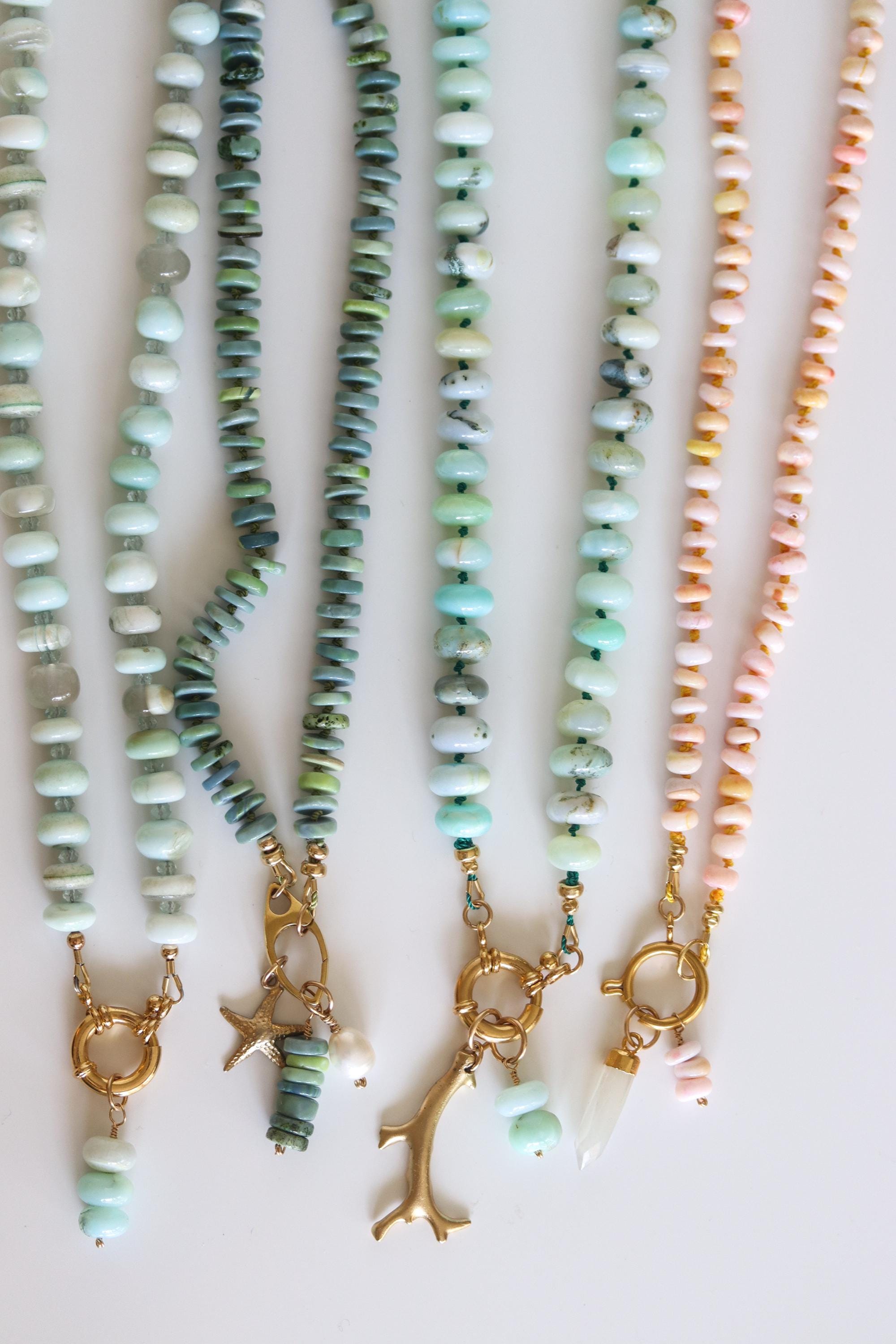 A soft palette of pink, peach, and golden yellow opals—hand-knotted and full of warm summer energy. This versatile pink opal necklace features rondelle-shaped gemstone beads, each hand-knotted on sunny yellow silk for a playful, layered look. The oversized gold-plated spring ring clasp doubles as a charm holder, giving you styling options to wear it front and center, off to the side, or simply as a clean strand.