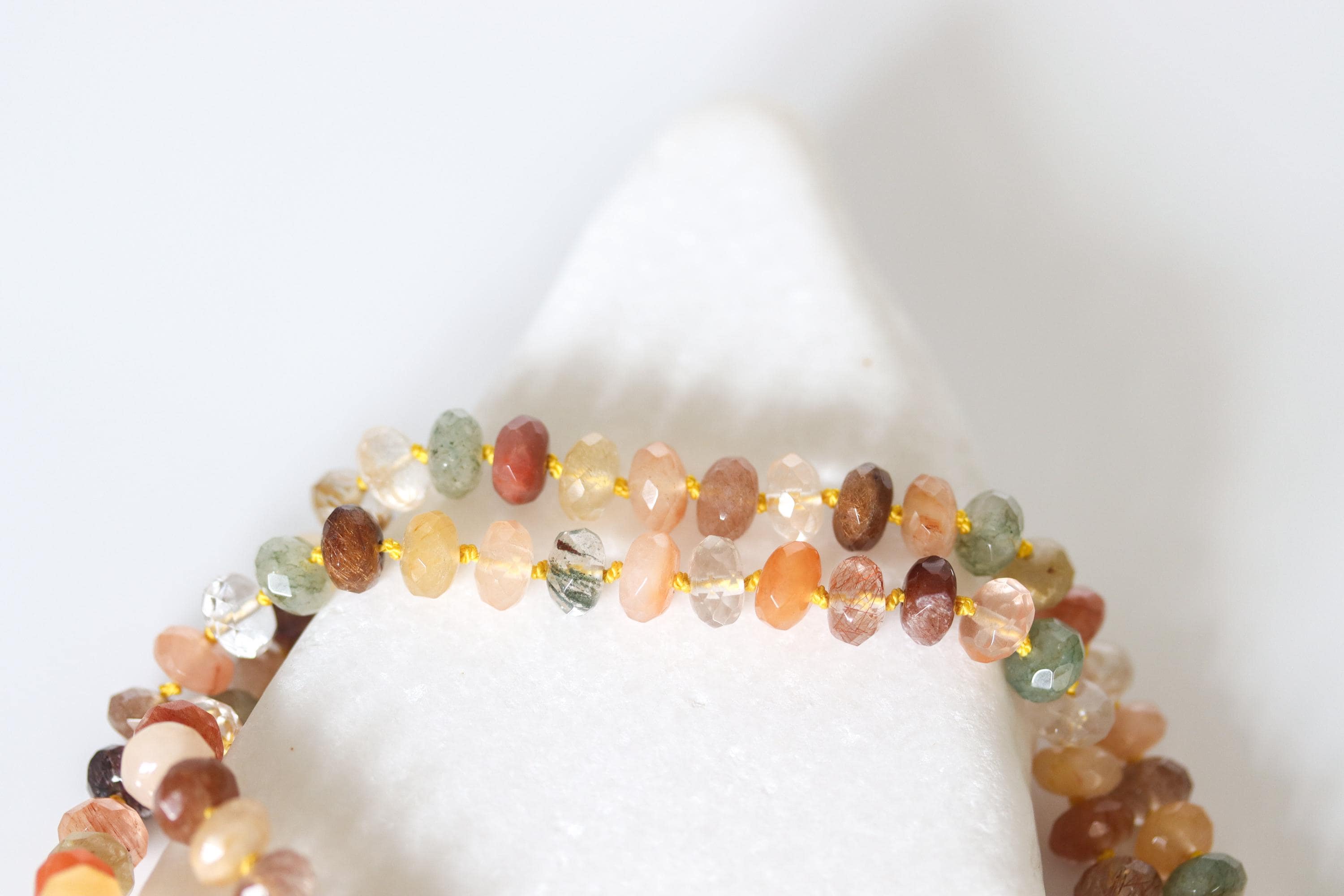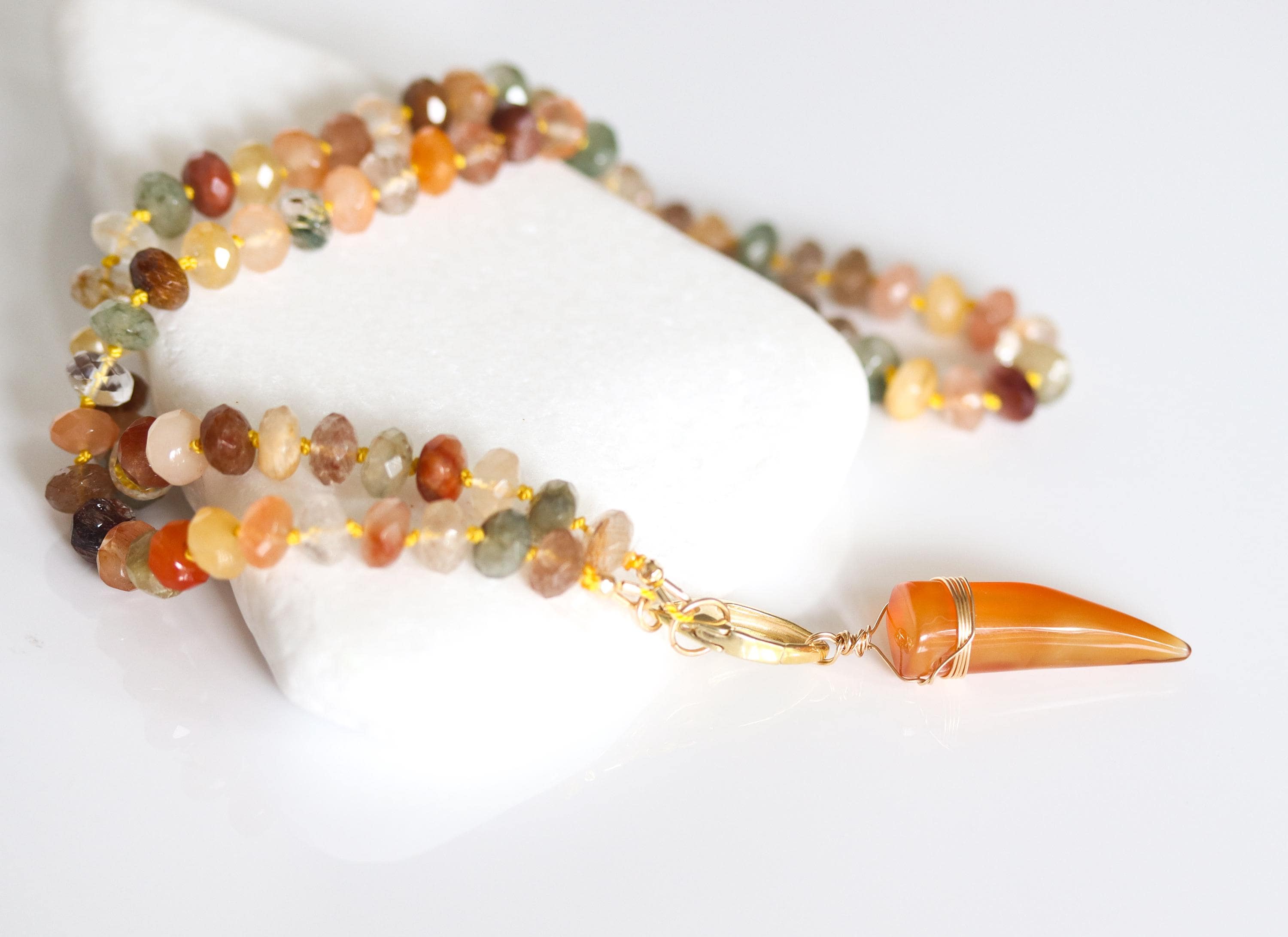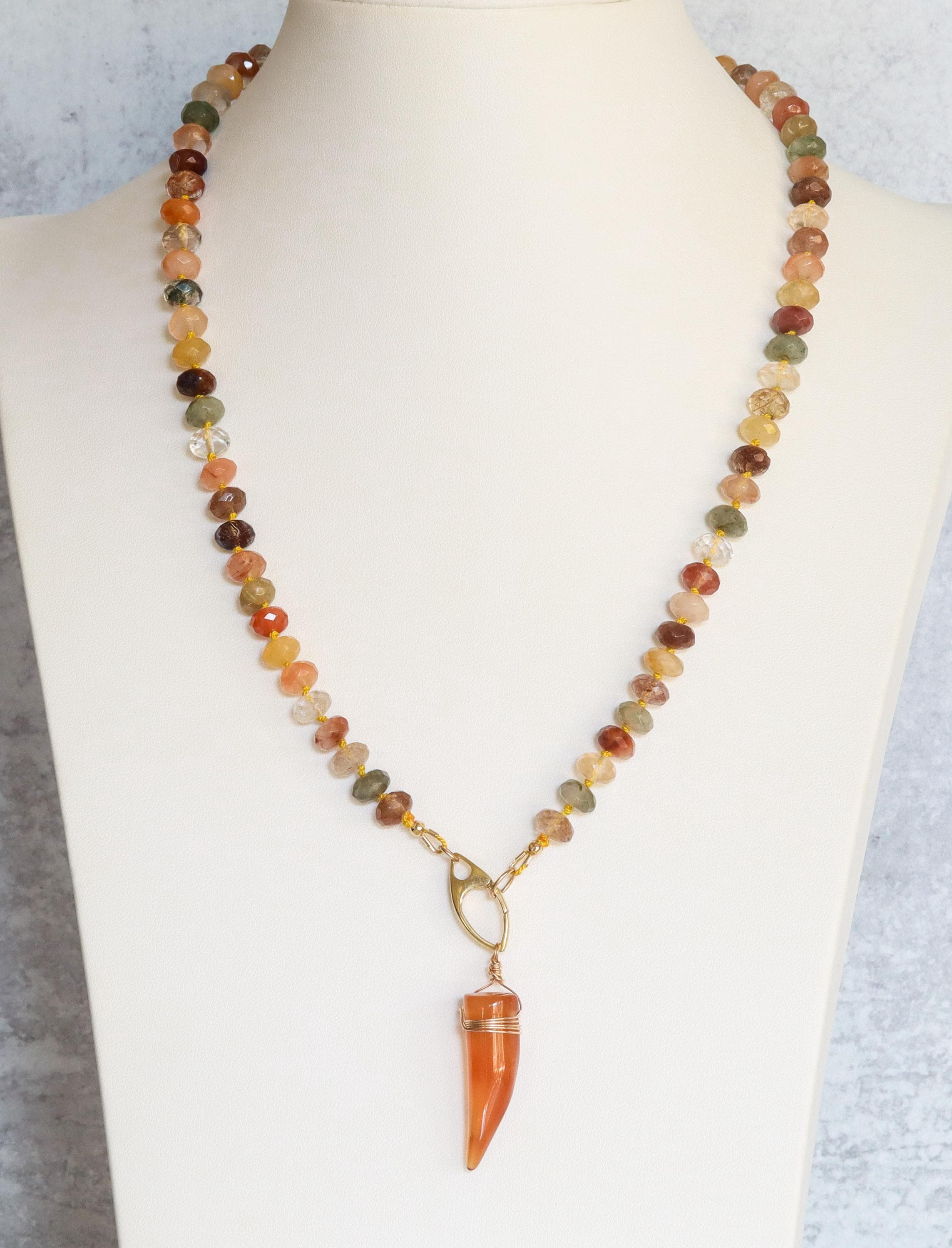 This radiant Rutilated Quartz Necklace with Carnelian tusk charm captures the warmth and depth of nature’s golden tones. Each 10mm faceted rondelle bead reveals mesmerizing streaks of gold, brown, and amber; a natural dance of color and light within genuine rutilated quartz.