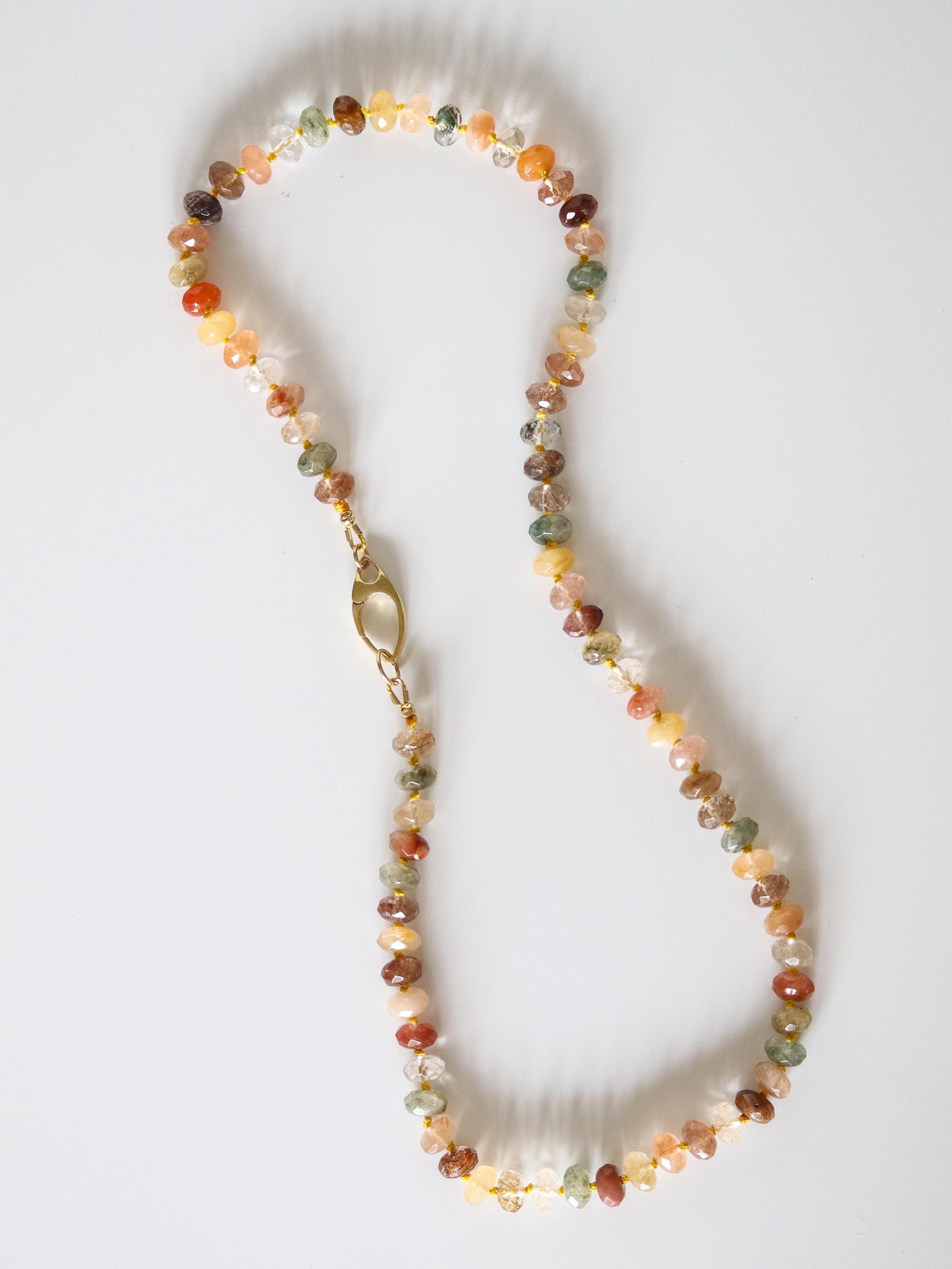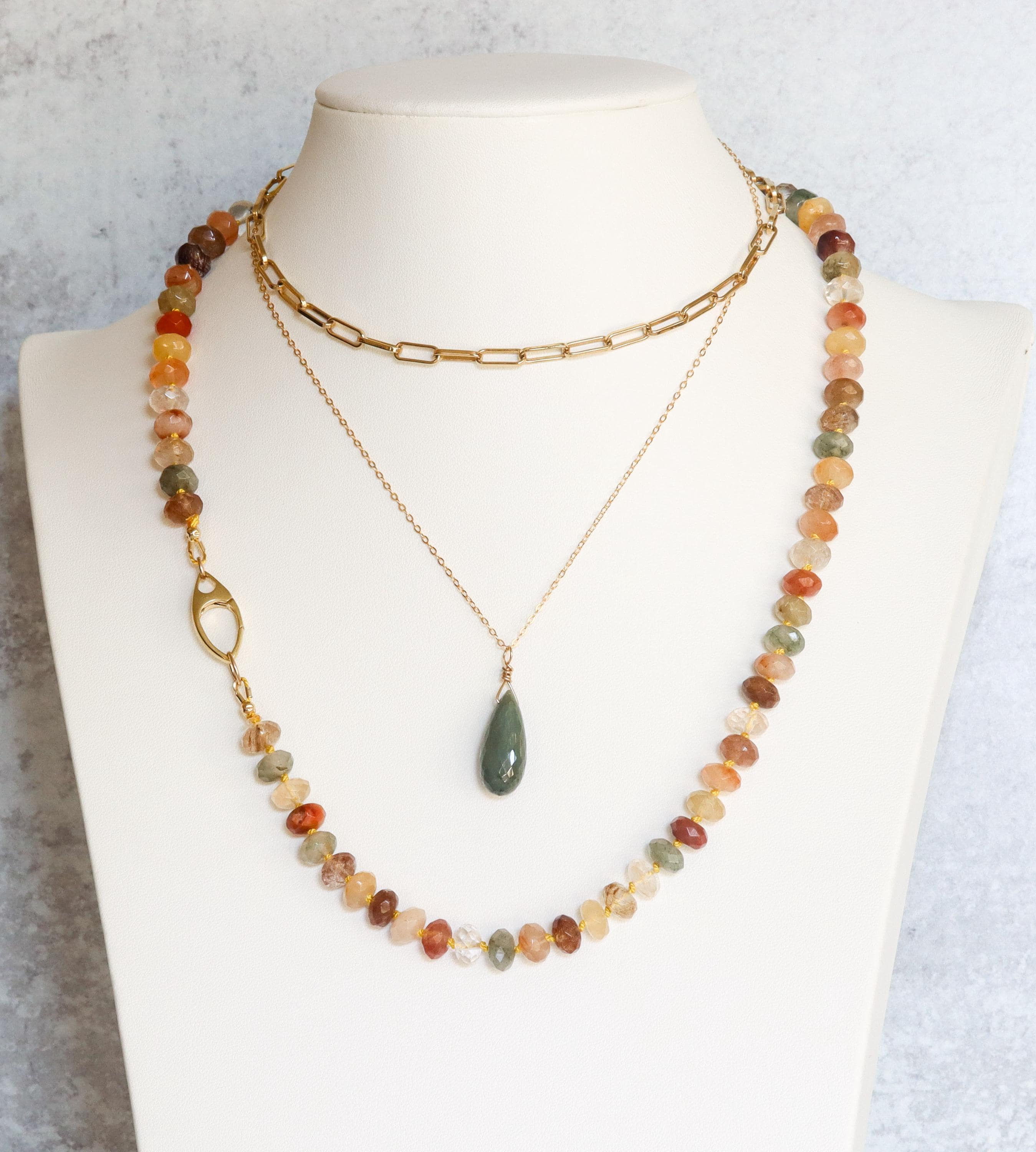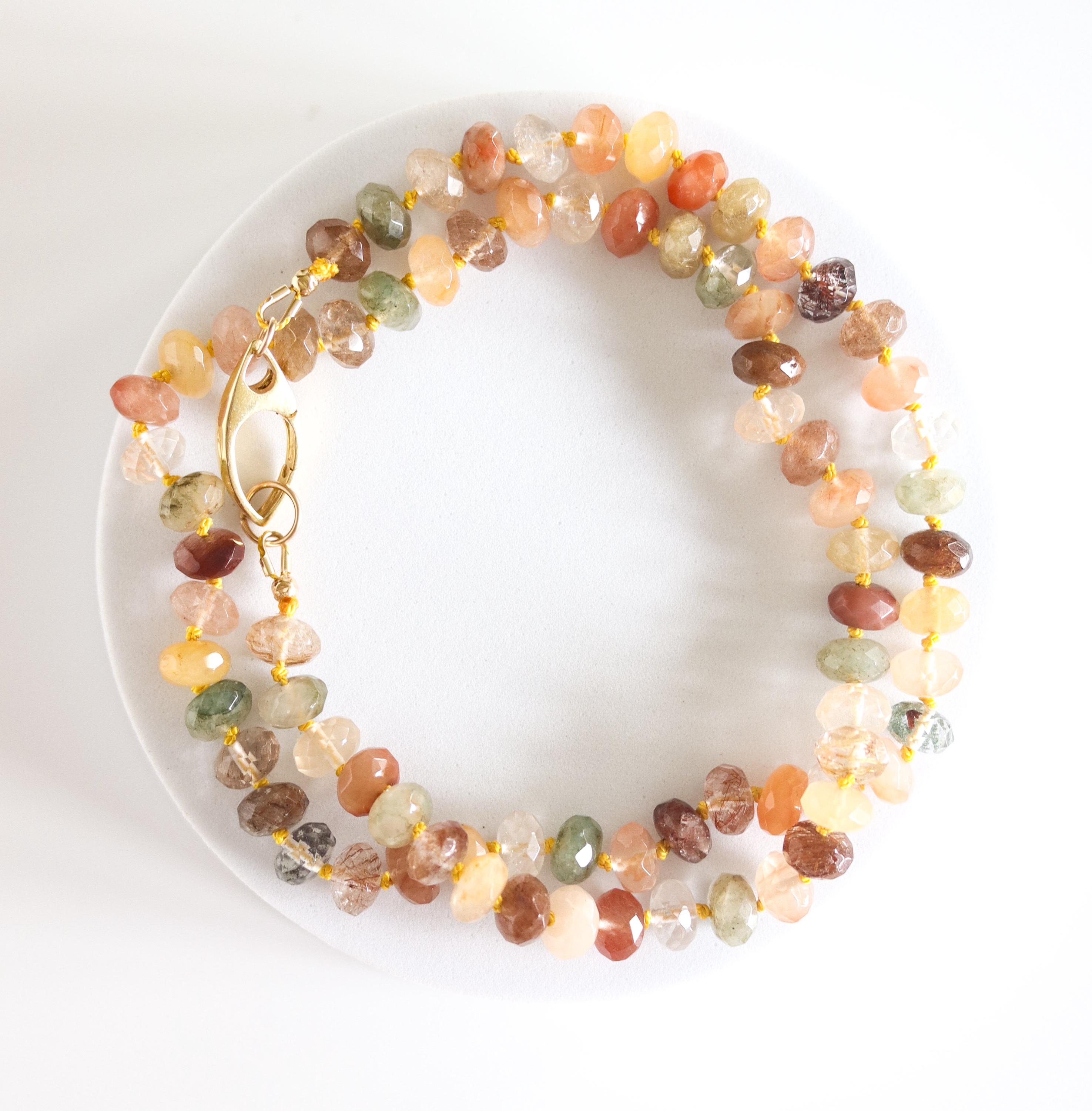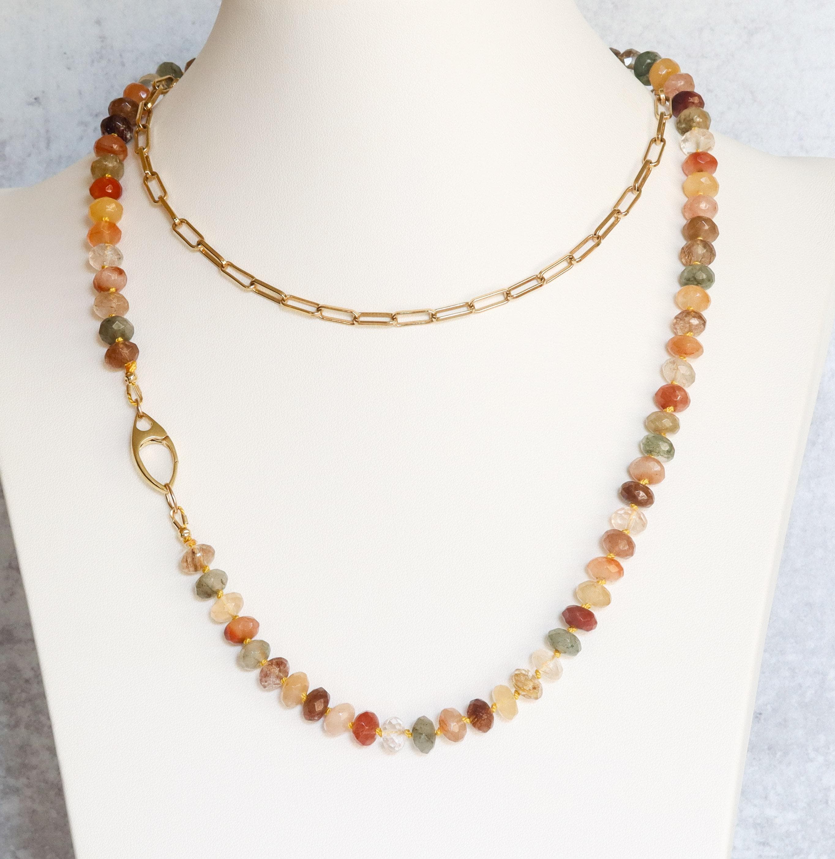 This radiant Rutilated Quartz Necklace with Carnelian tusk charm captures the warmth and depth of nature’s golden tones. Each 10mm faceted rondelle bead reveals mesmerizing streaks of gold, brown, and amber; a natural dance of color and light within genuine rutilated quartz.