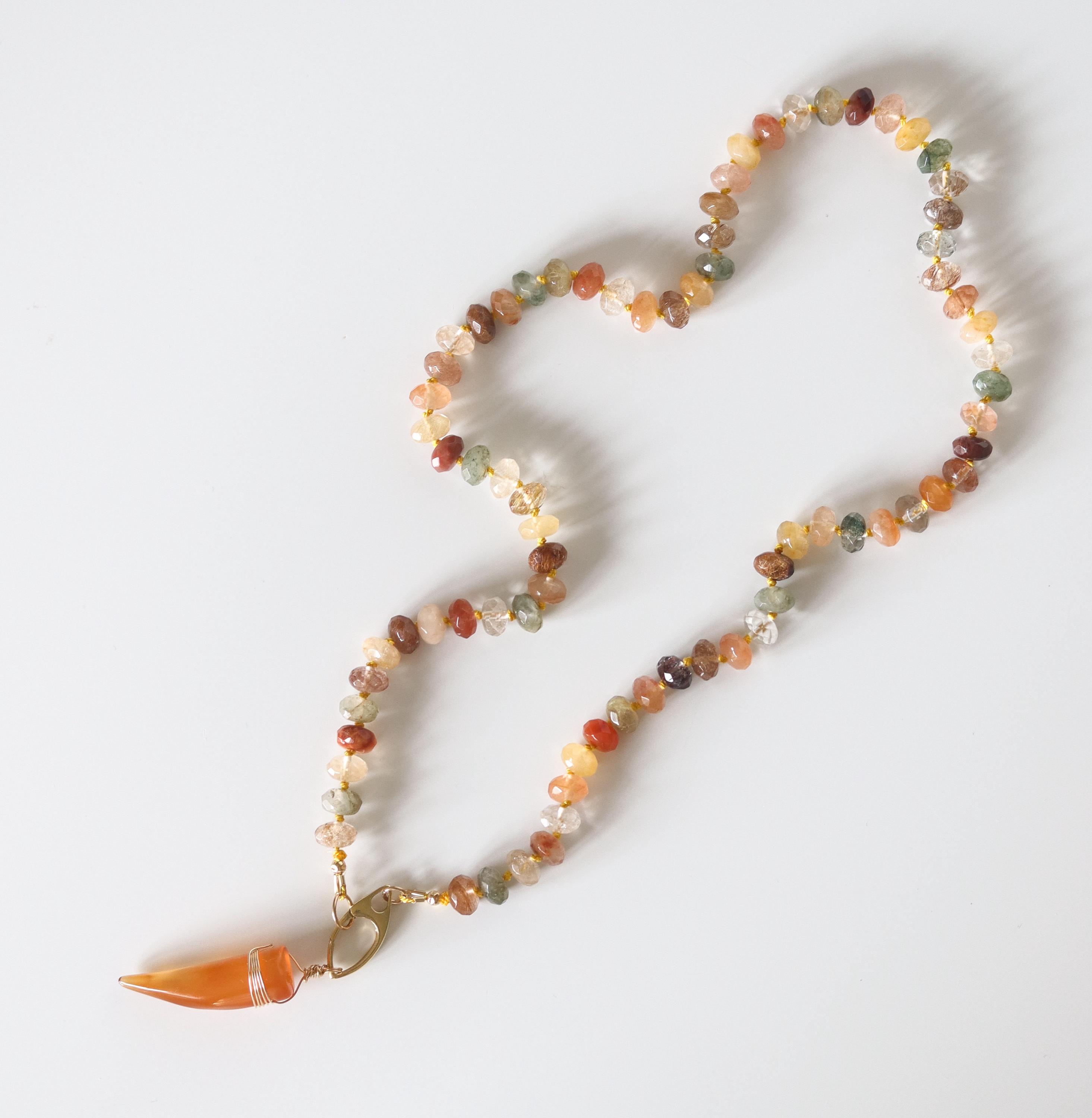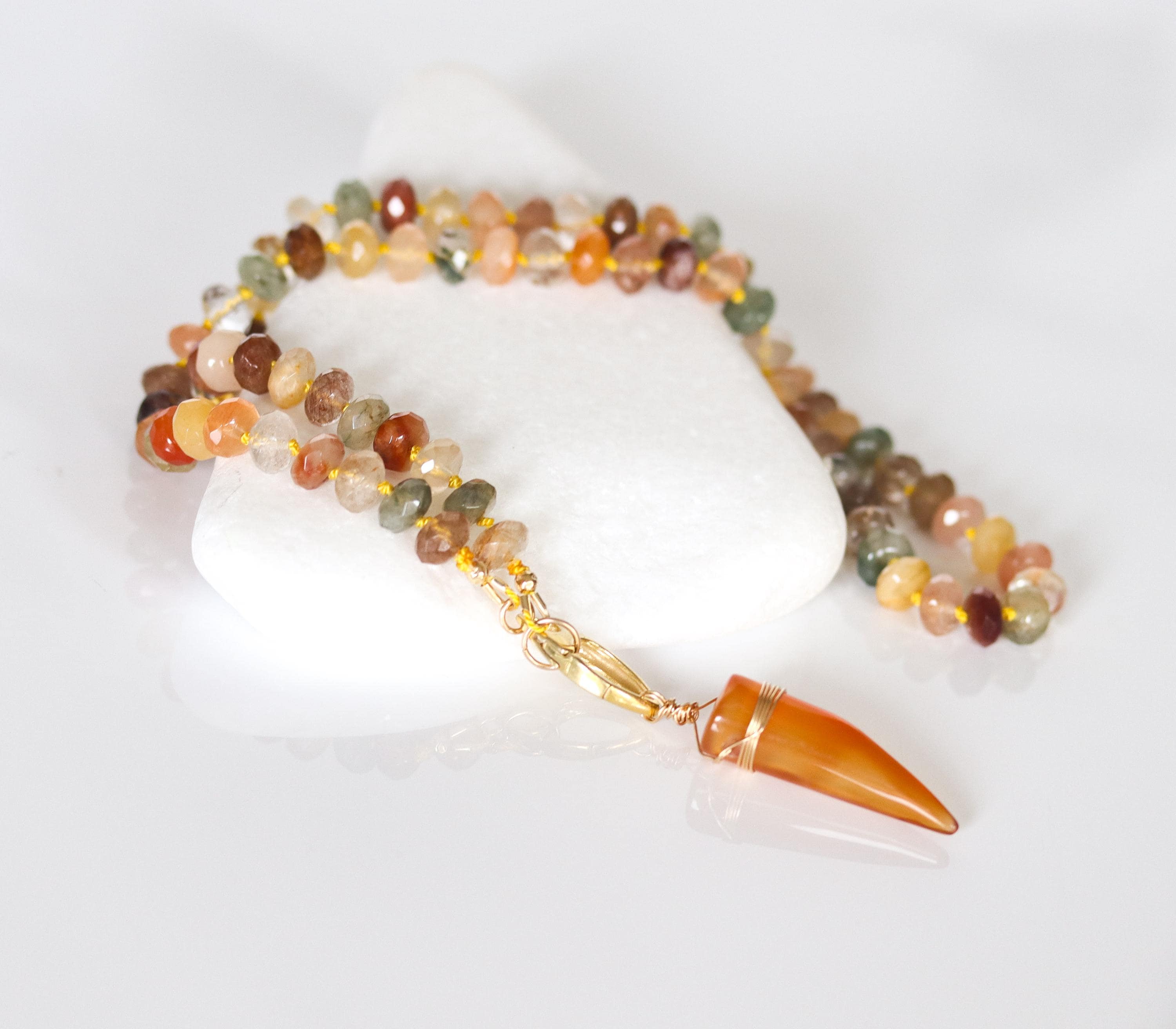 Expertly hand-knotted on yellow silk, the strand exudes refined craftsmanship and texture. The removable Carnelian tusk pendant, wrapped in 14k gold-filled wire, adds a bold focal point with its rich orange-red hue symbolizing vitality and confidence.