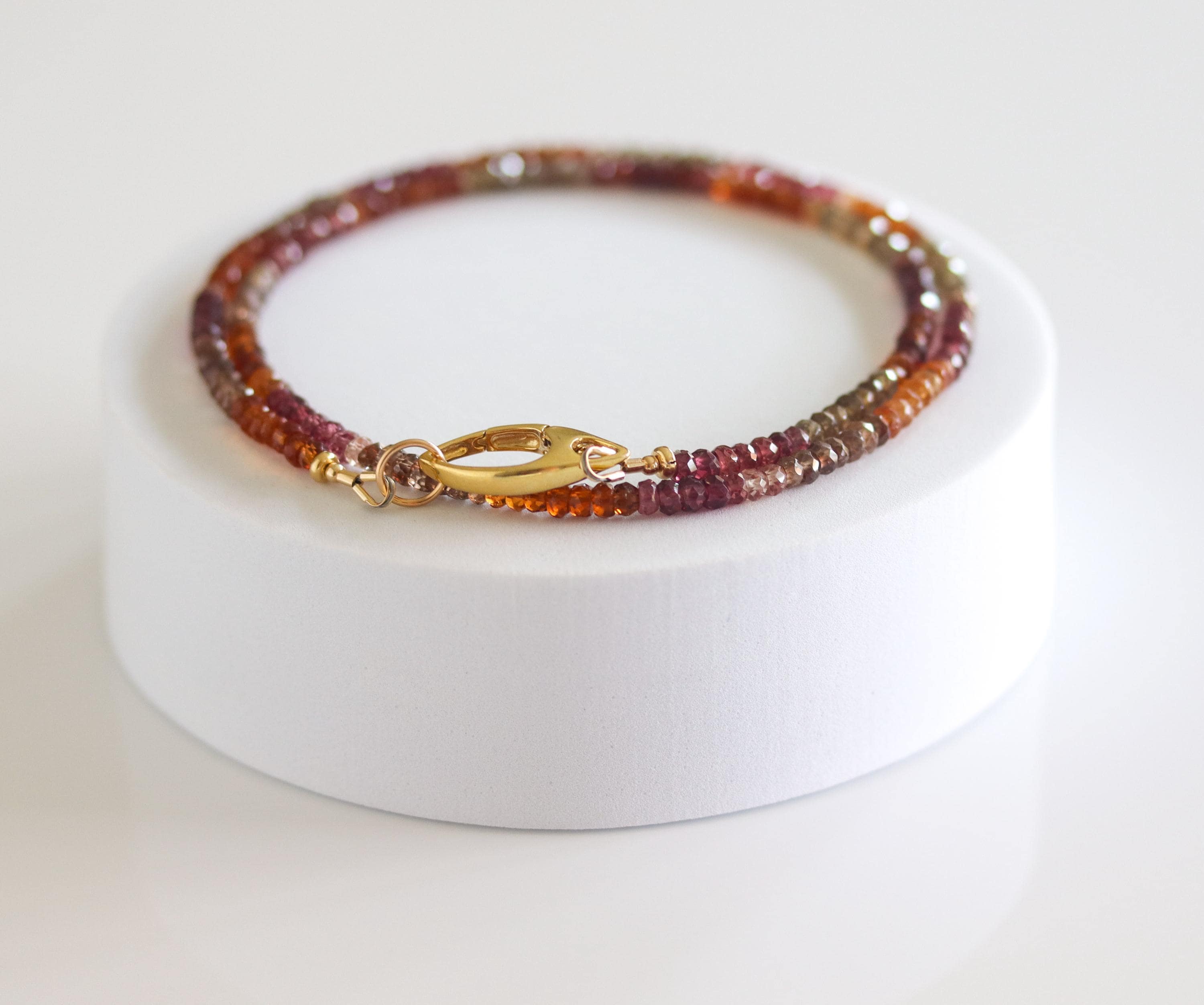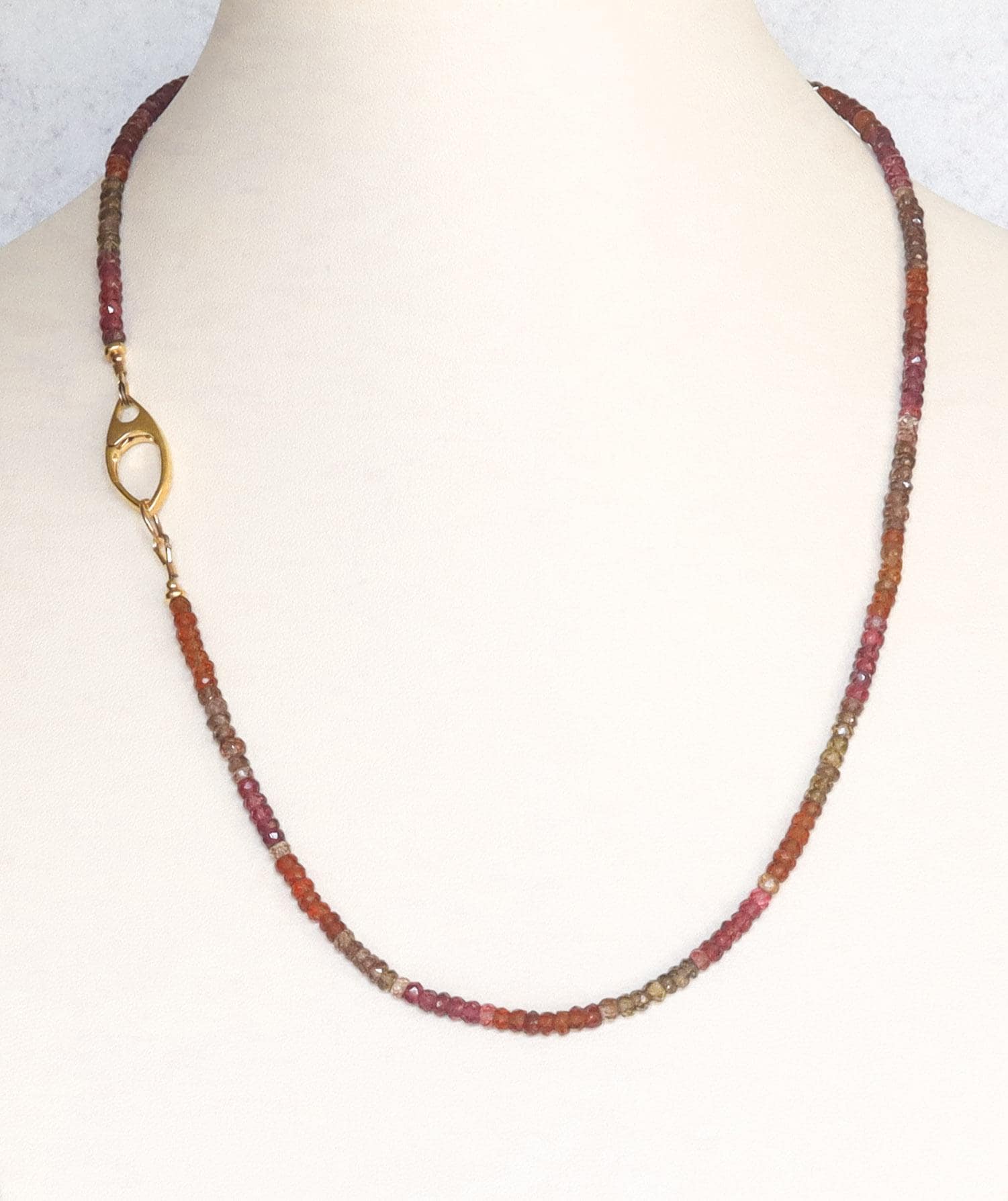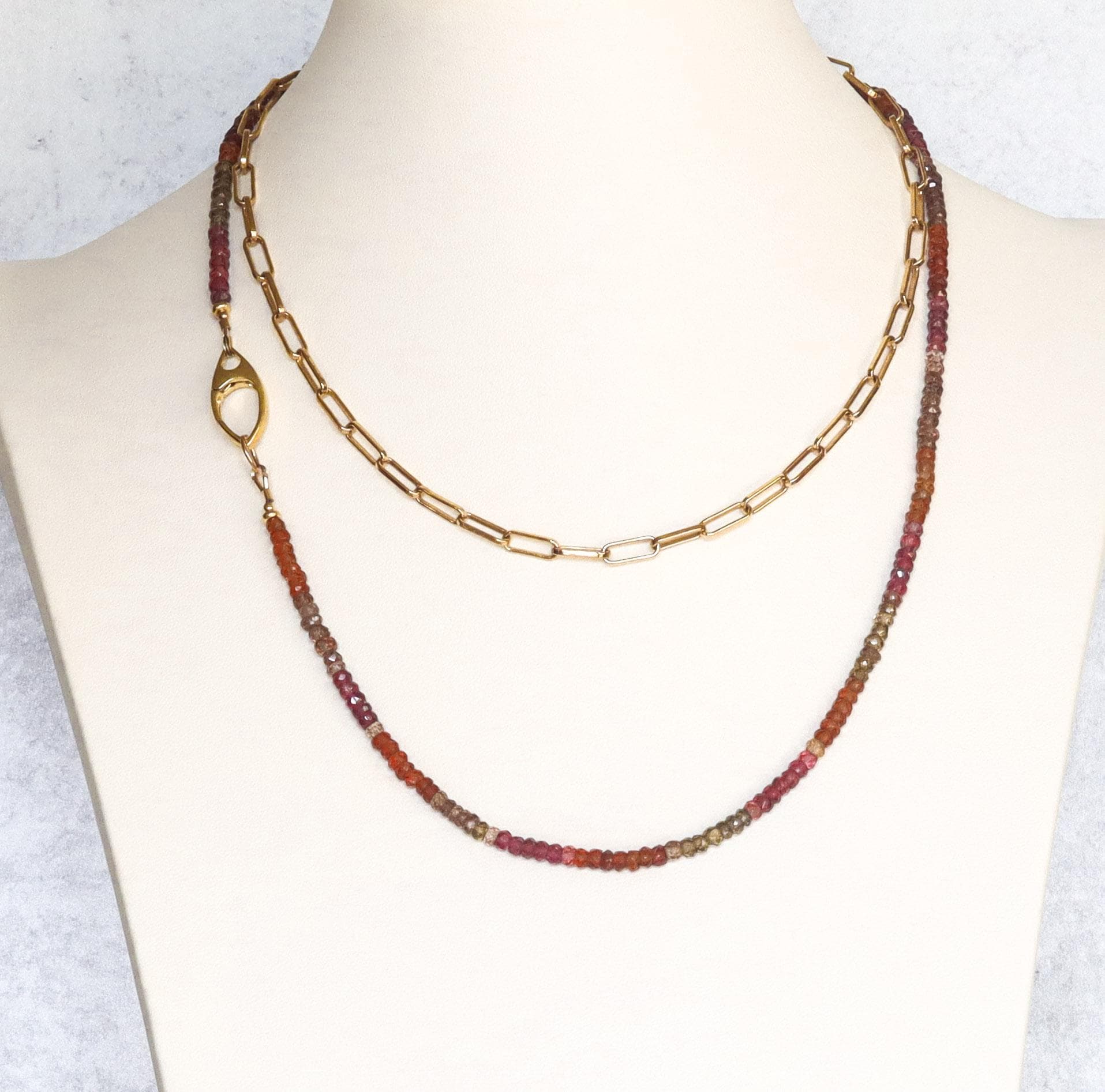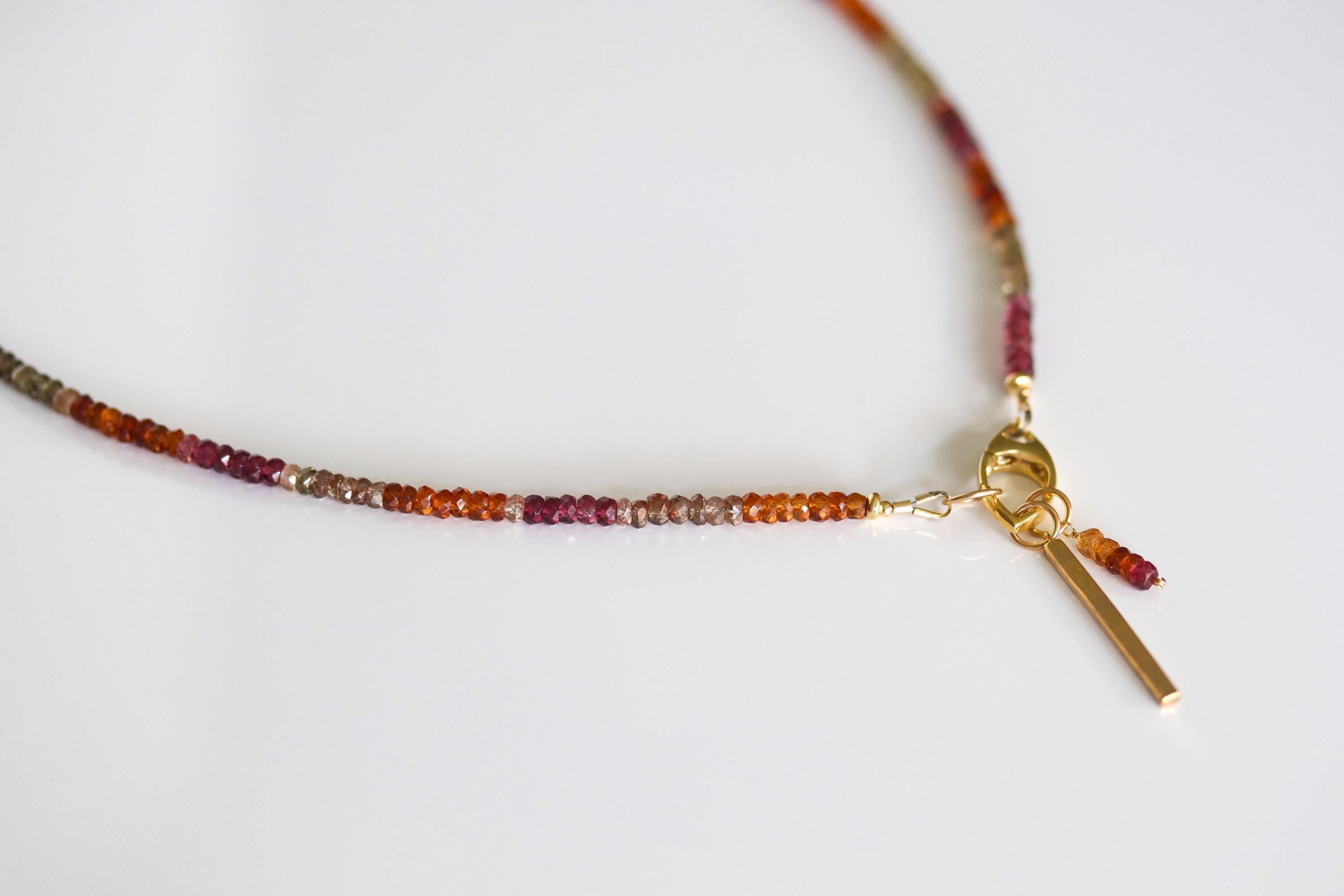 Elevate your jewelry collection with this handcrafted garnet charm holder necklace, made from genuine micro-faceted garnet gemstones that shimmer in deep shades of red, brown, and amber. Each tiny 3mm stone is carefully strung by hand and finished with 14k gold-filled findings and a statement 18k gold vermeil clasp designed to hold interchangeable charms.