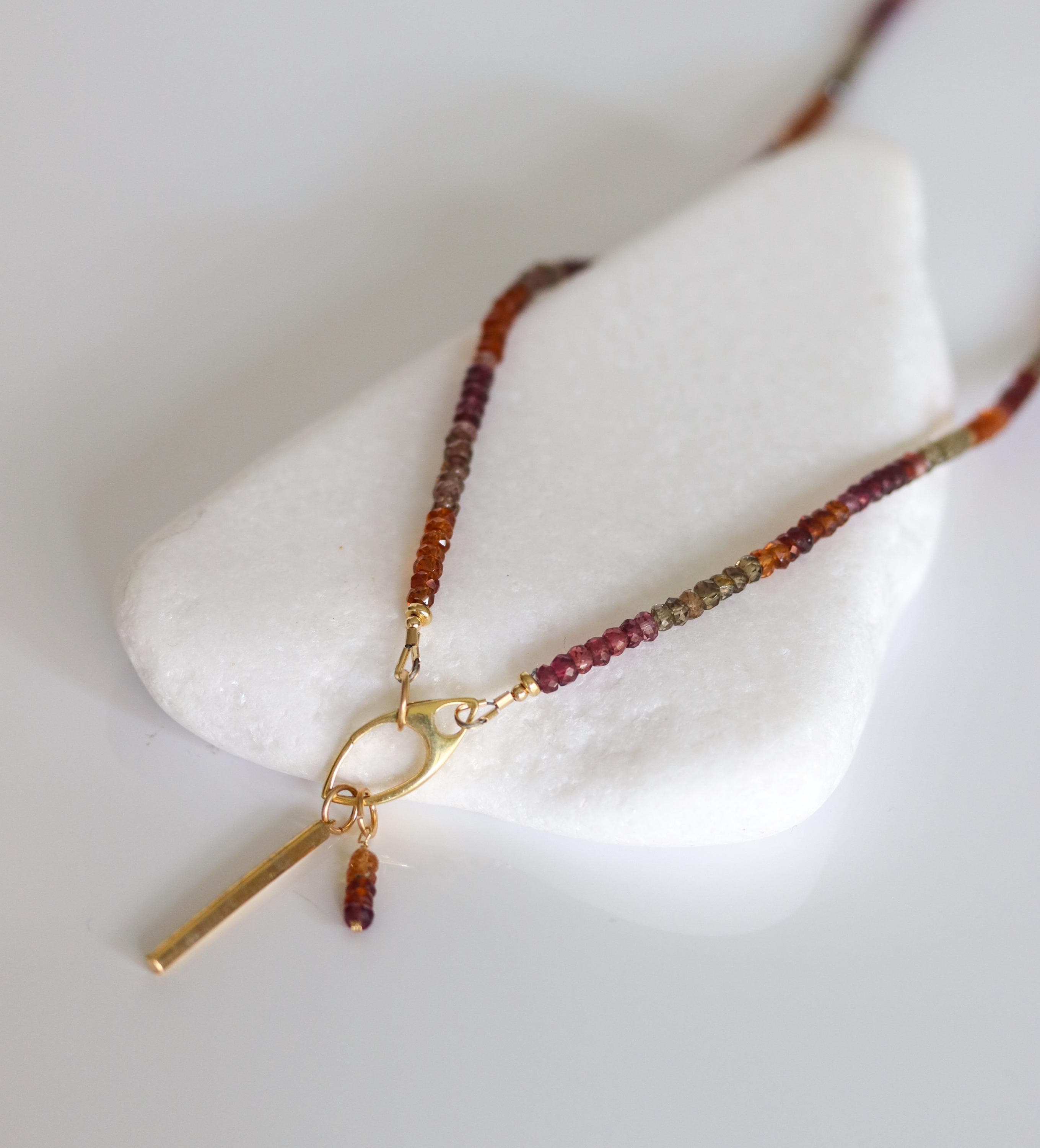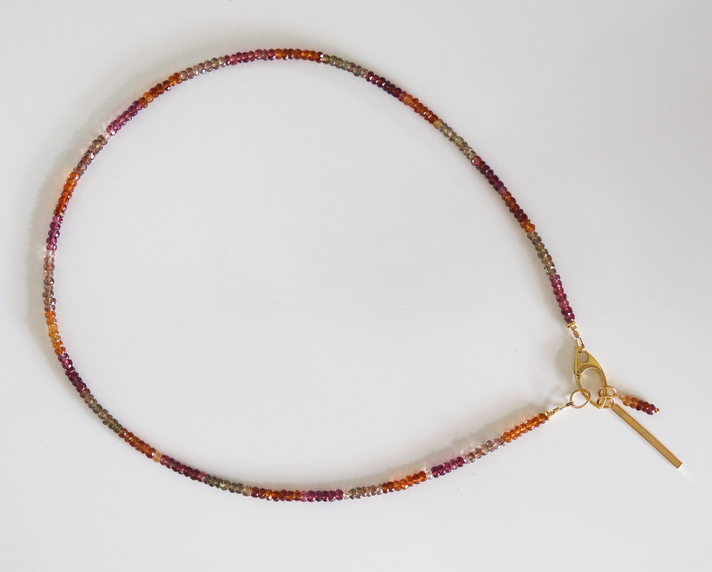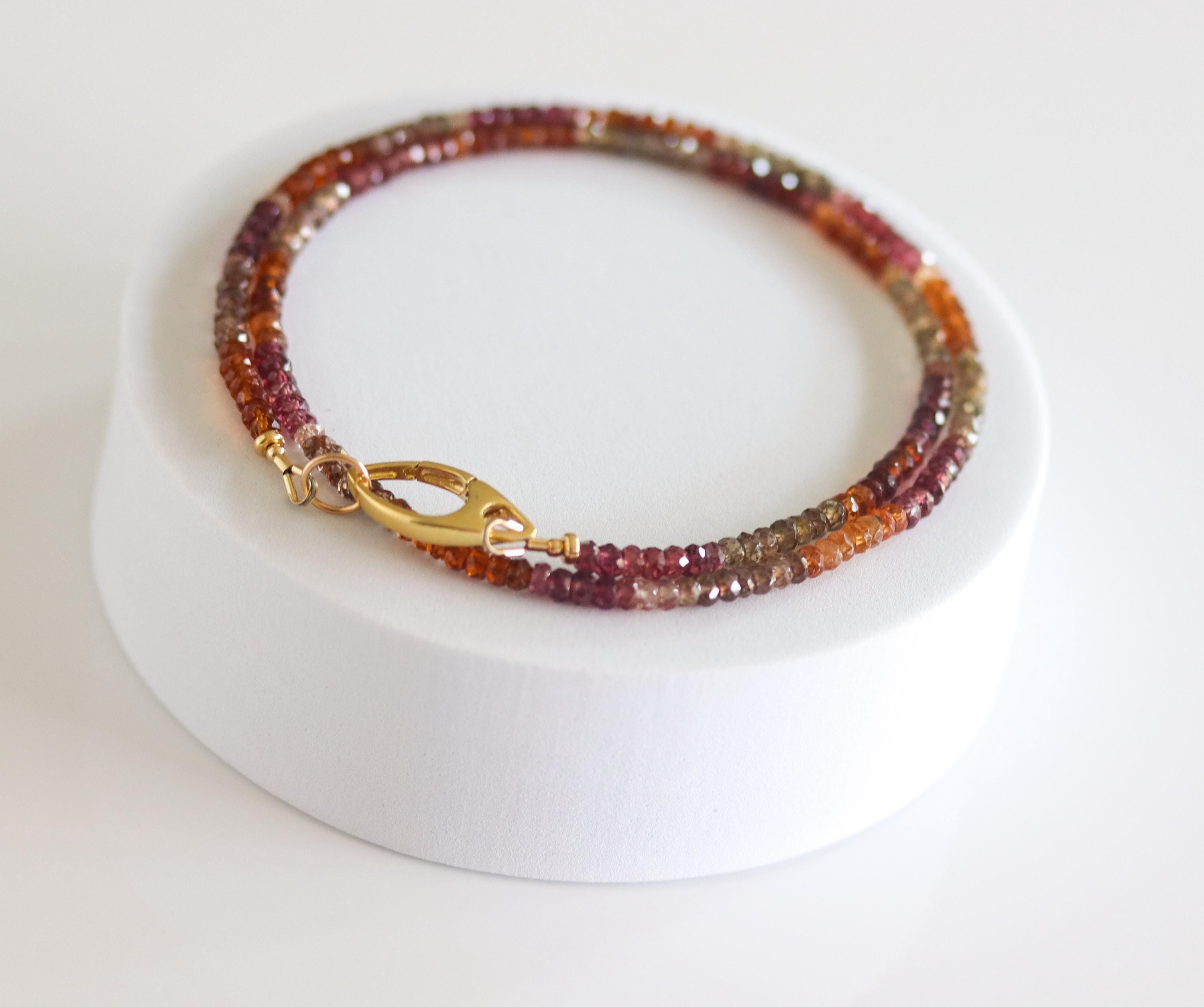 Elevate your jewelry collection with this handcrafted garnet charm holder necklace, made from genuine micro-faceted garnet gemstones that shimmer in deep shades of red, brown, and amber. Each tiny 3mm stone is carefully strung by hand and finished with 14k gold-filled findings and a statement 18k gold vermeil clasp designed to hold interchangeable charms.