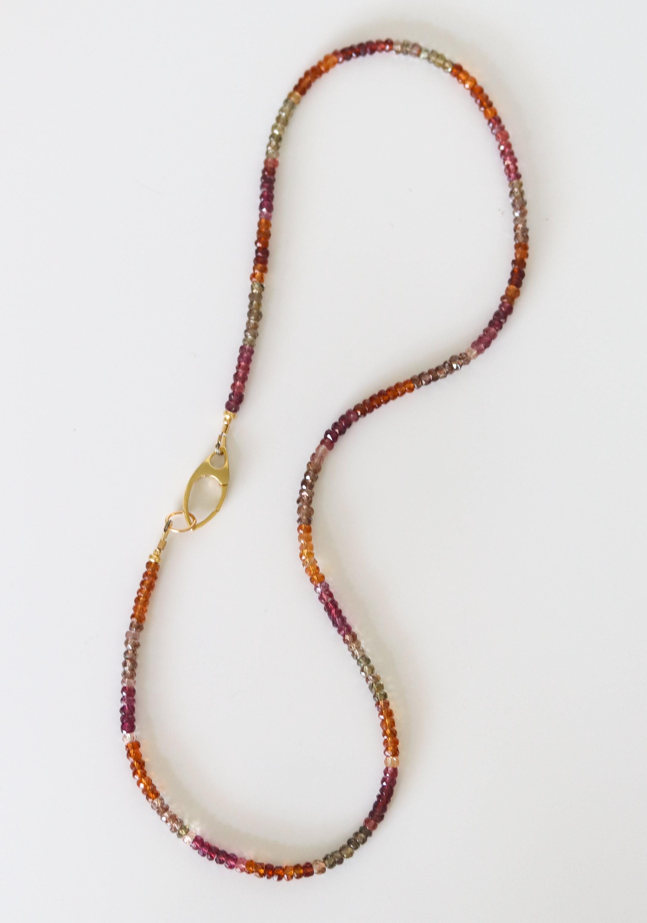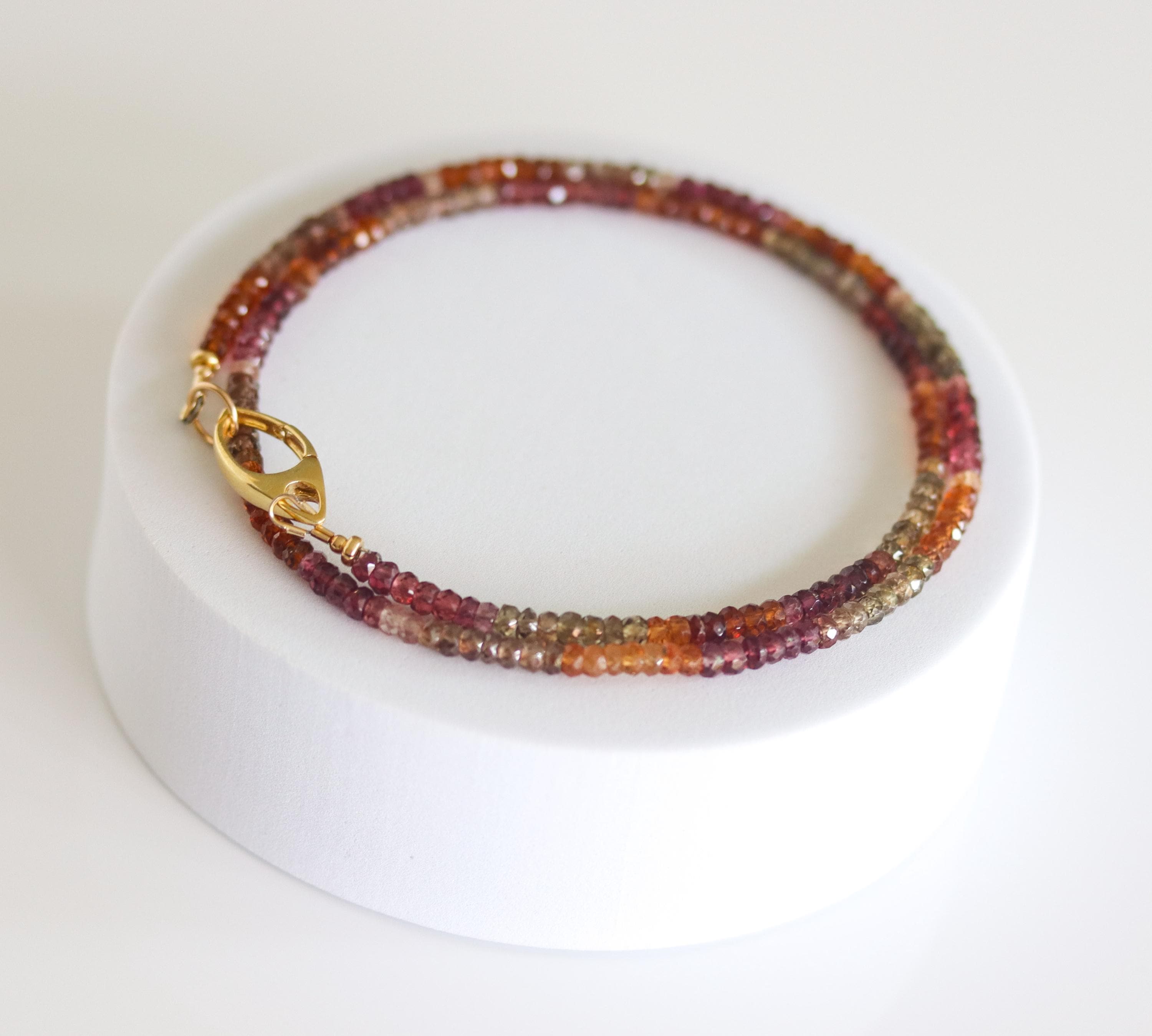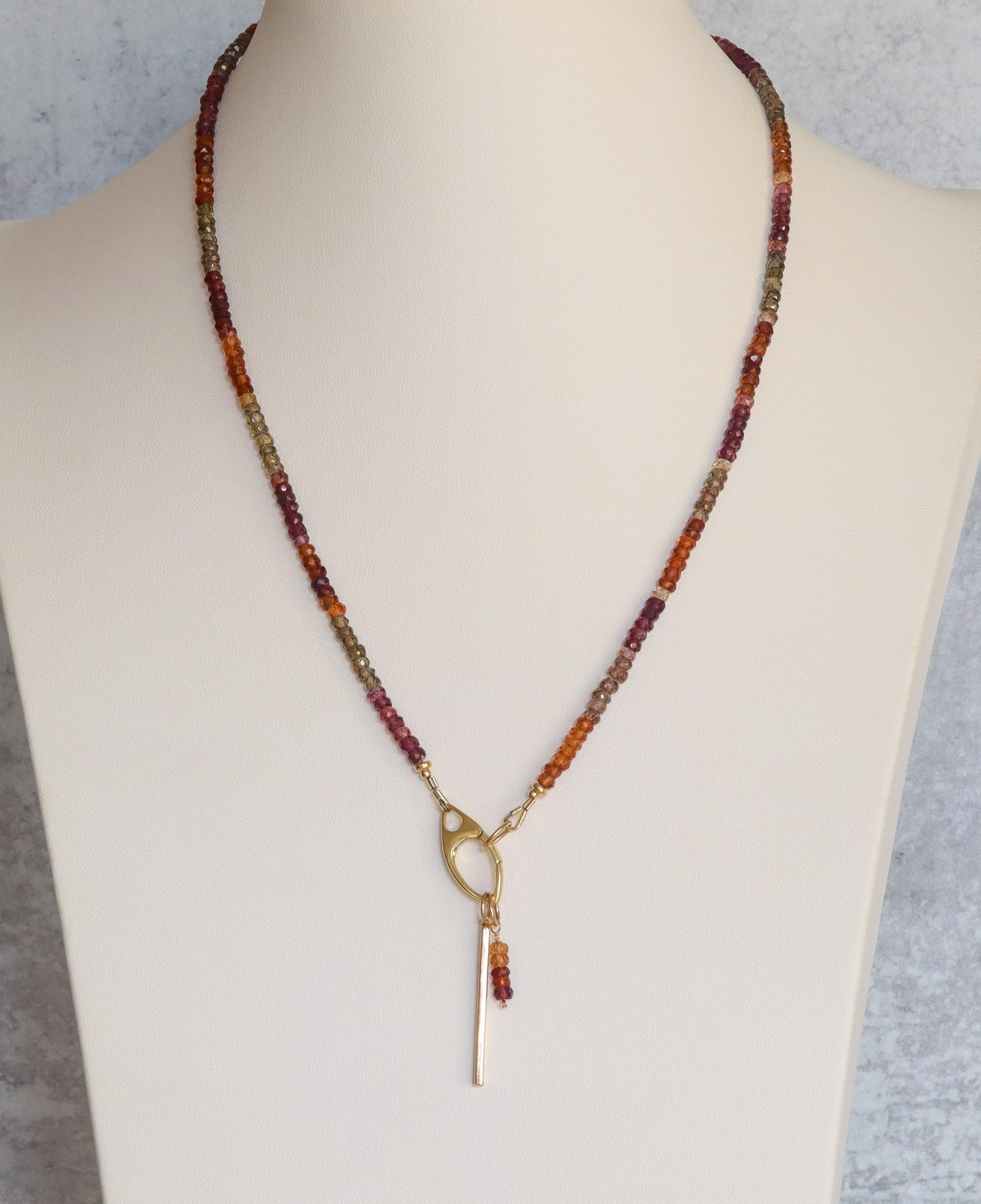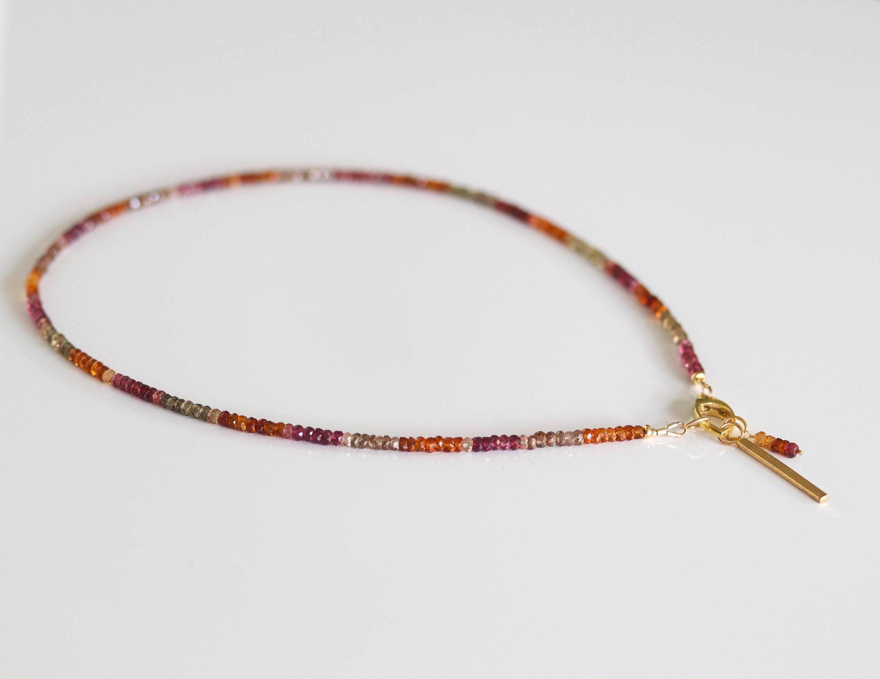 Elevate your jewelry collection with this handcrafted garnet charm holder necklace, made from genuine micro-faceted garnet gemstones that shimmer in deep shades of red, brown, and amber. Each tiny 3mm stone is carefully strung by hand and finished with 14k gold-filled findings and a statement 18k gold vermeil clasp designed to hold interchangeable charms.