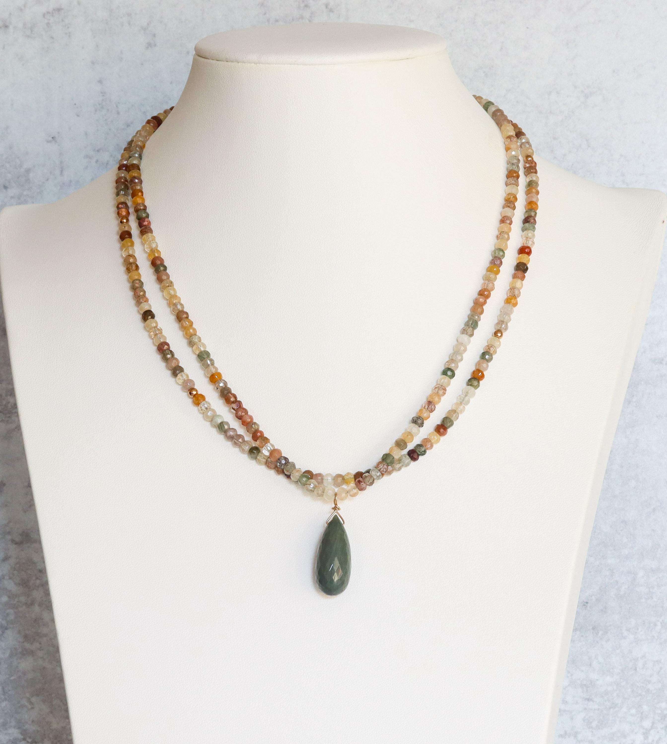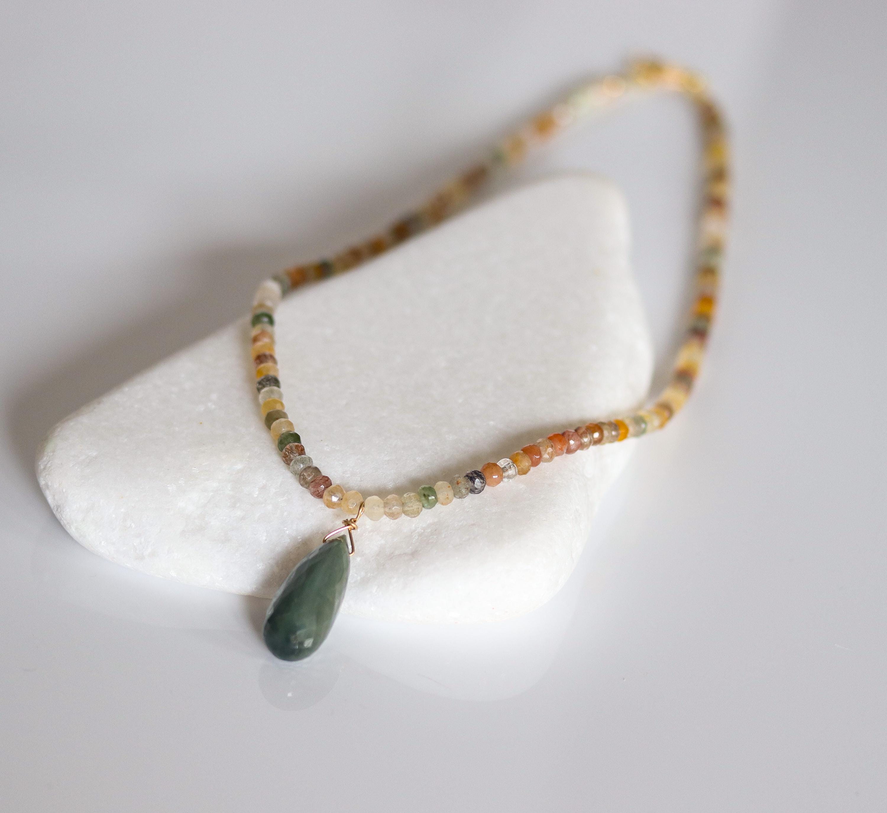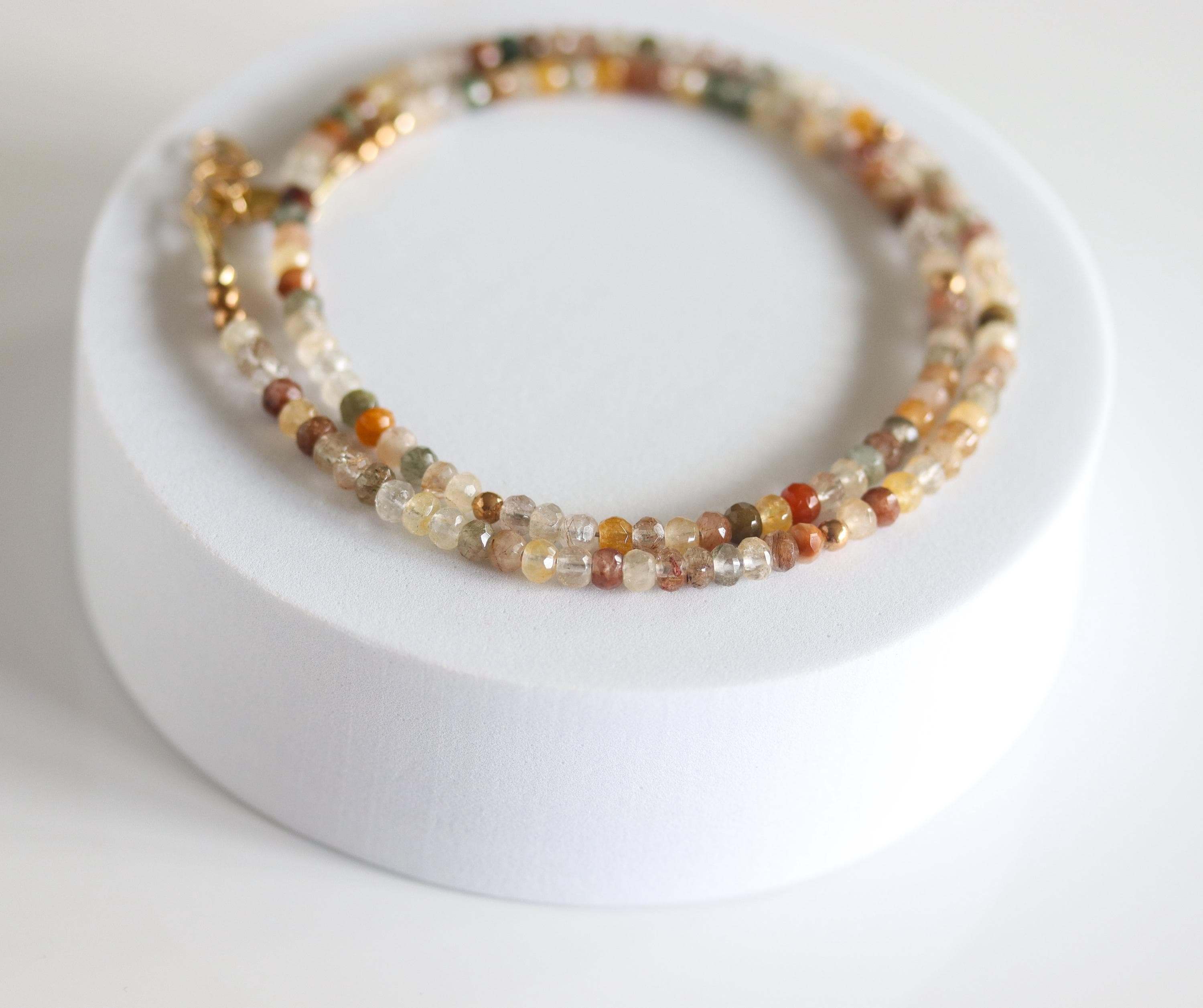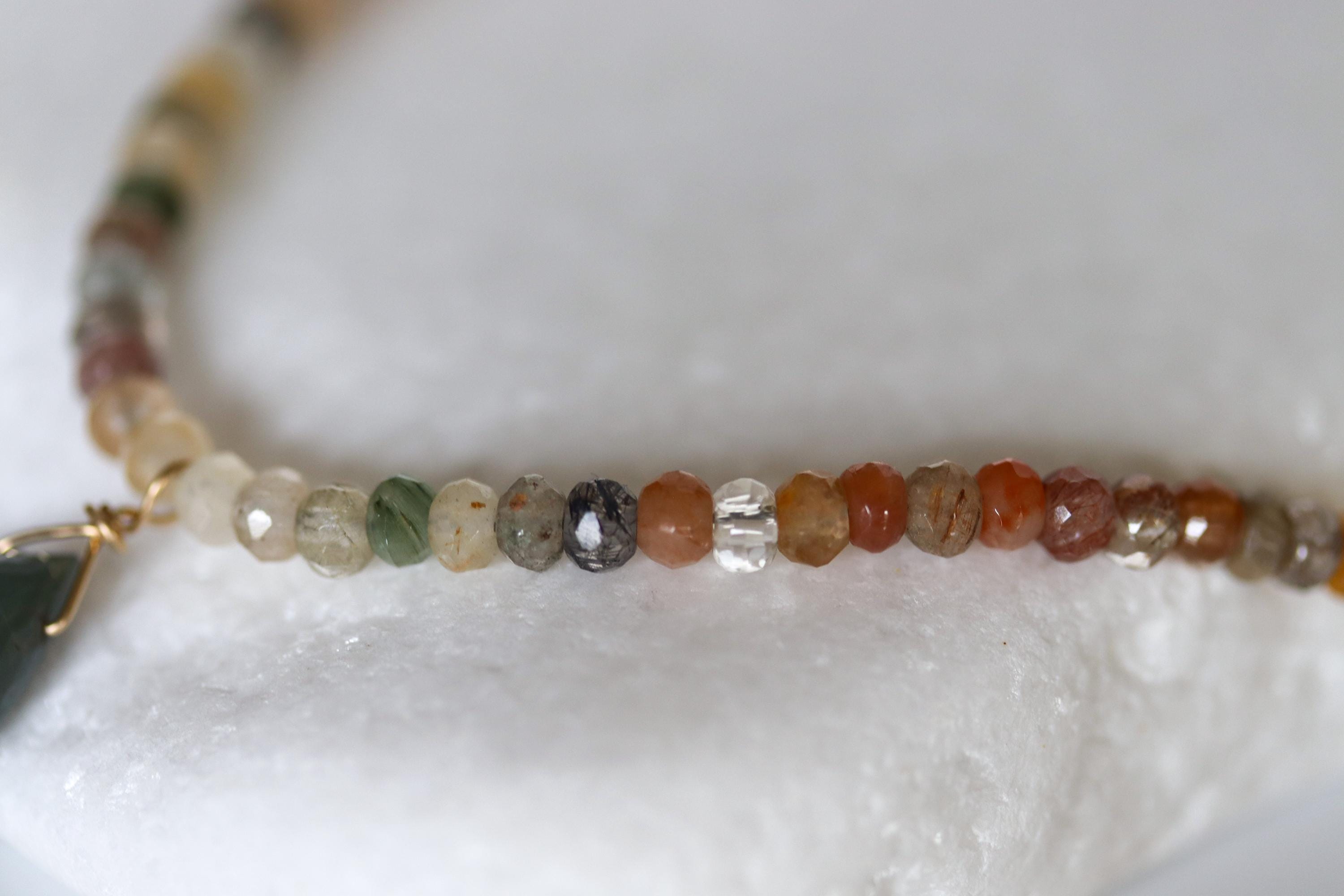 Each necklace is hand-crafted with micro-faceted rutilated quartz in beautiful shades of mossy green, peach, light yellow, bronze, clear + golden rutile inclusions. These colors create a warm, grounded palette perfect for autumn and year-round styling.
