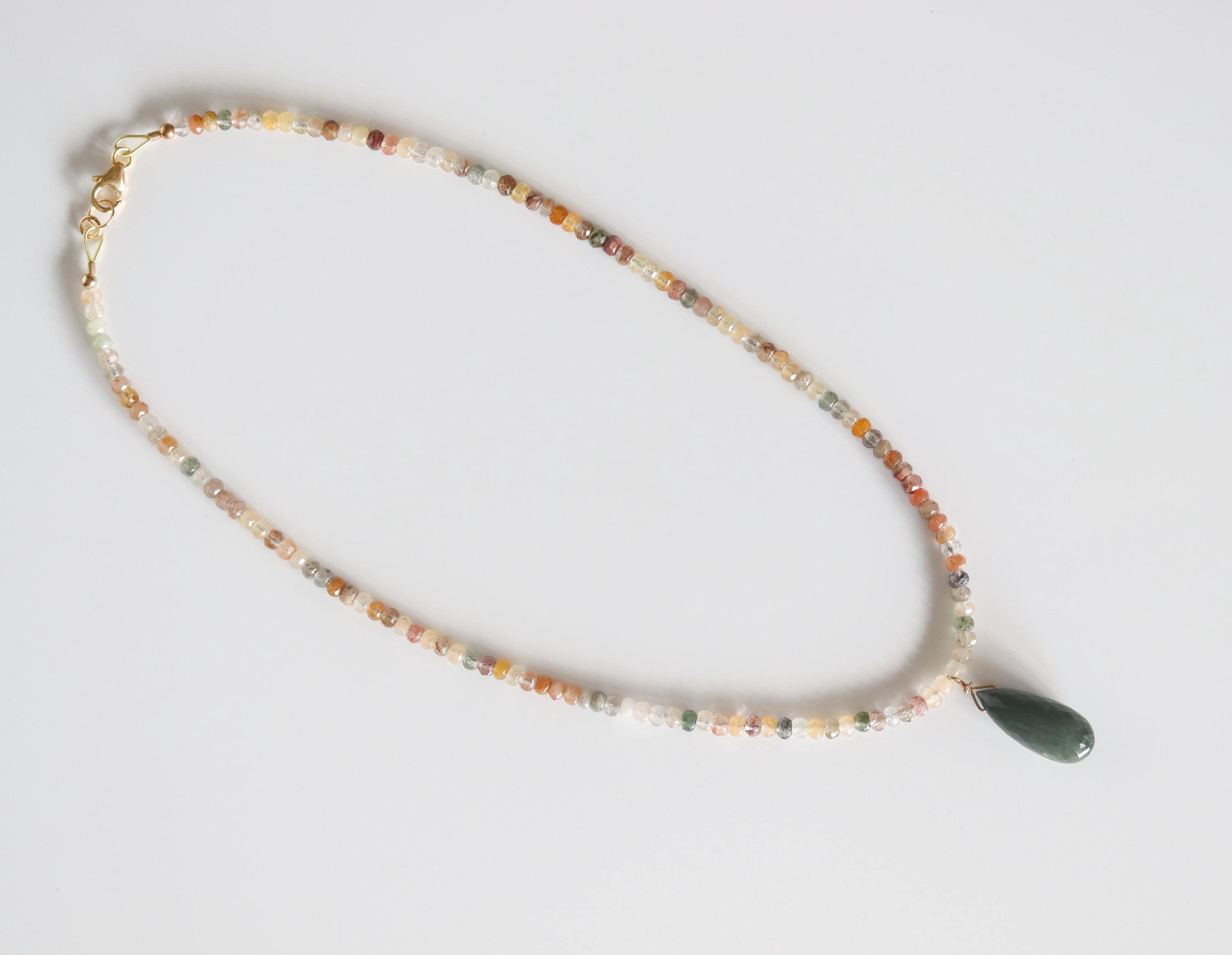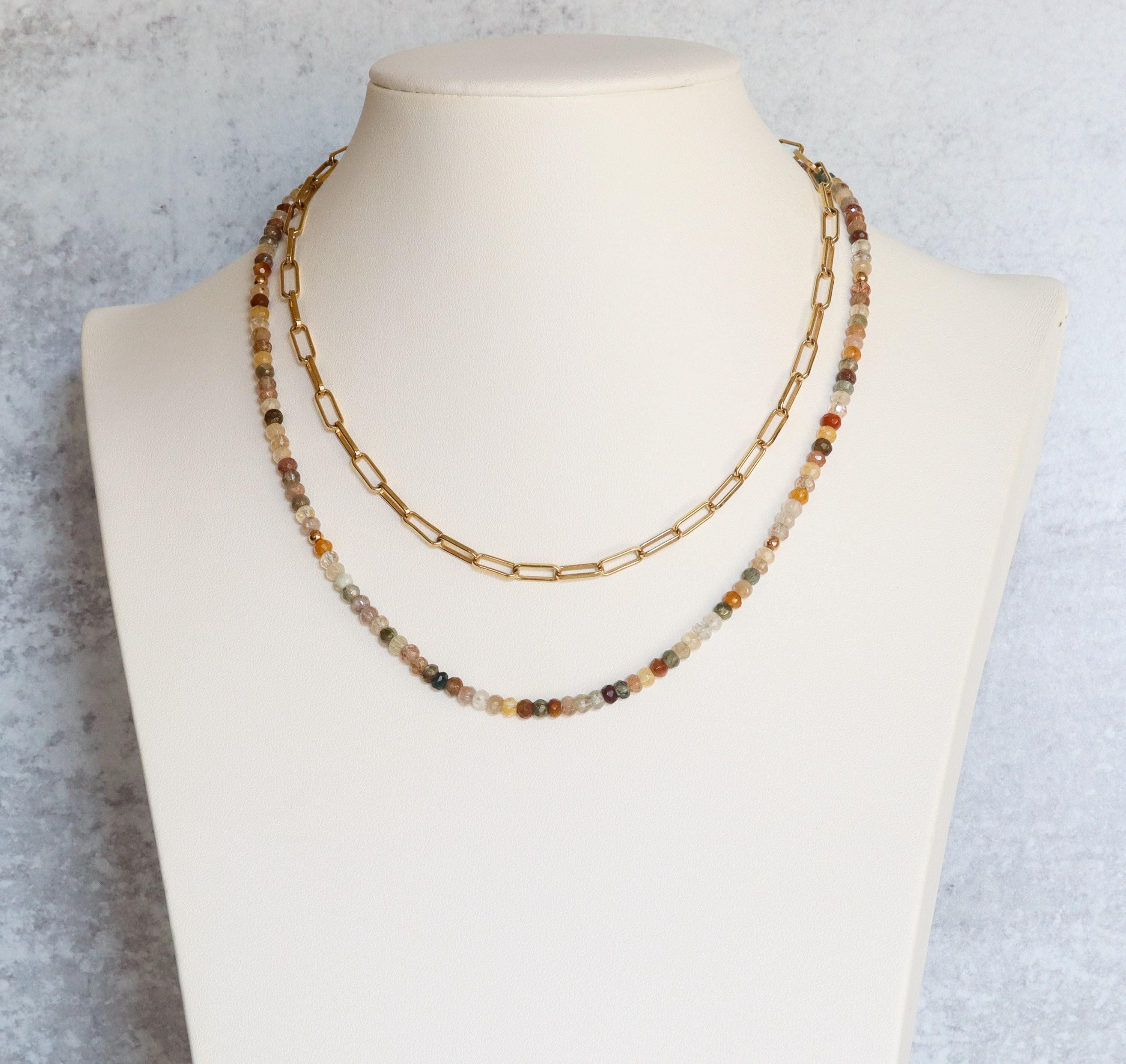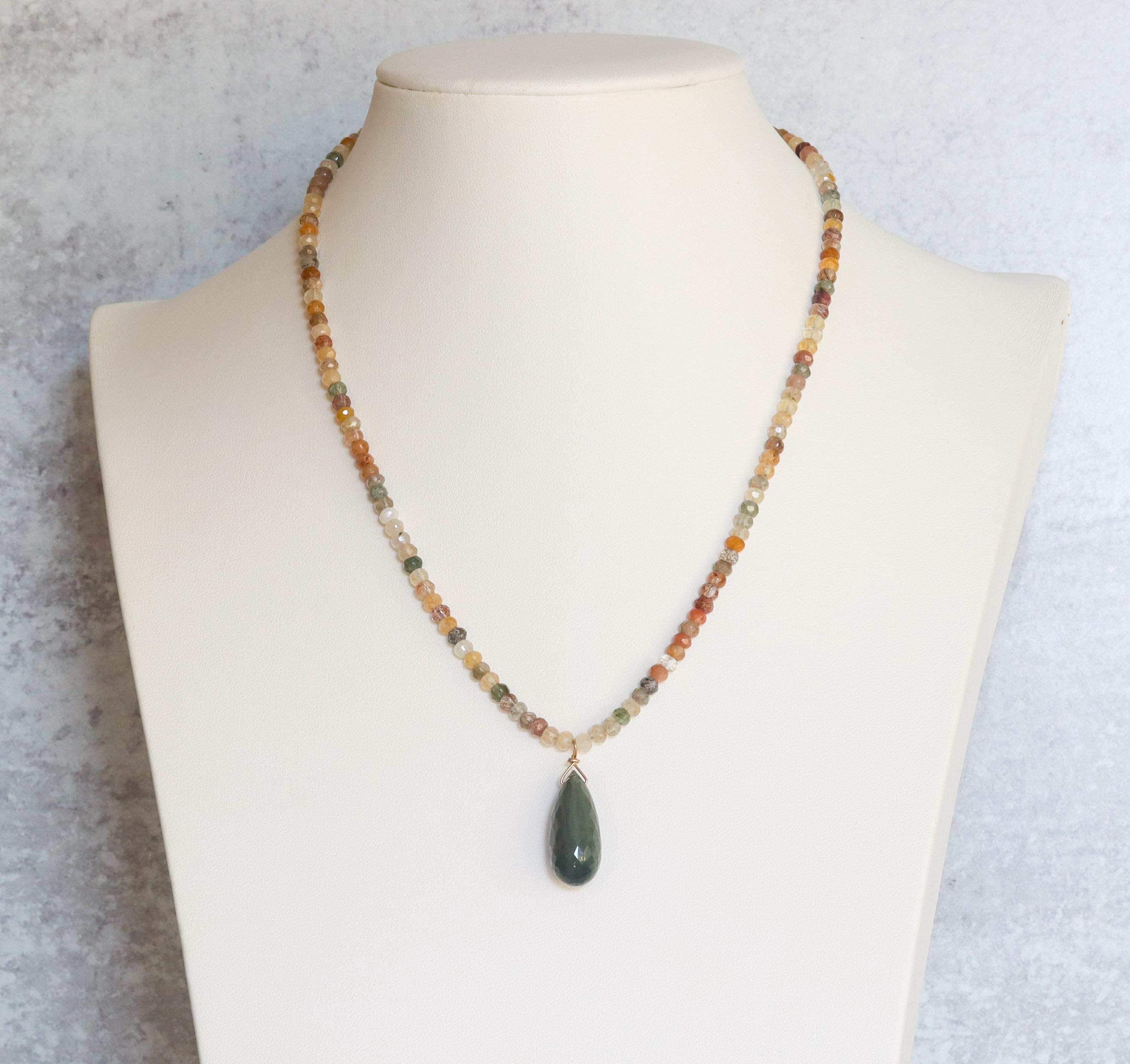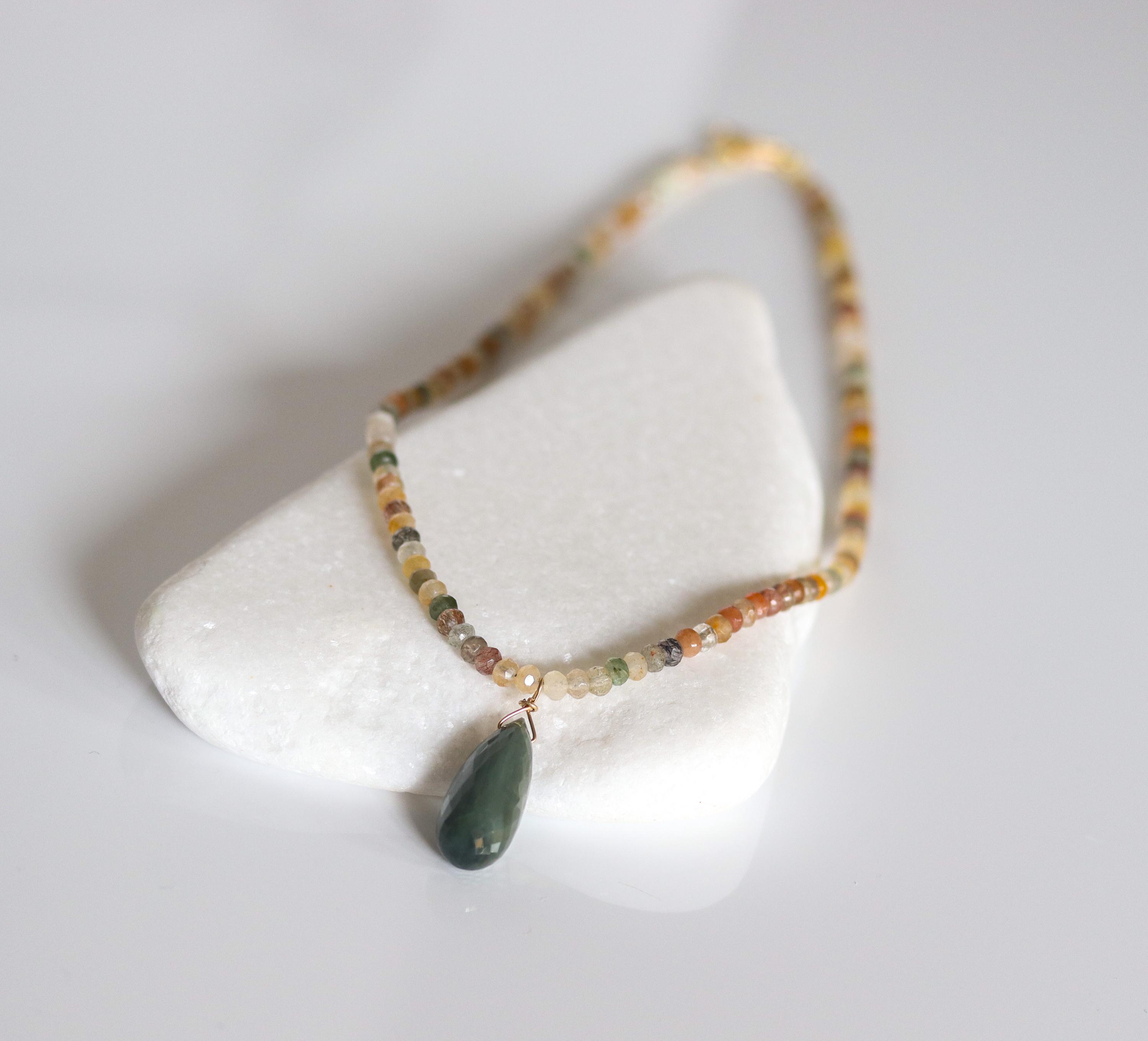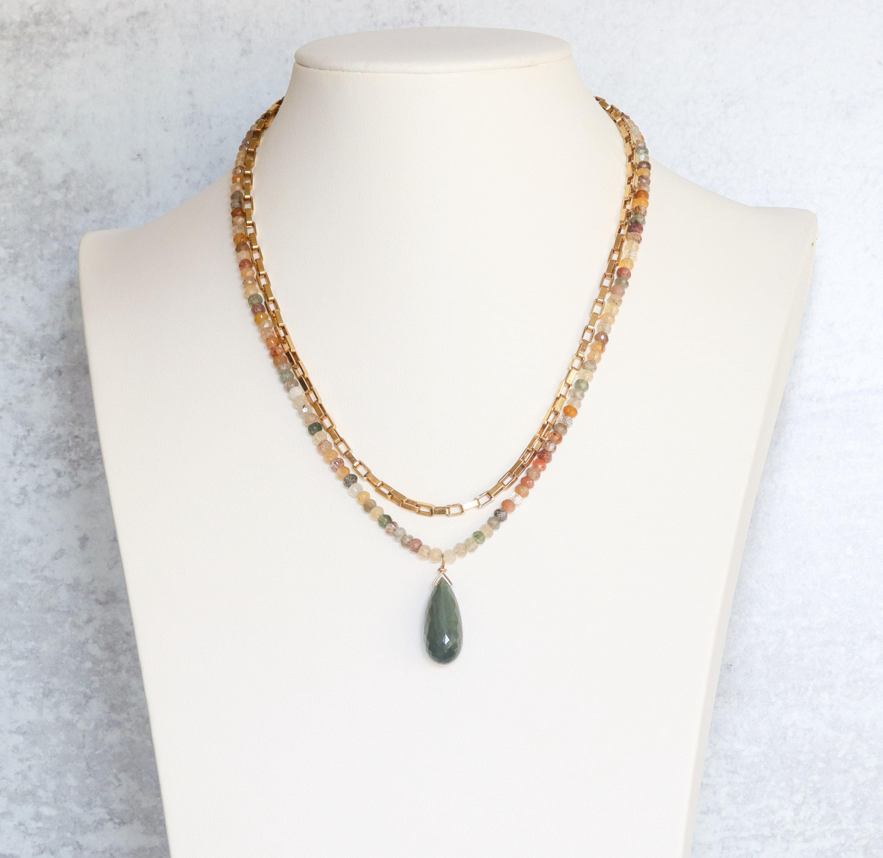 Each necklace is hand-crafted with micro-faceted rutilated quartz in beautiful shades of mossy green, peach, light yellow, bronze, clear + golden rutile inclusions. These colors create a warm, grounded palette perfect for autumn and year-round styling.