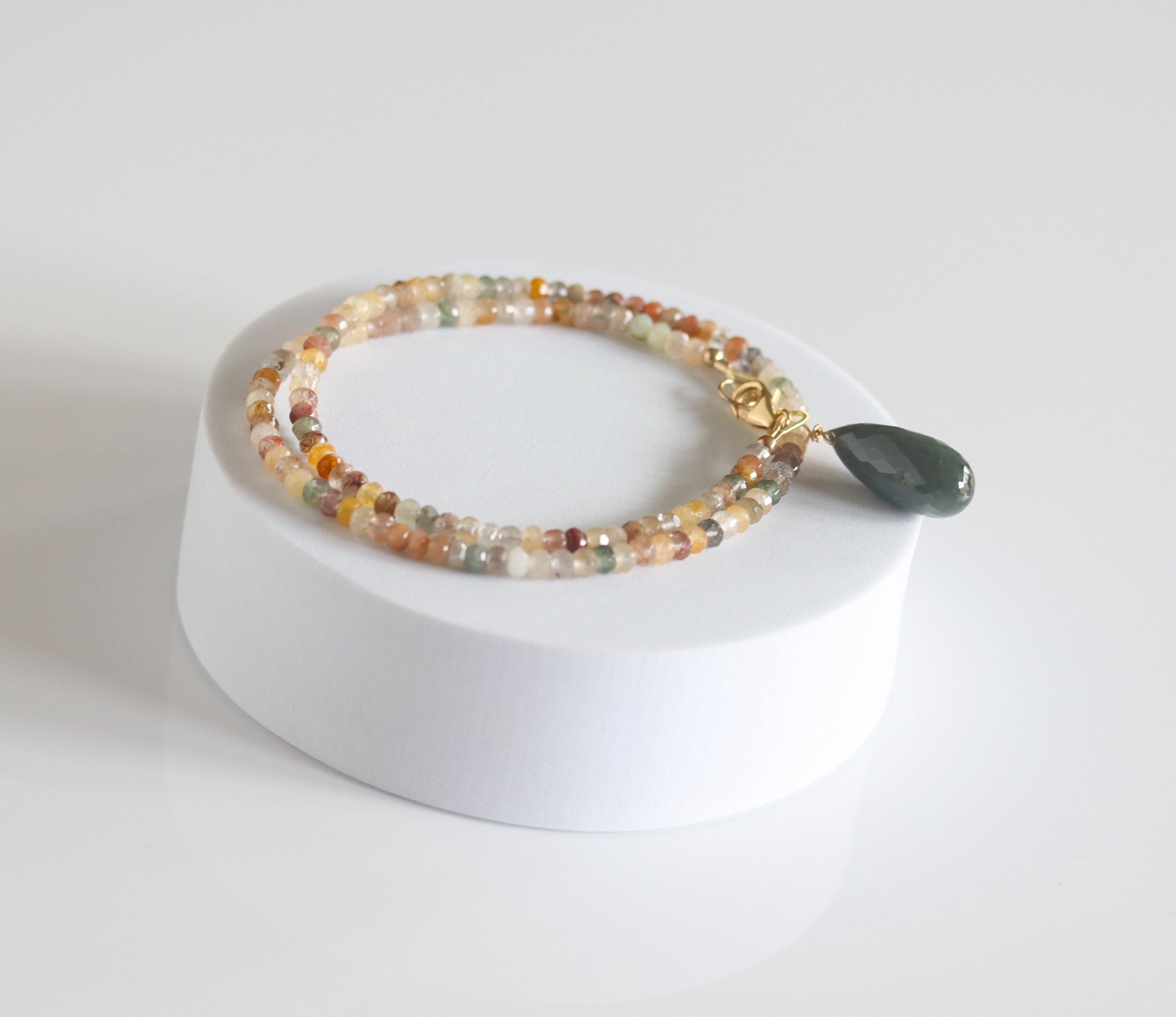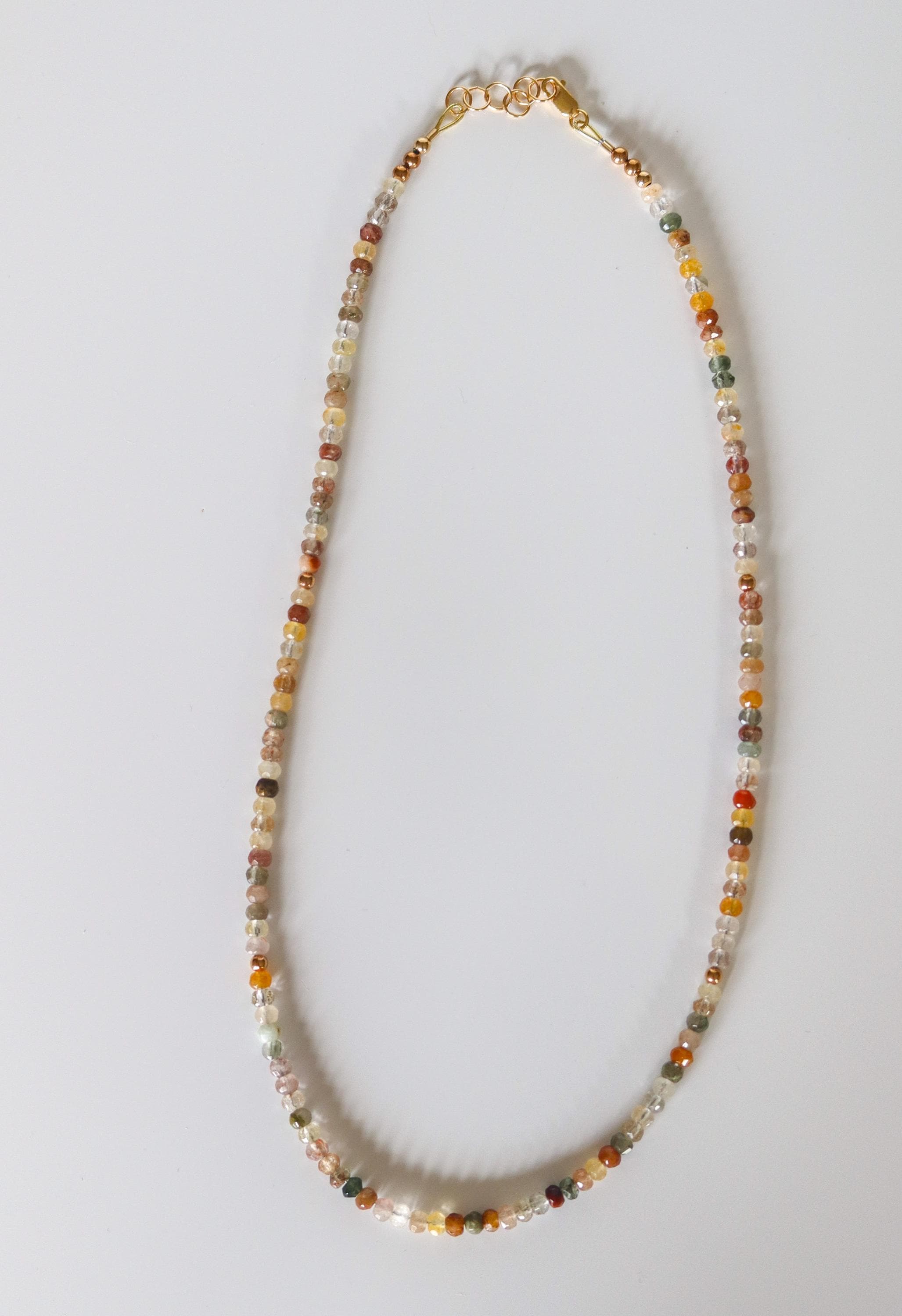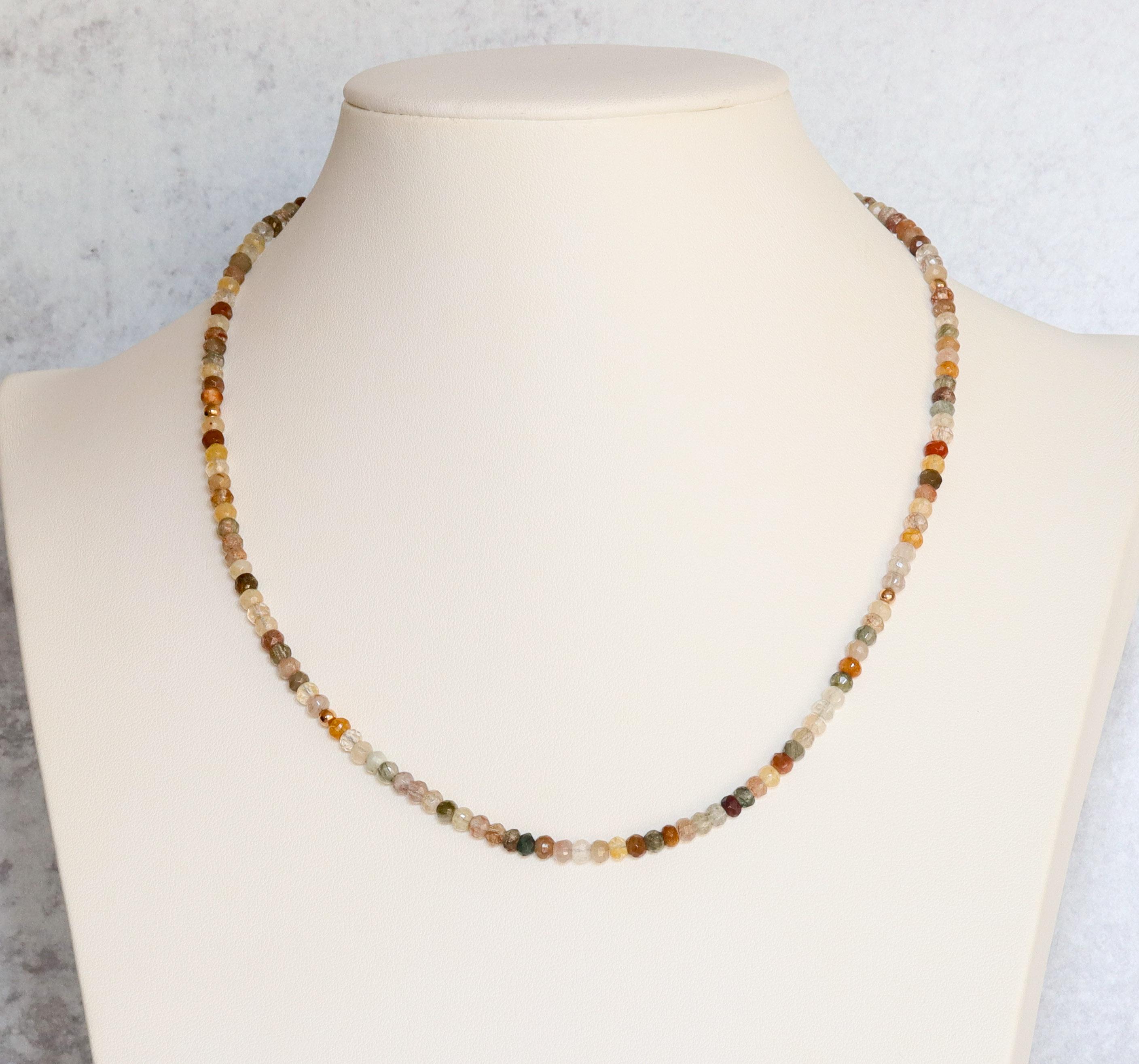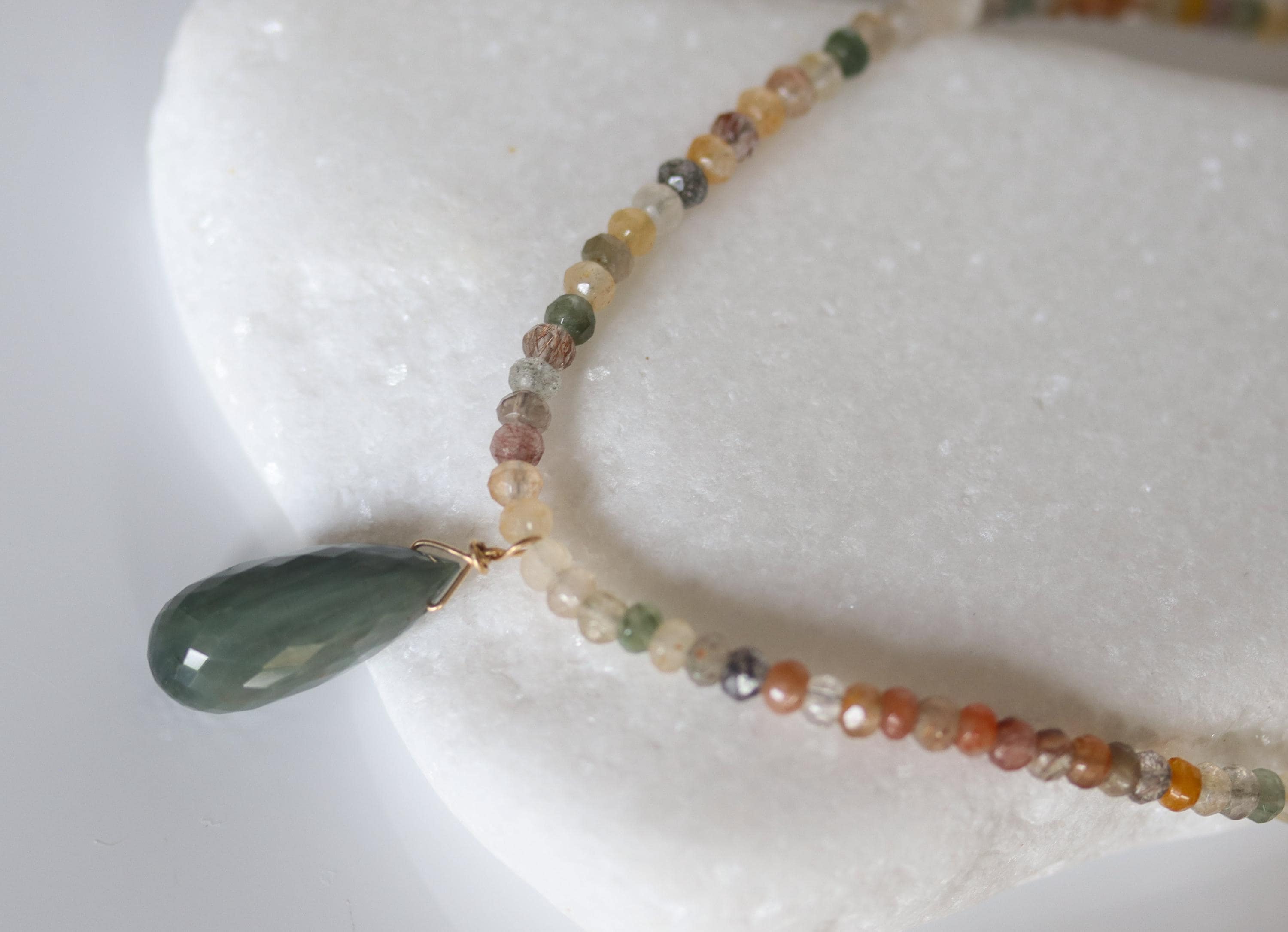 Each necklace is hand-crafted with micro-faceted rutilated quartz in beautiful shades of mossy green, peach, light yellow, bronze, clear + golden rutile inclusions. These colors create a warm, grounded palette perfect for autumn and year-round styling.