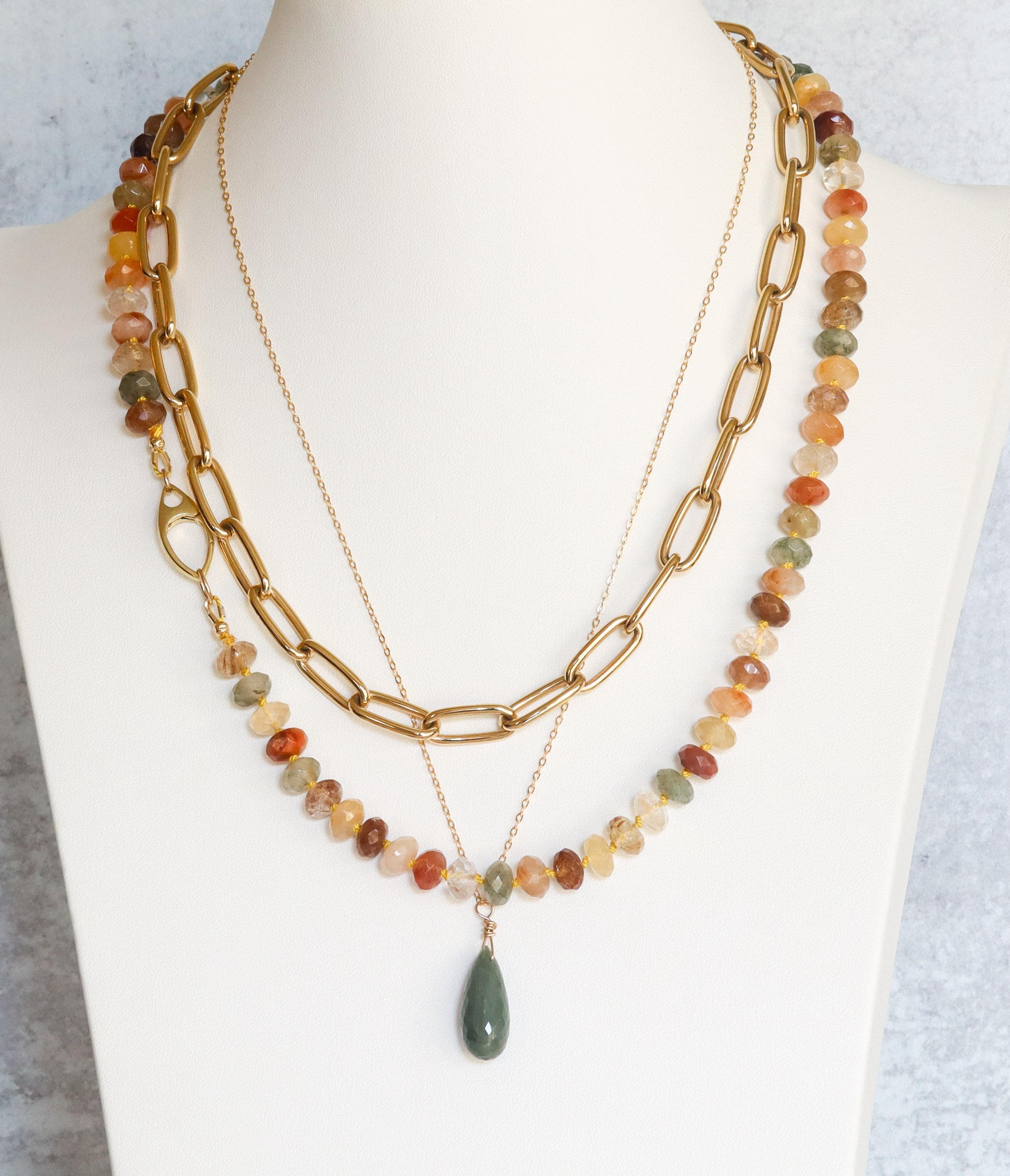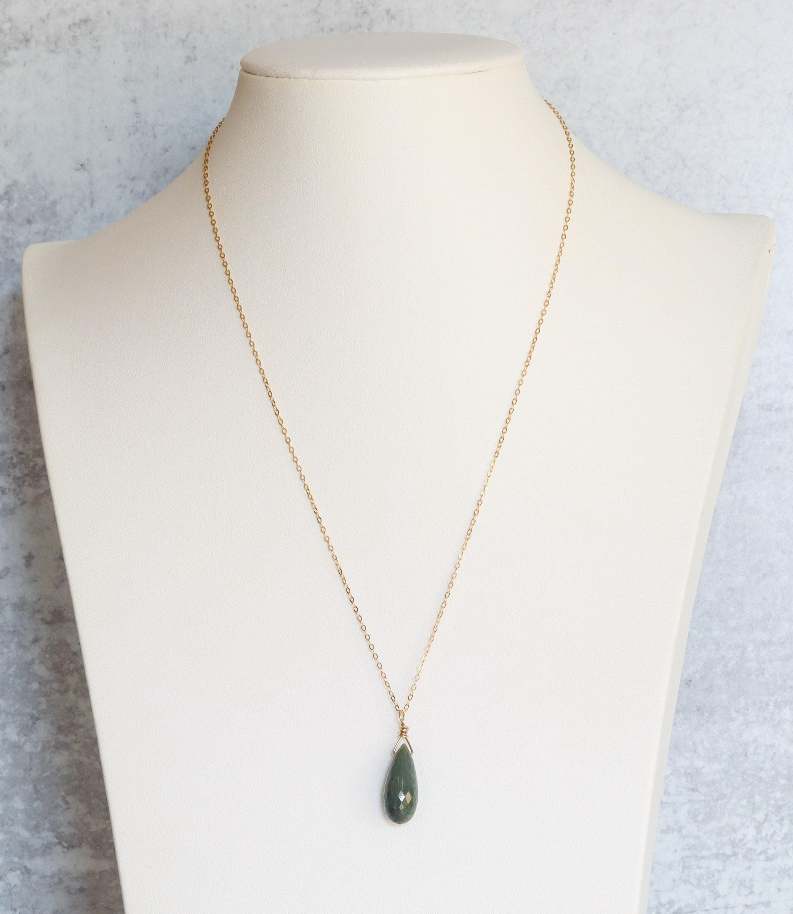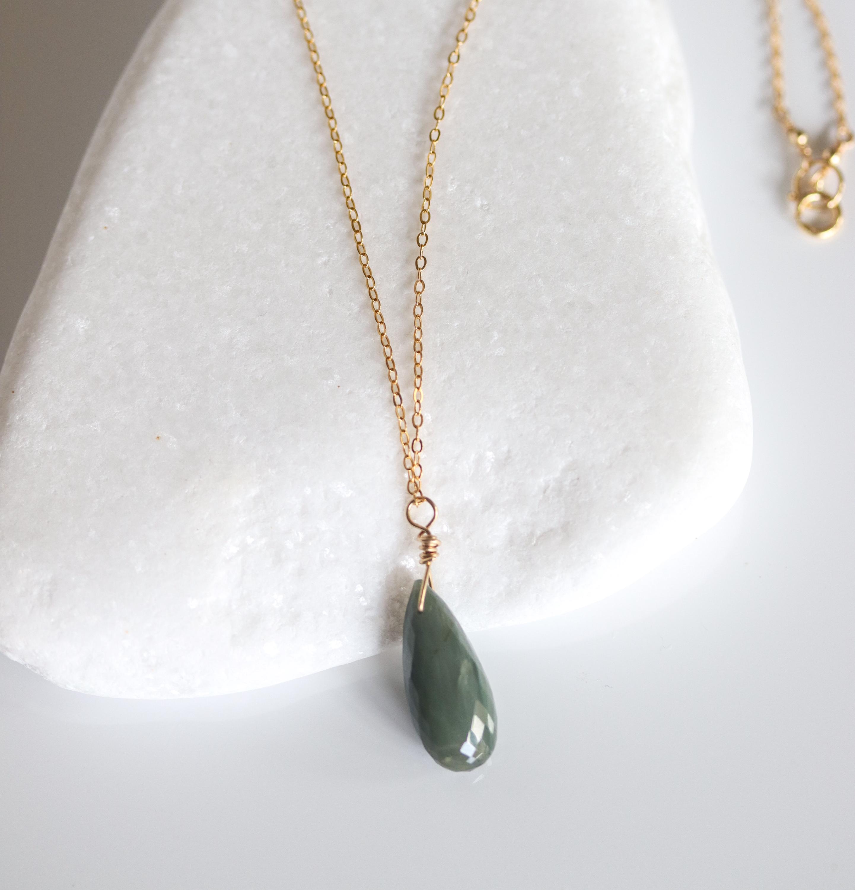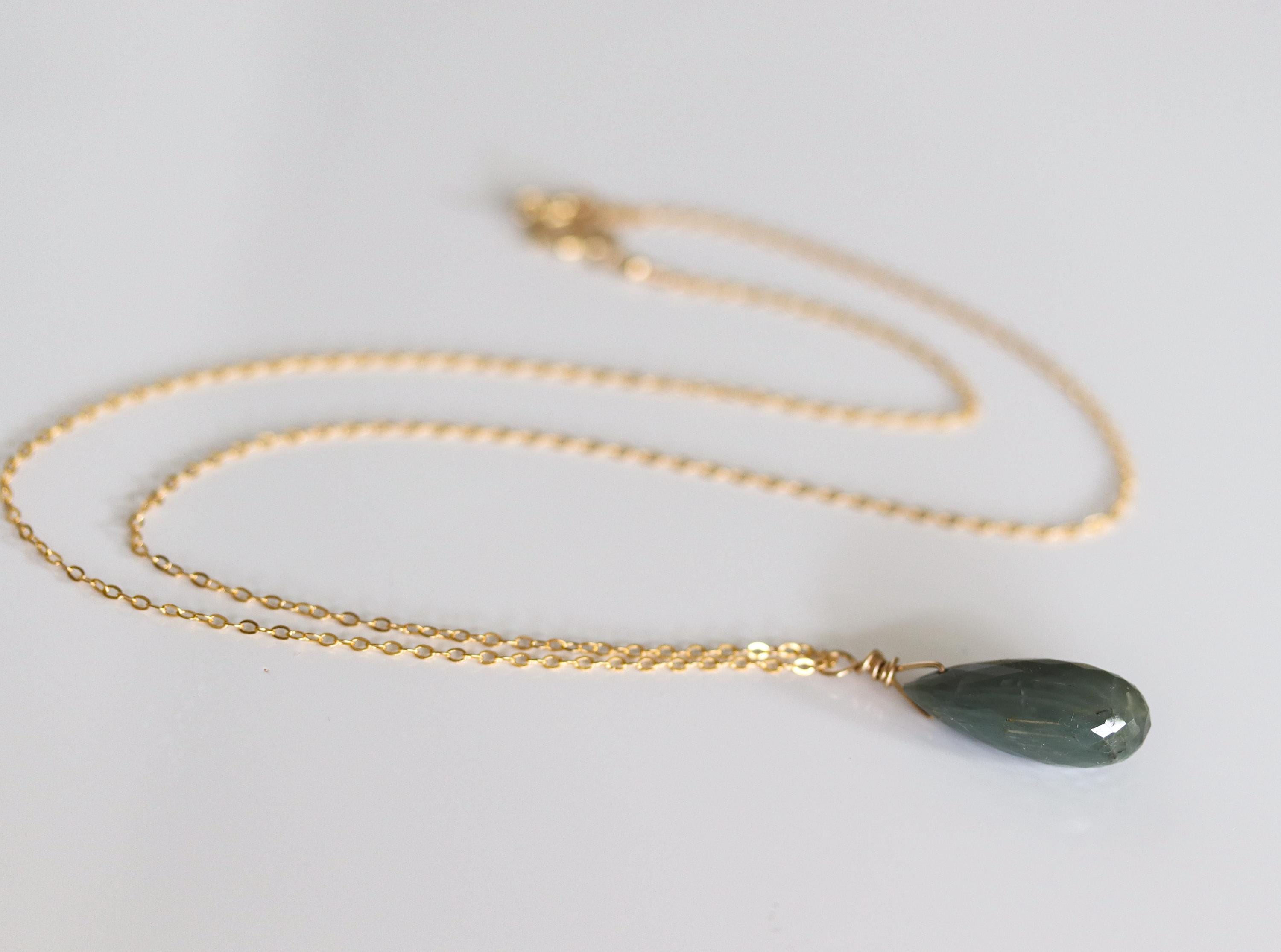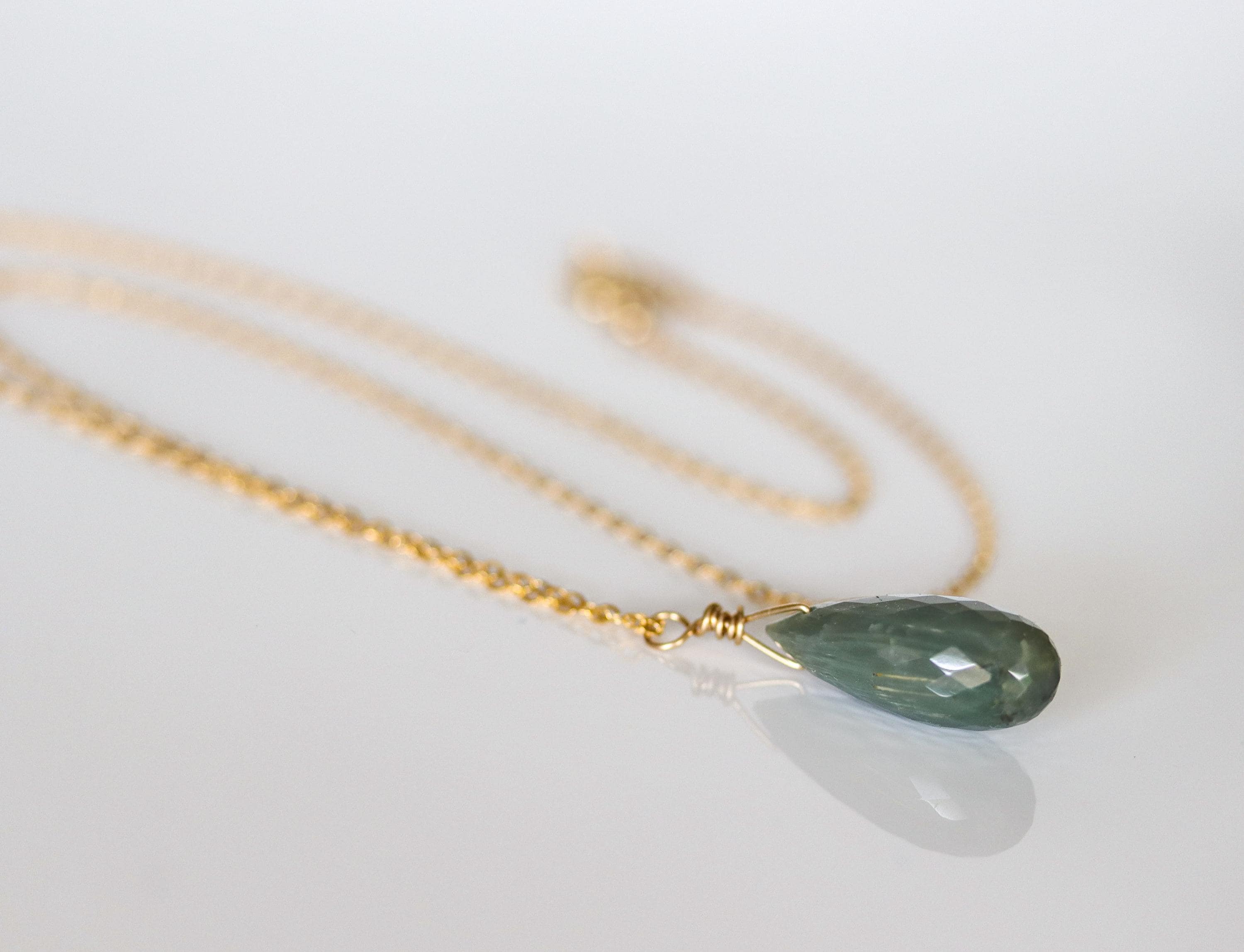 This one-of-a-kind gemstone features an enchanting green Chrysoberyl Cat’s Eye briolette that glows with a silky light band across the surface — also known as chatoyancy — a rare optical effect loved by gemstone collectors. Hand-wrapped in 14k gold filled wire and suspended from a dainty yet durable 14k gold filled cable chain, it’s a timeless piece that layers beautifully or shines solo.
