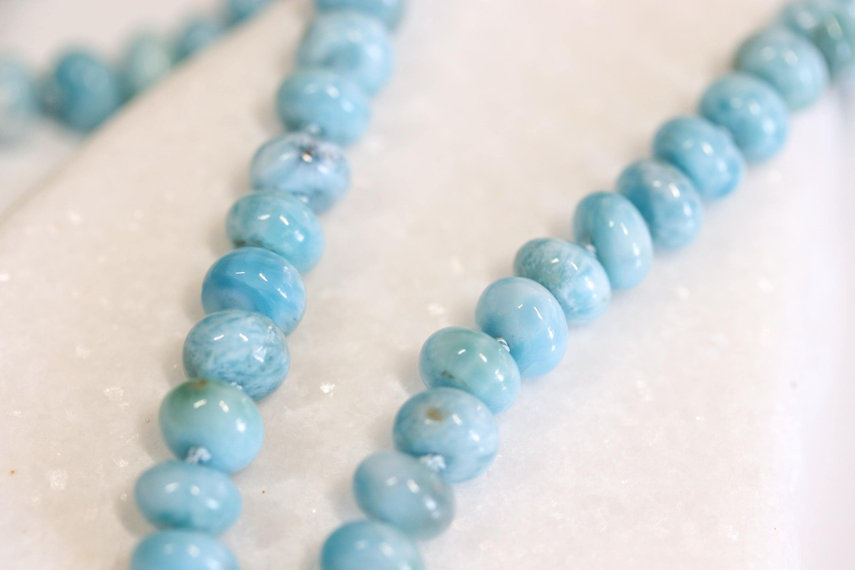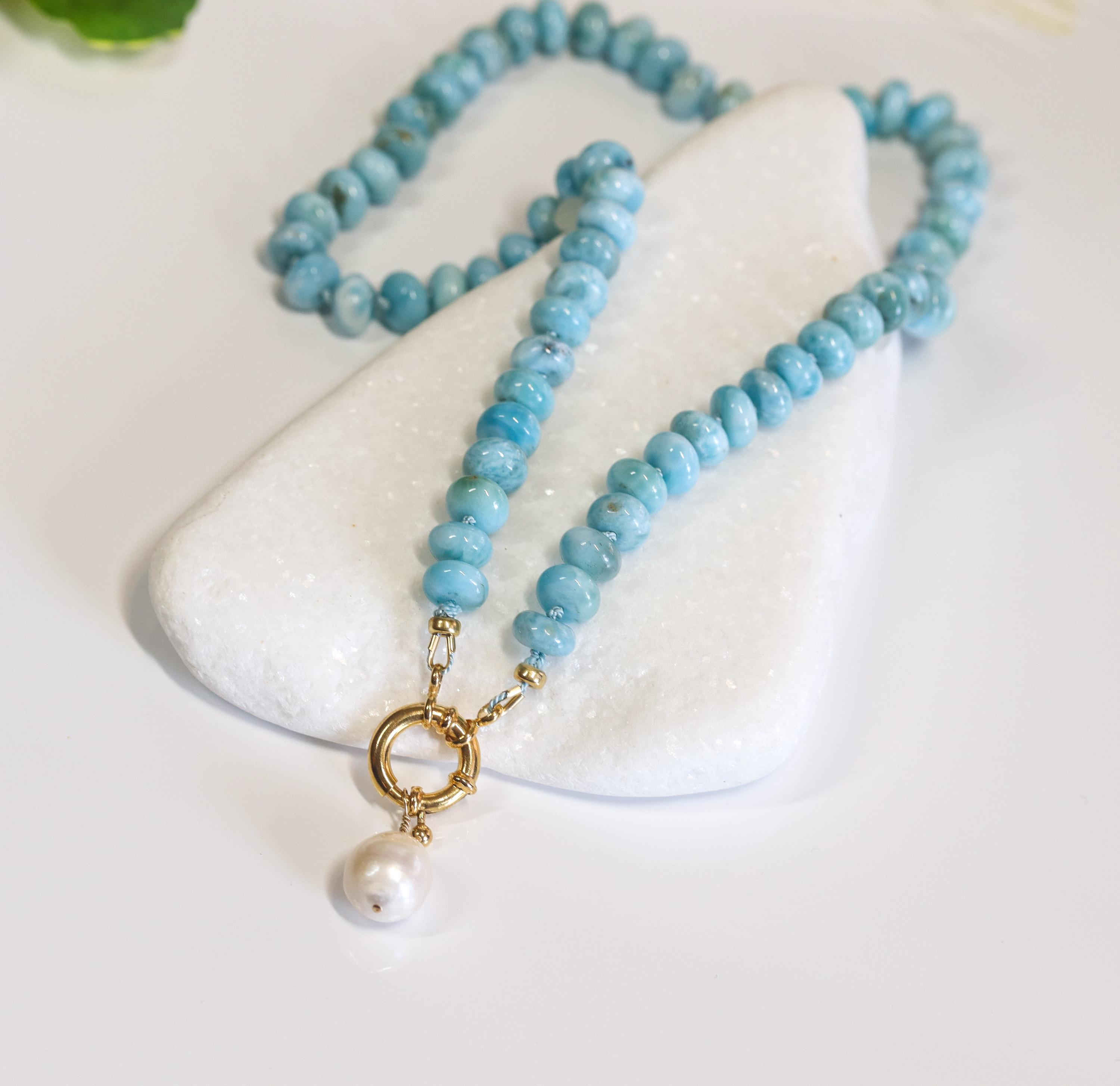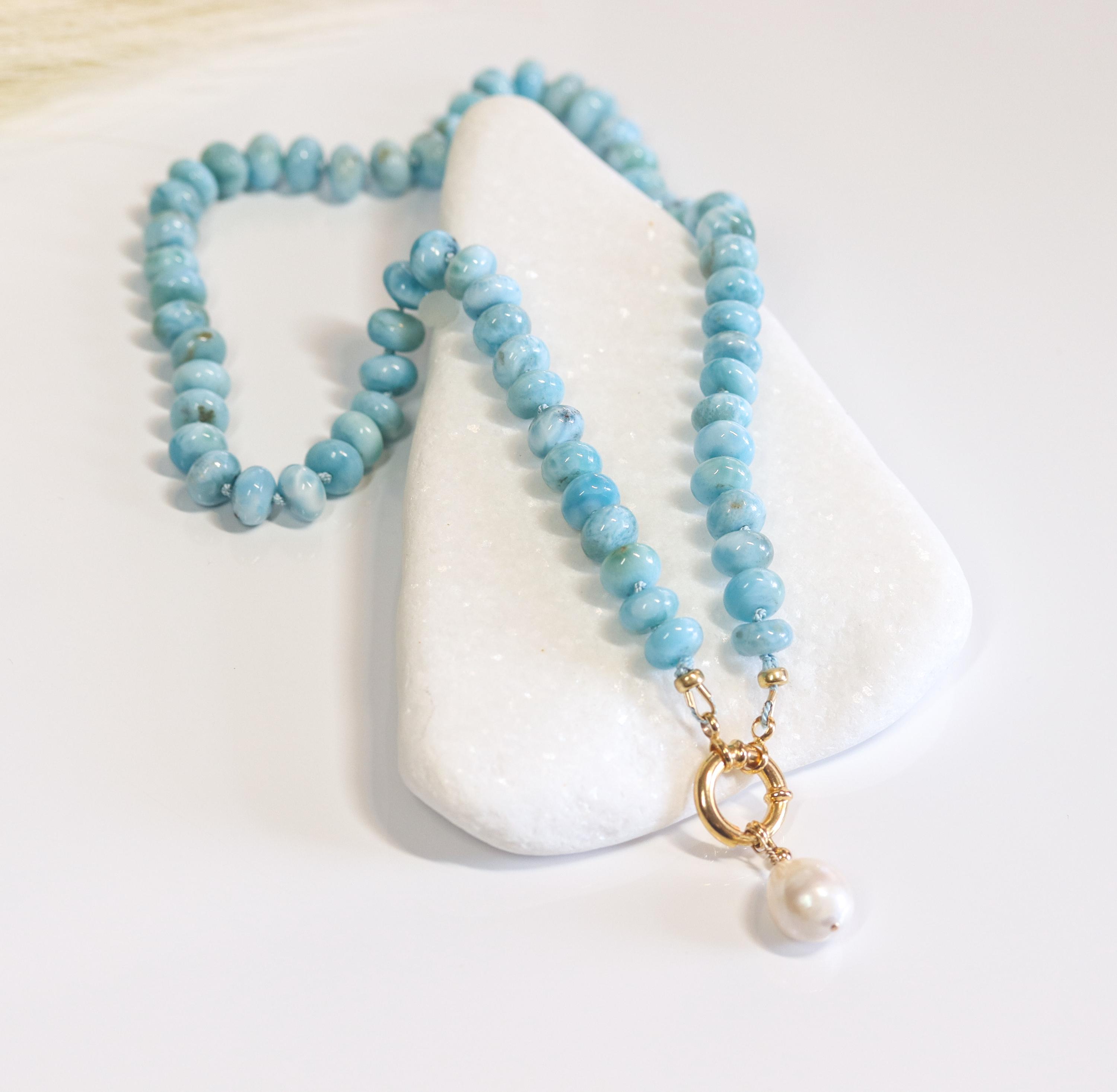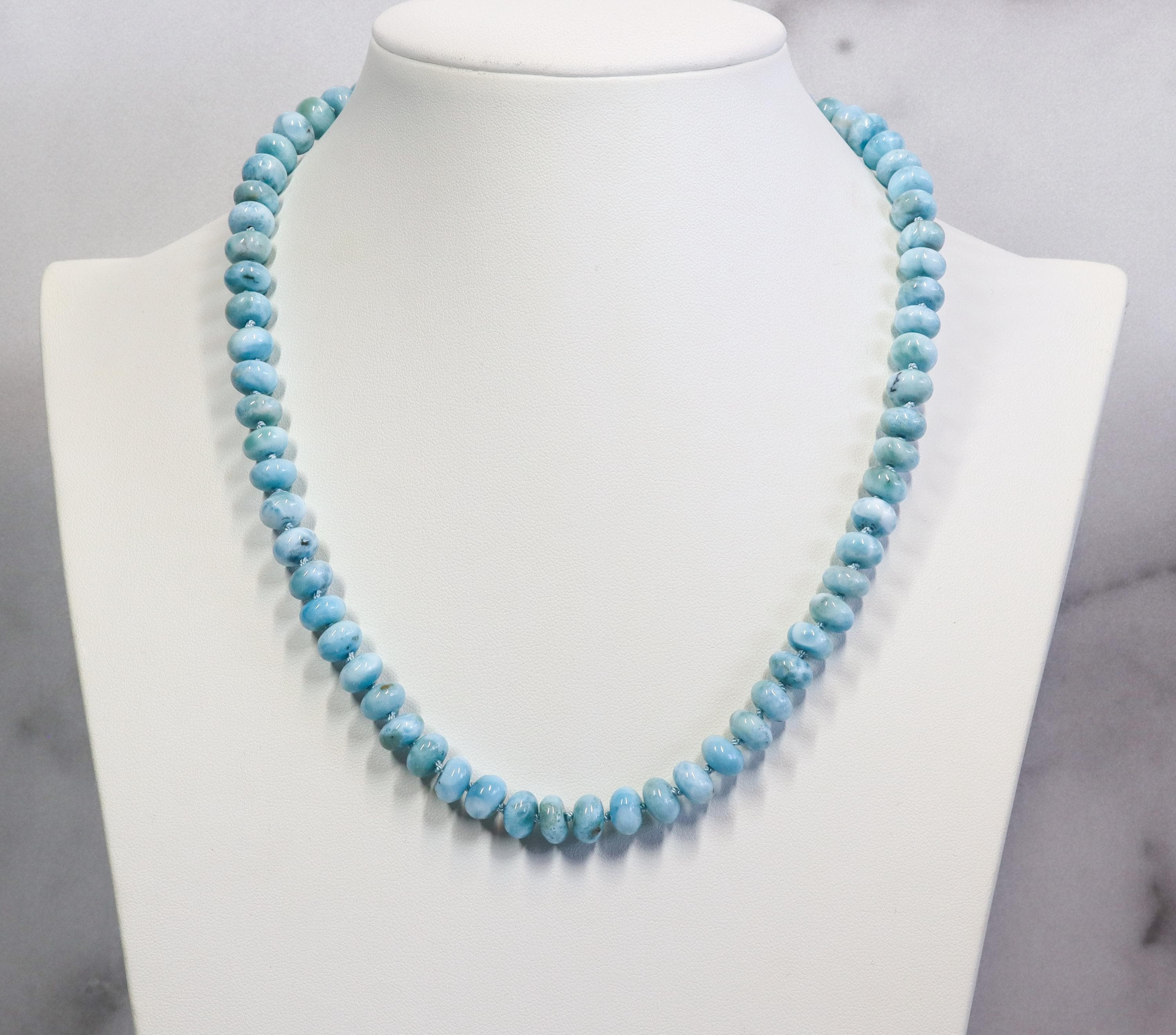 This stunning necklace features exquisite AAA Larimar rondelles (8mm)—sky-blue stones with natural marbling and a glossy, polished finish. Each bead is hand-knotted on blue silk, giving the strand a soft drape and a refined, heirloom feel.