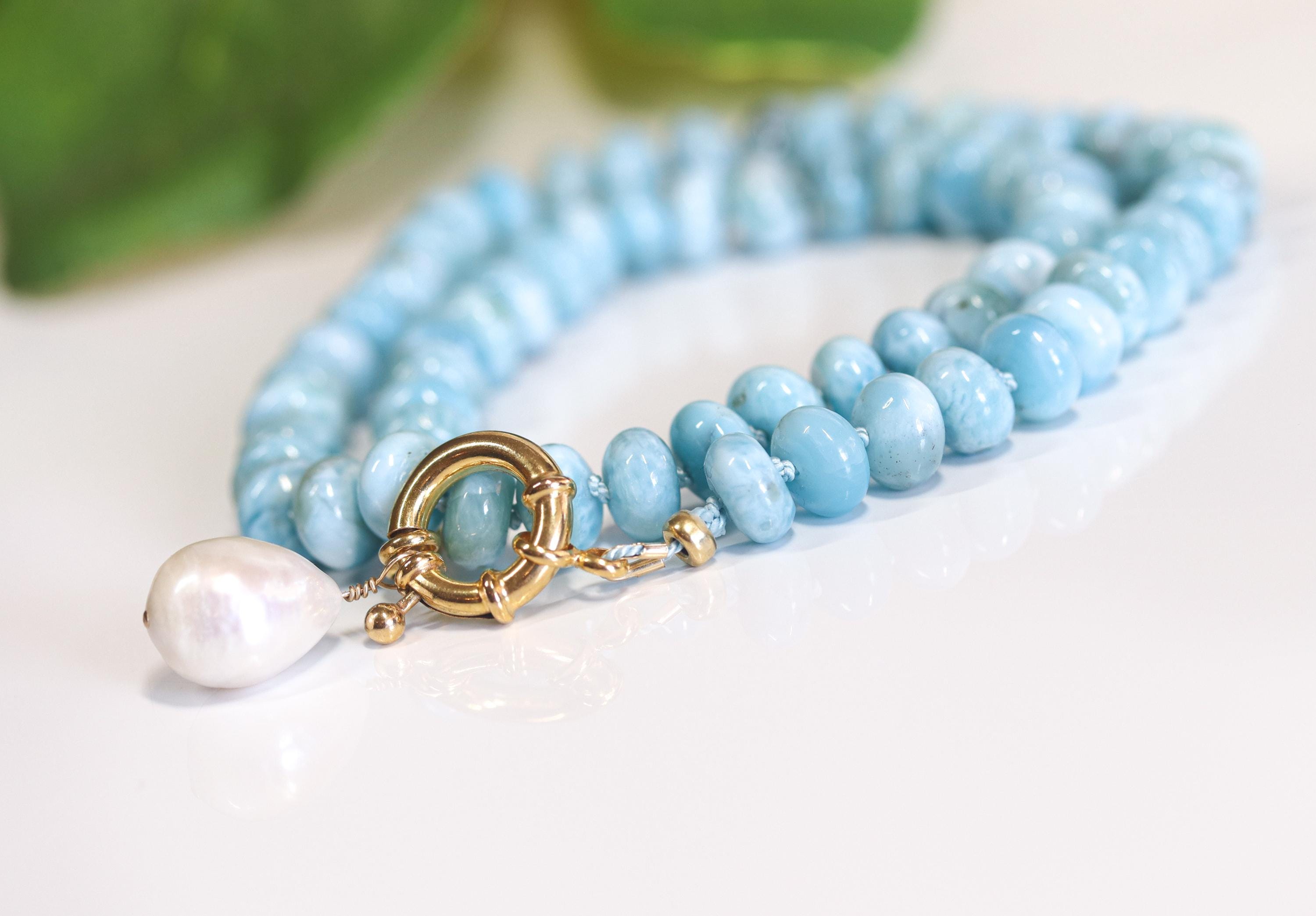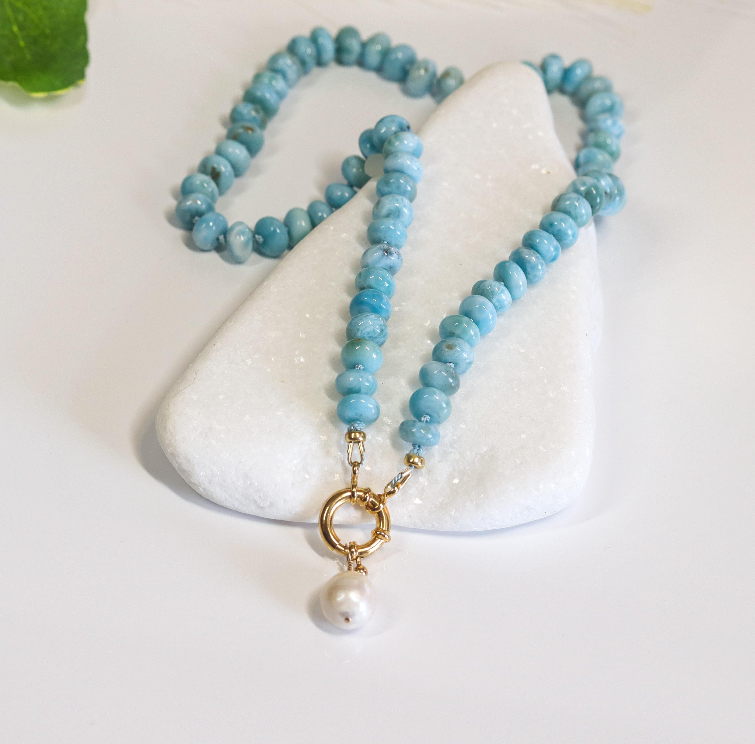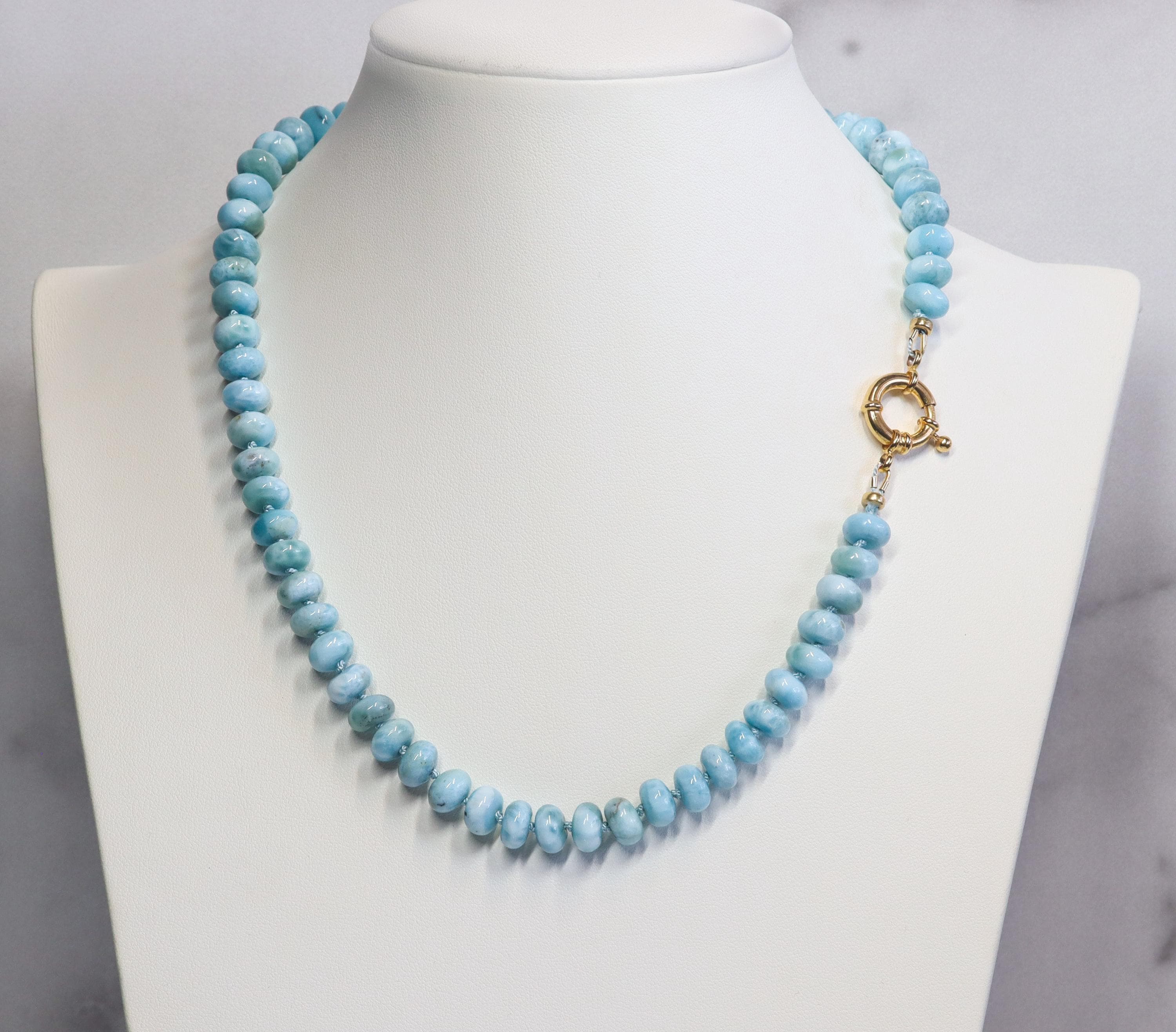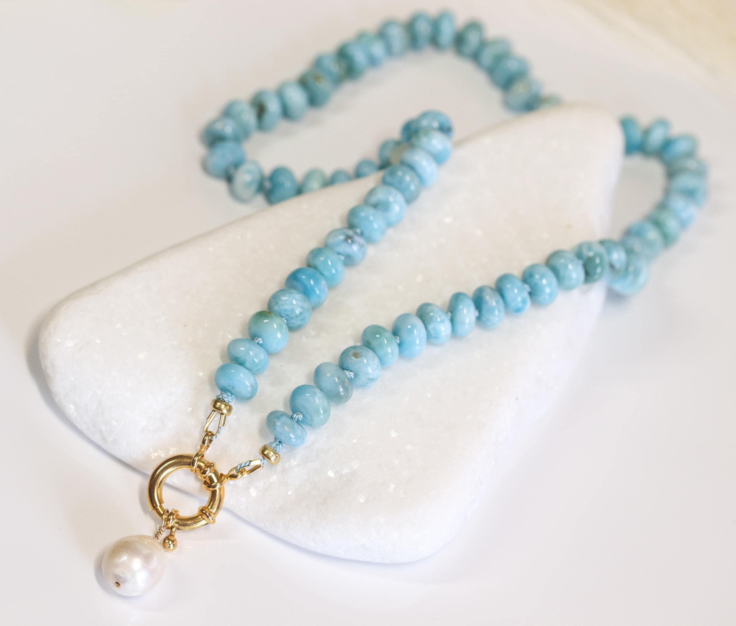 This stunning necklace features exquisite AAA Larimar rondelles (8mm)—sky-blue stones with natural marbling and a glossy, polished finish. Each bead is hand-knotted on blue silk, giving the strand a soft drape and a refined, heirloom feel.