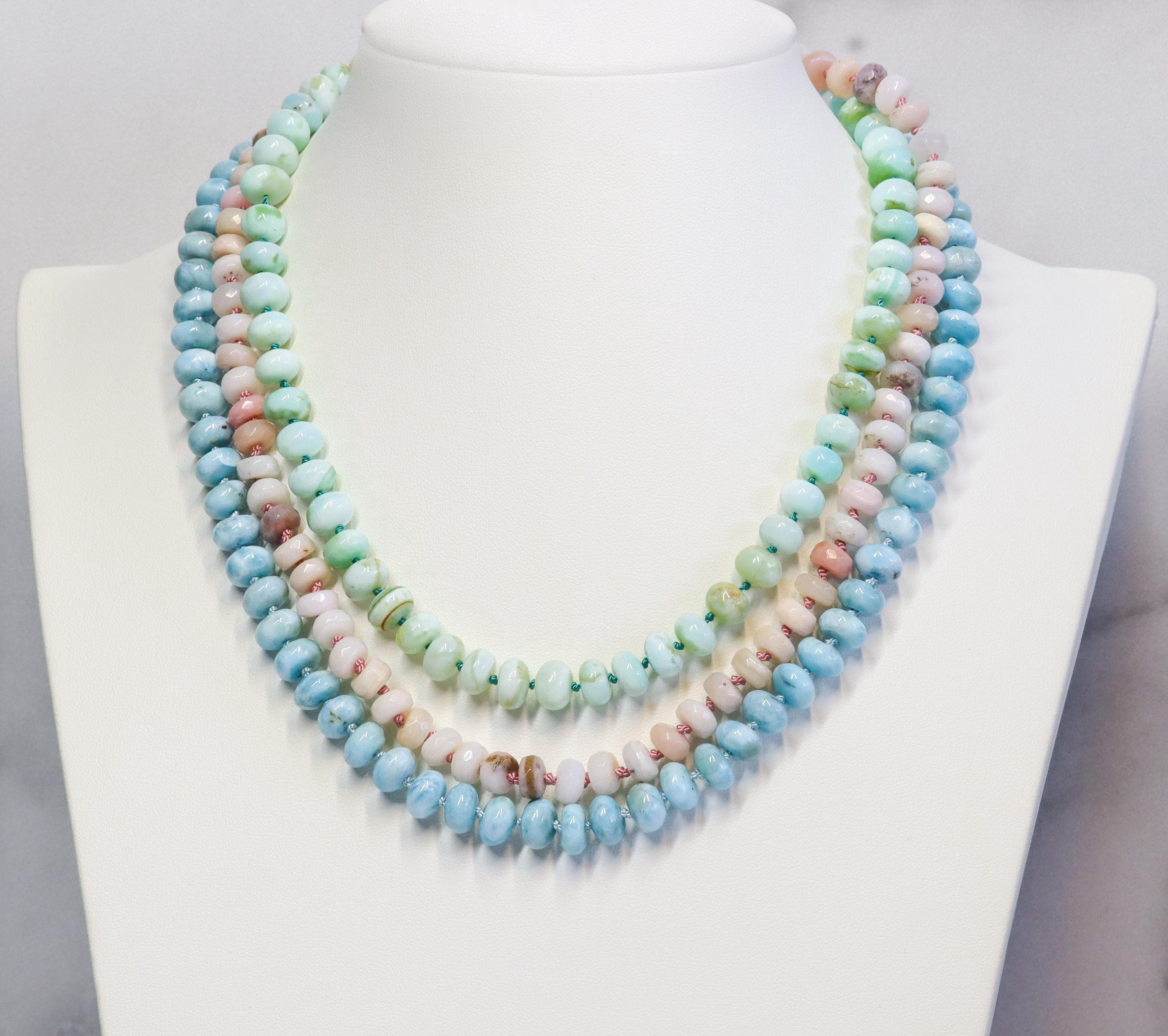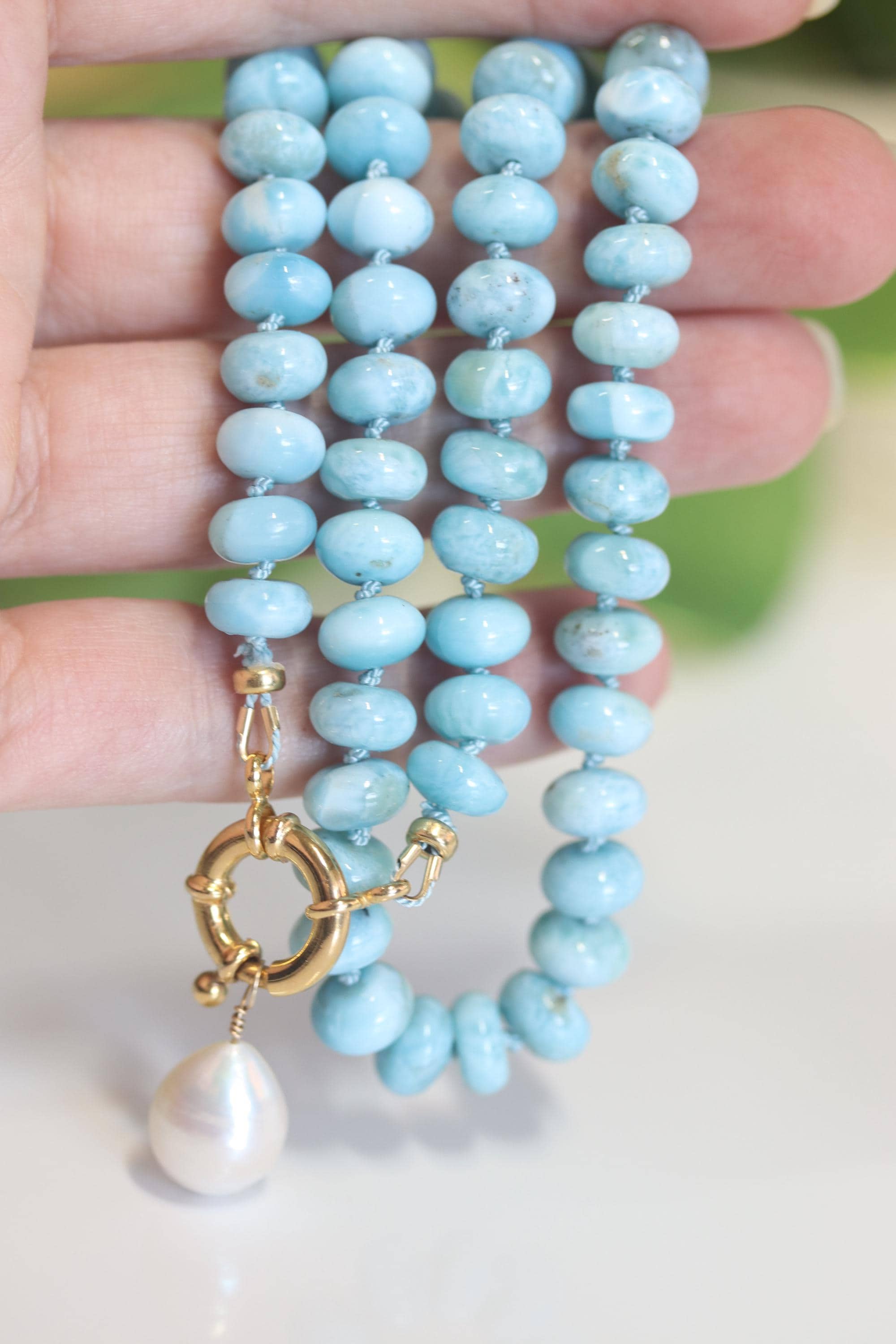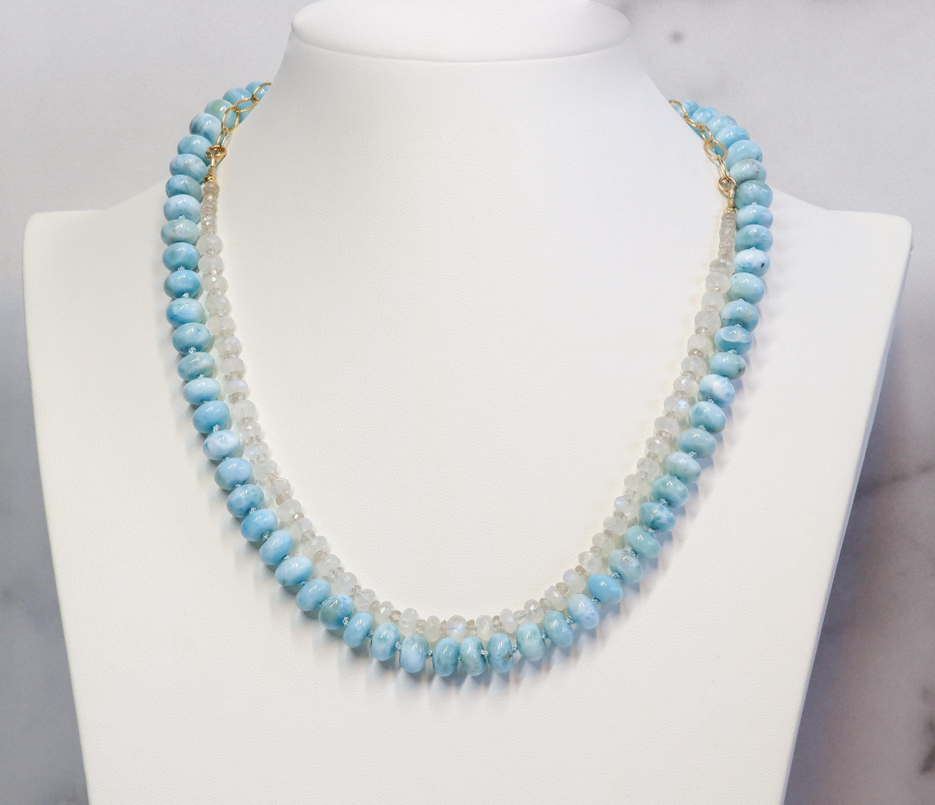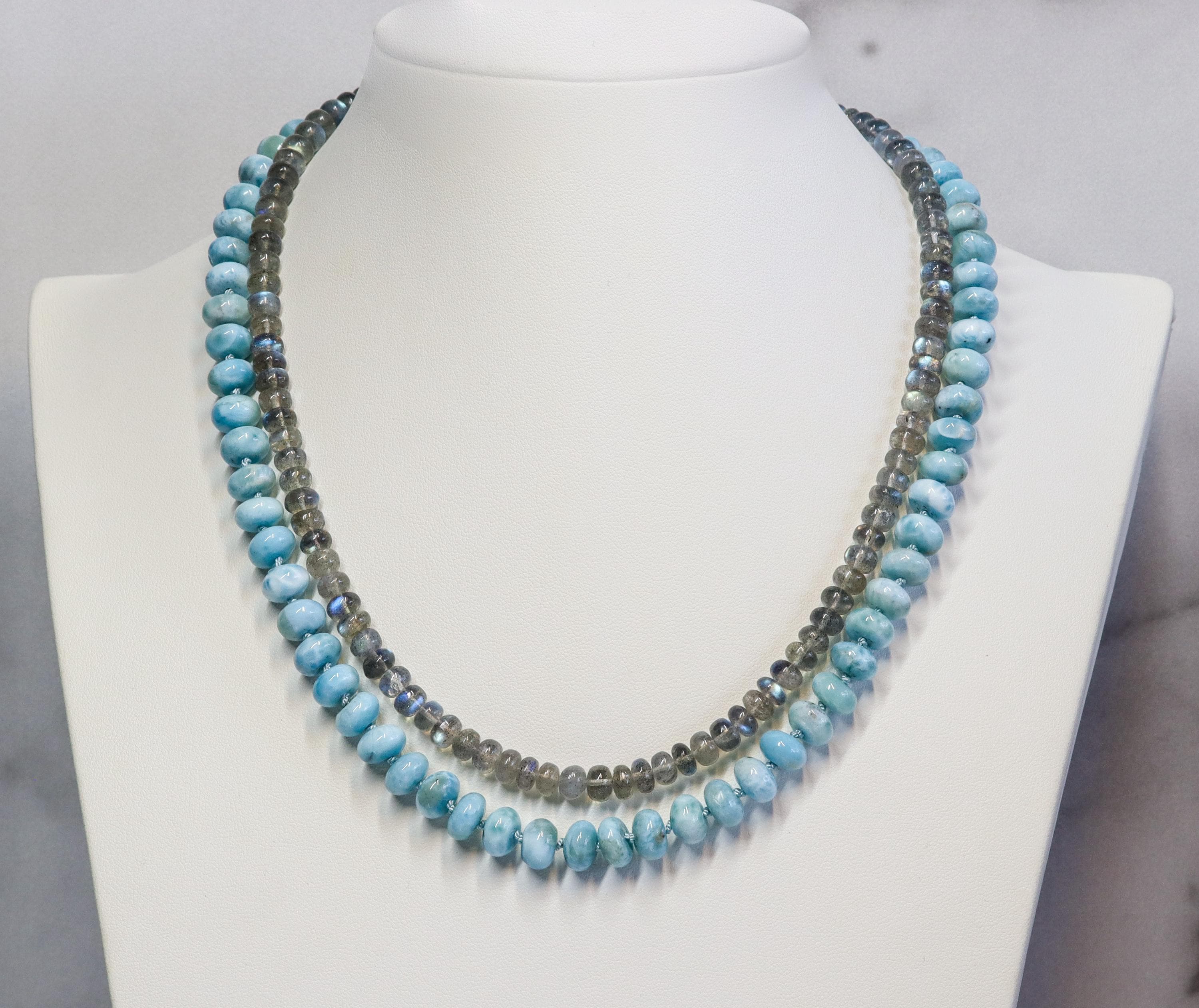 This stunning necklace features exquisite AAA Larimar rondelles (8mm)—sky-blue stones with natural marbling and a glossy, polished finish. Each bead is hand-knotted on blue silk, giving the strand a soft drape and a refined, heirloom feel.