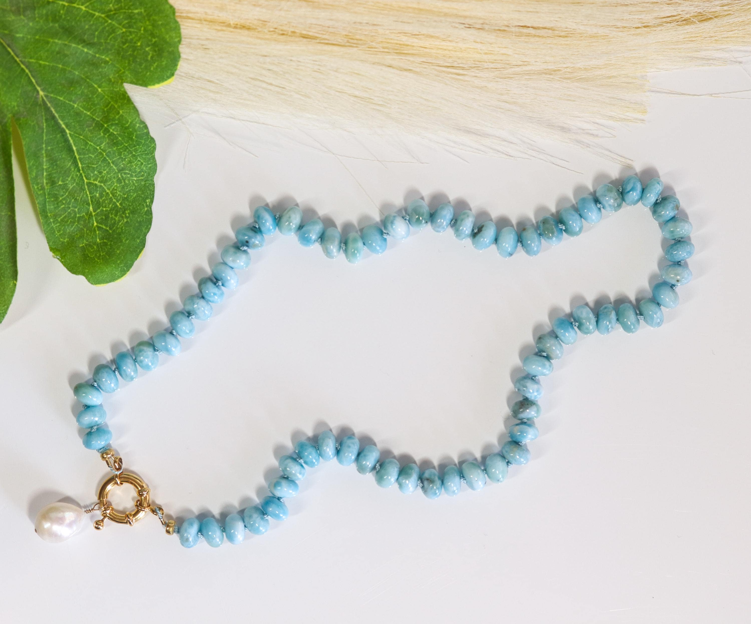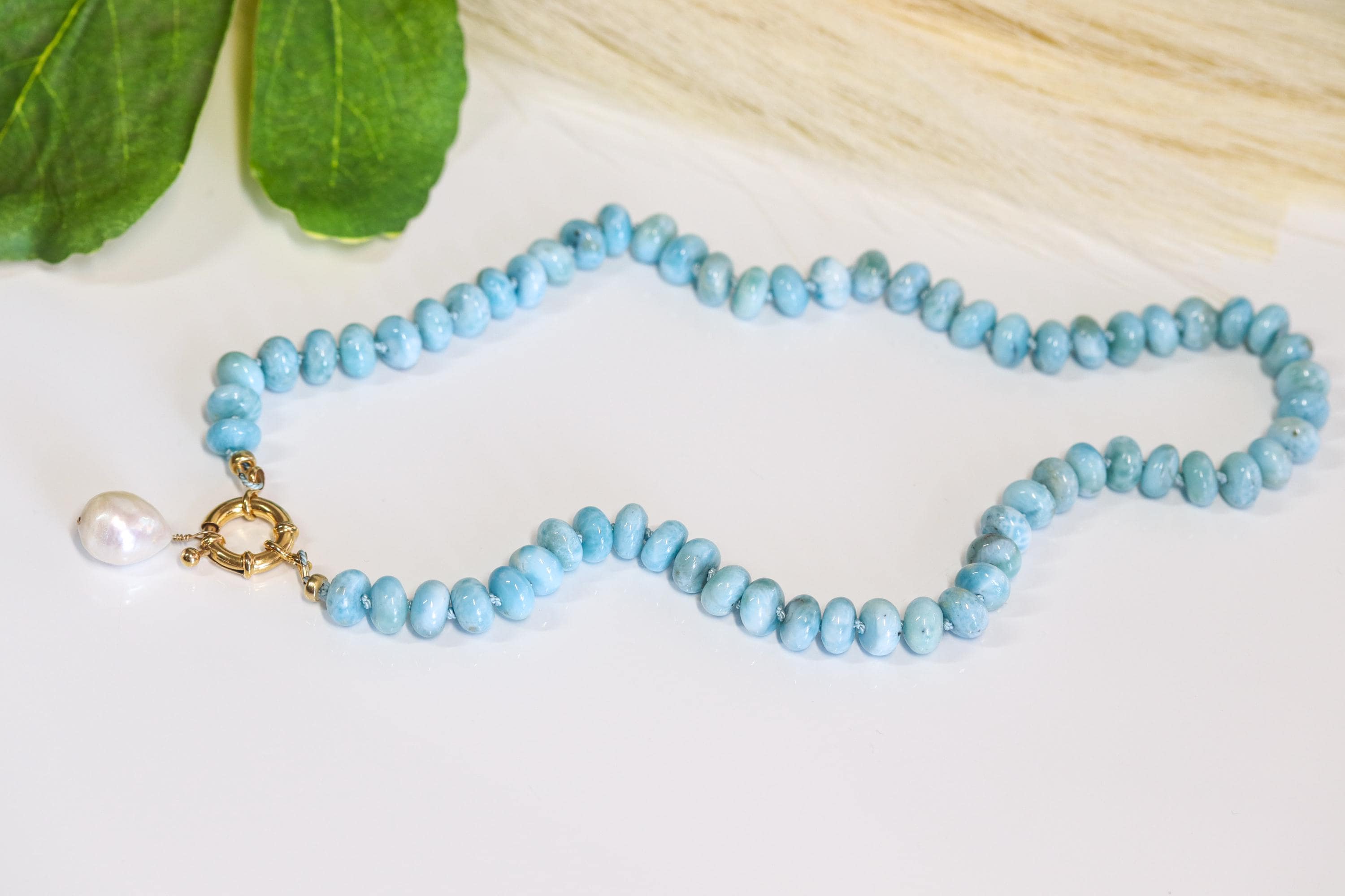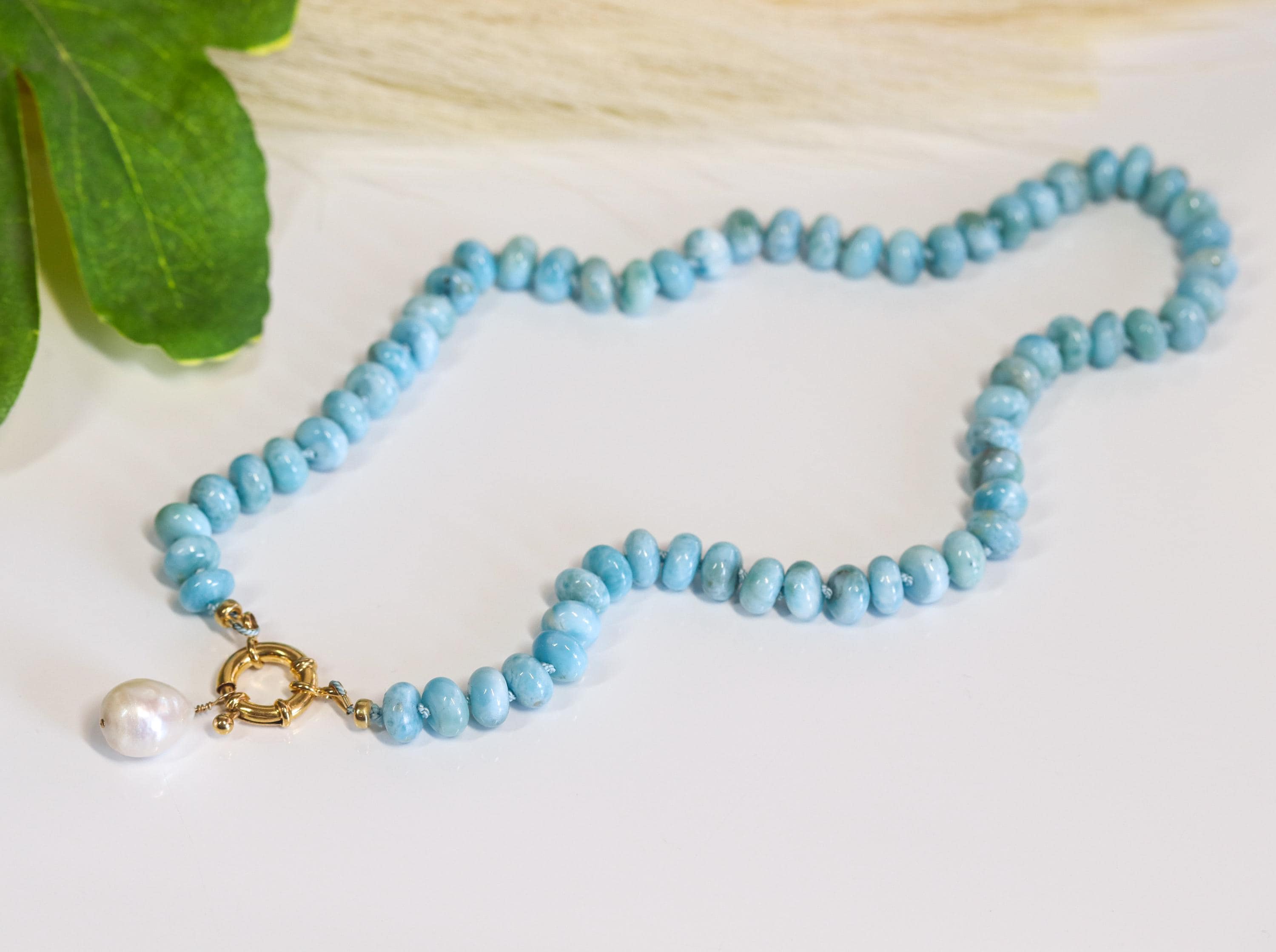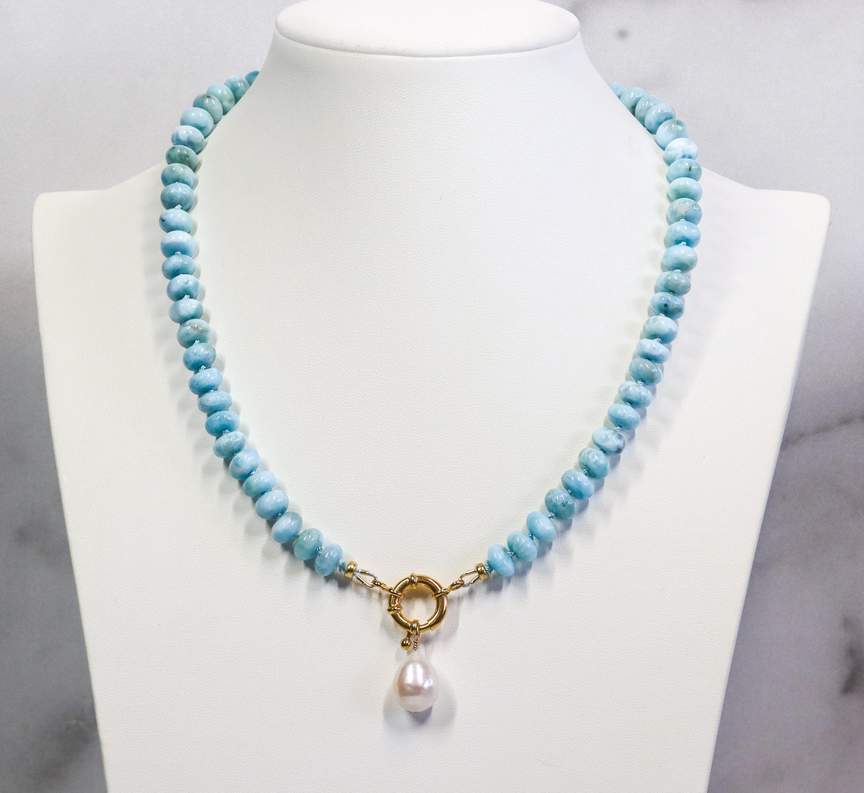 This stunning necklace features exquisite AAA Larimar rondelles (8mm)—sky-blue stones with natural marbling and a glossy, polished finish. Each bead is hand-knotted on blue silk, giving the strand a soft drape and a refined, heirloom feel.