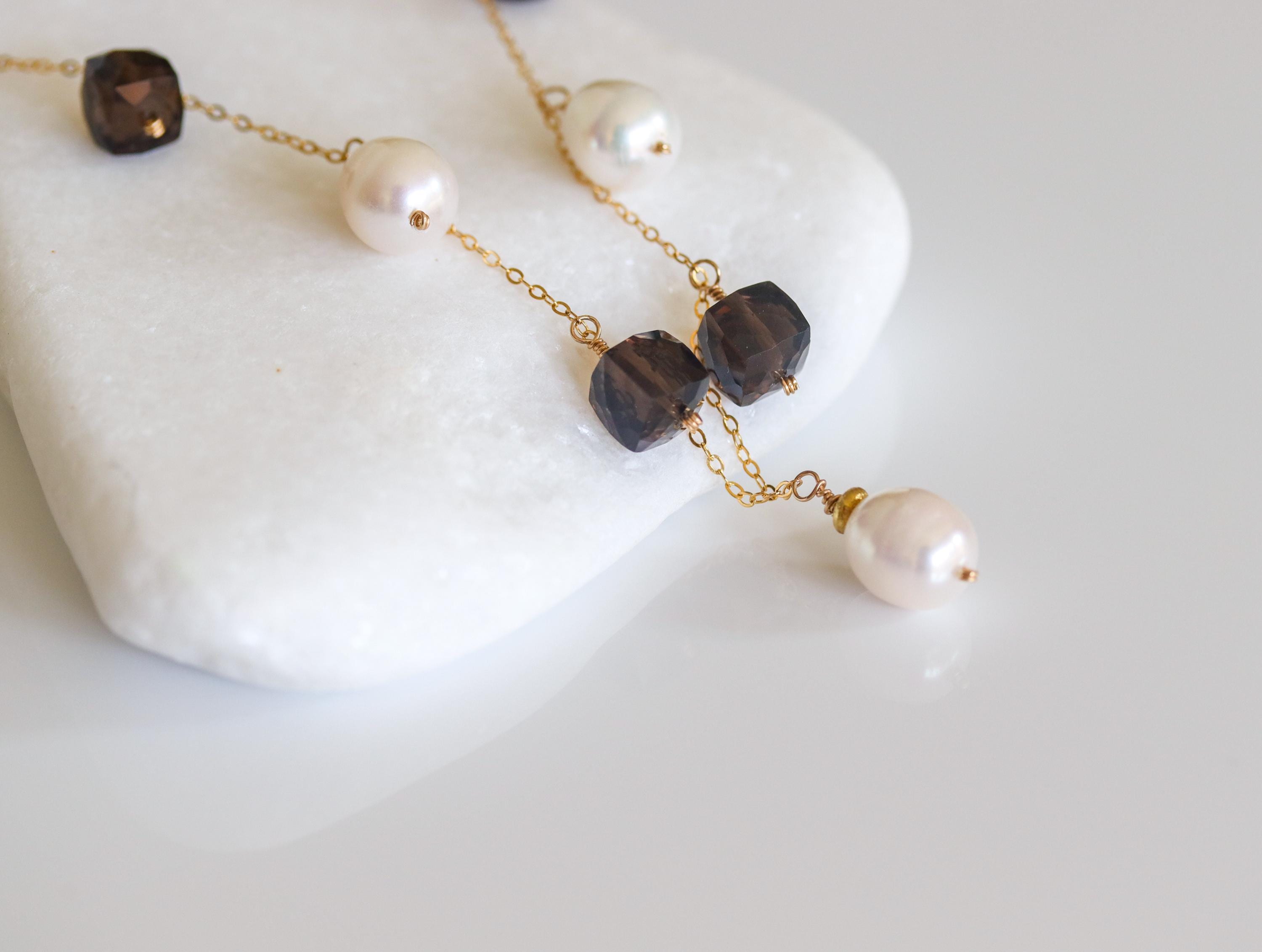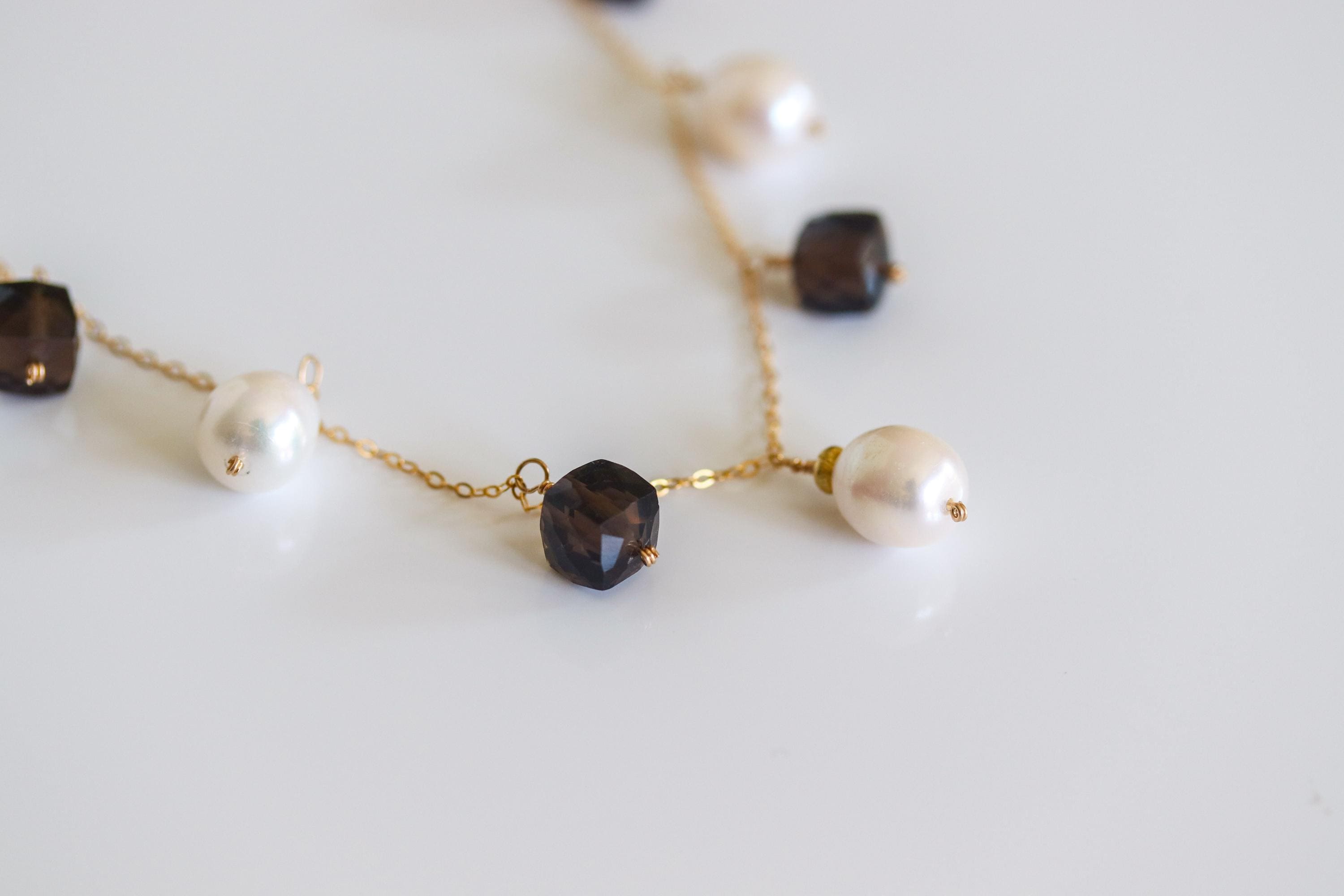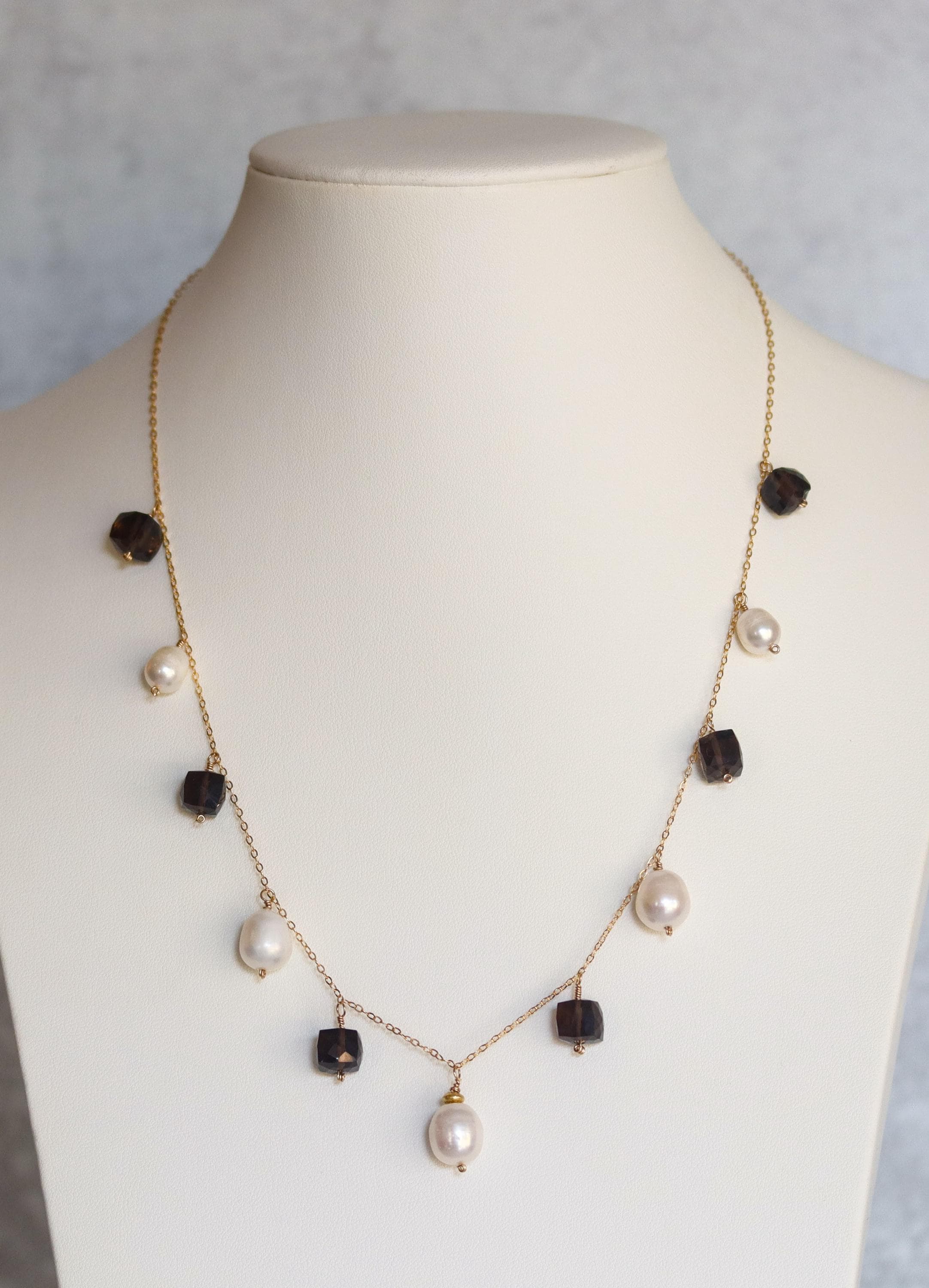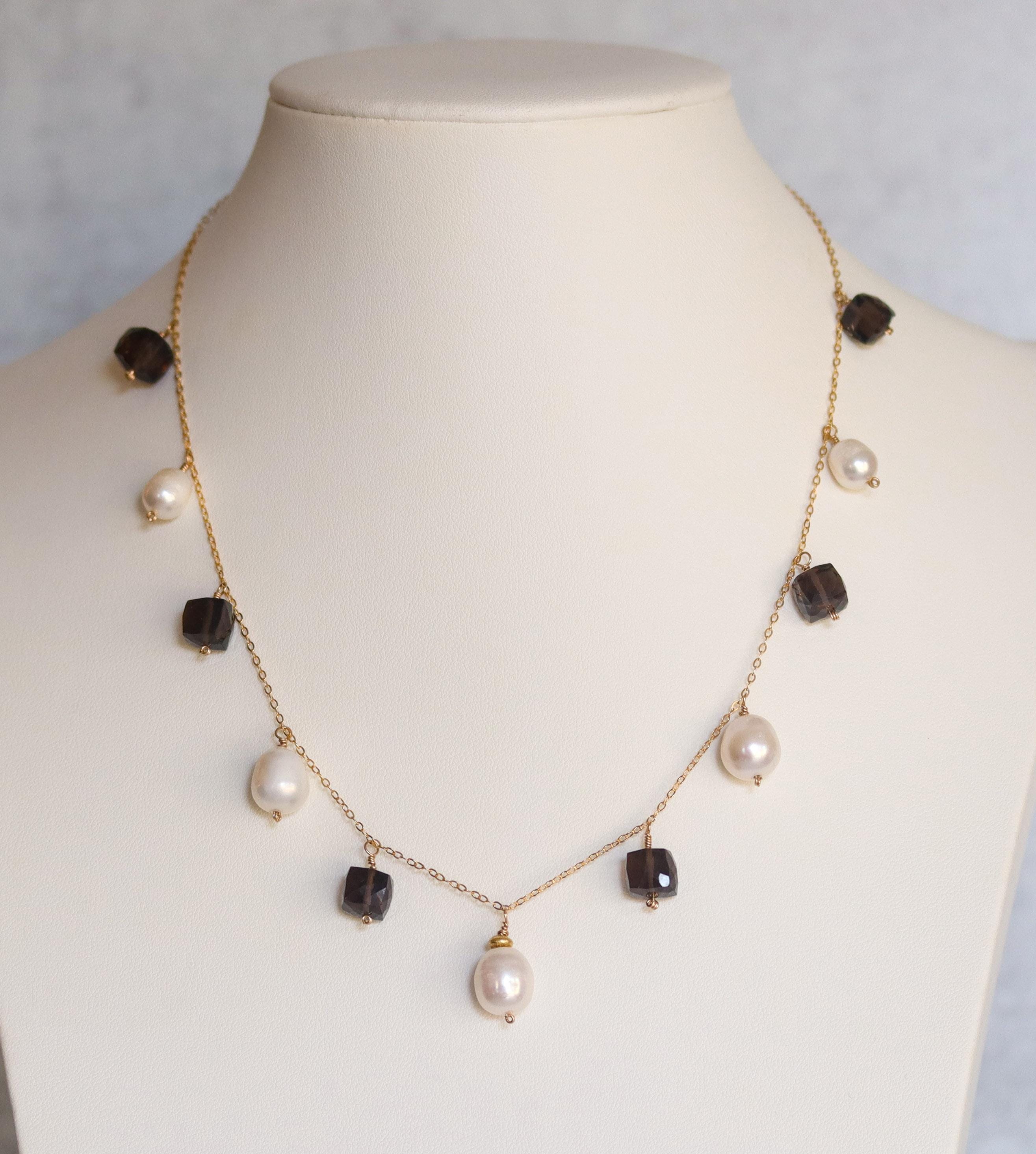 Add a touch of modern elegance to your jewelry collection with this luminous charm necklace. Designed with glowing baroque pearls and faceted smoky quartz cubes, each charm catches the light beautifully to create a balance of soft luster and rich depth.