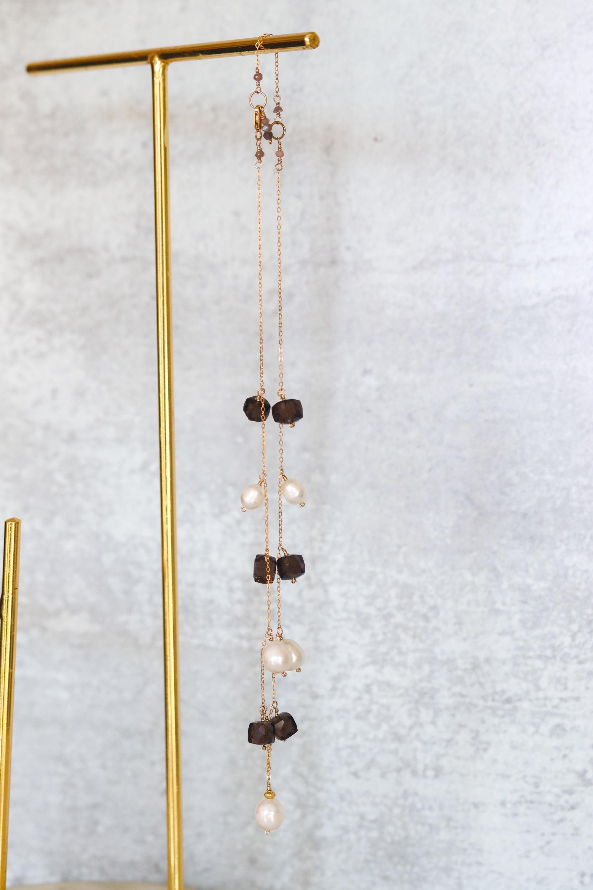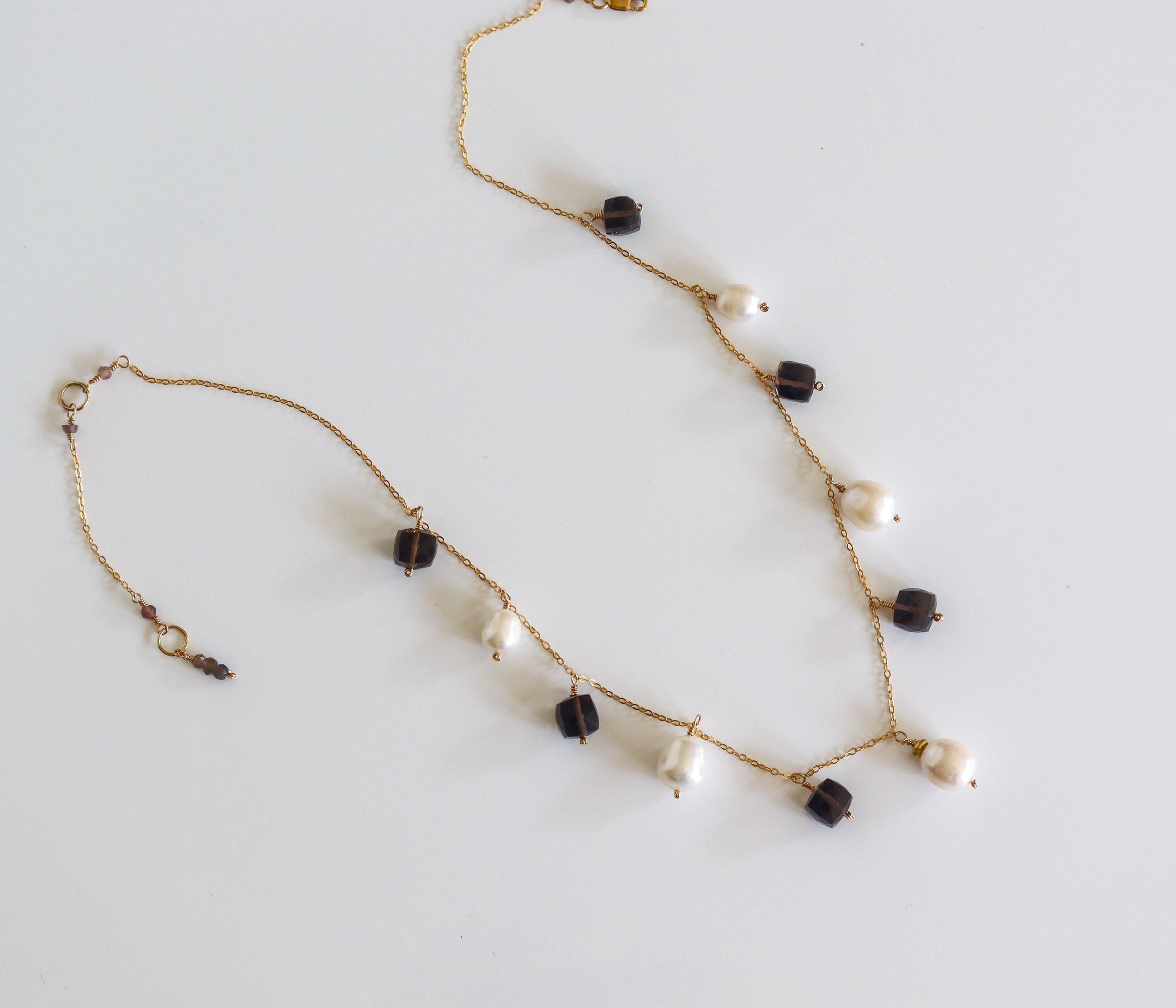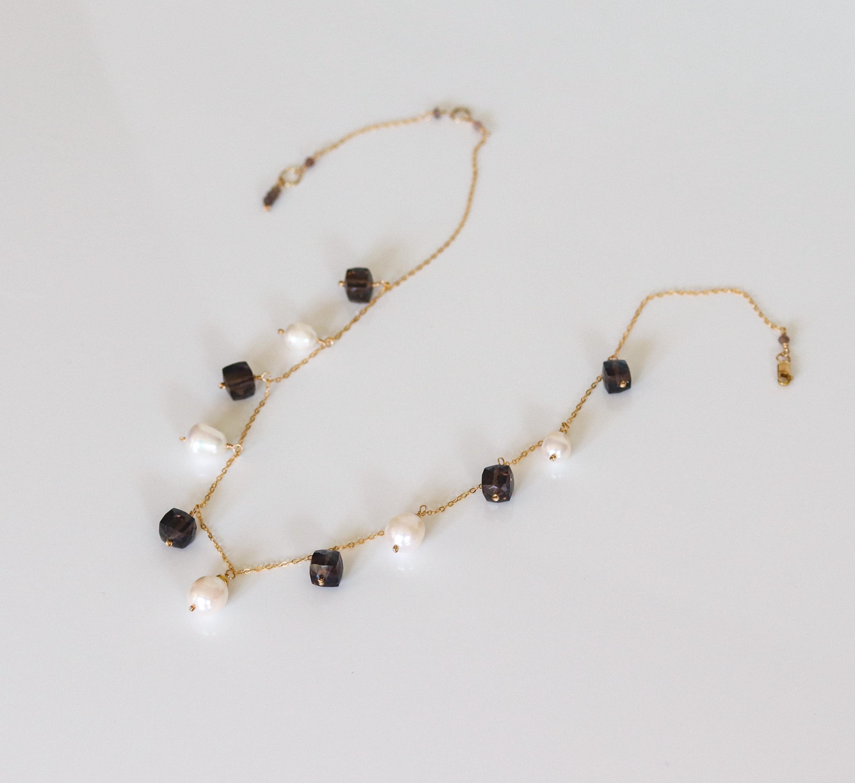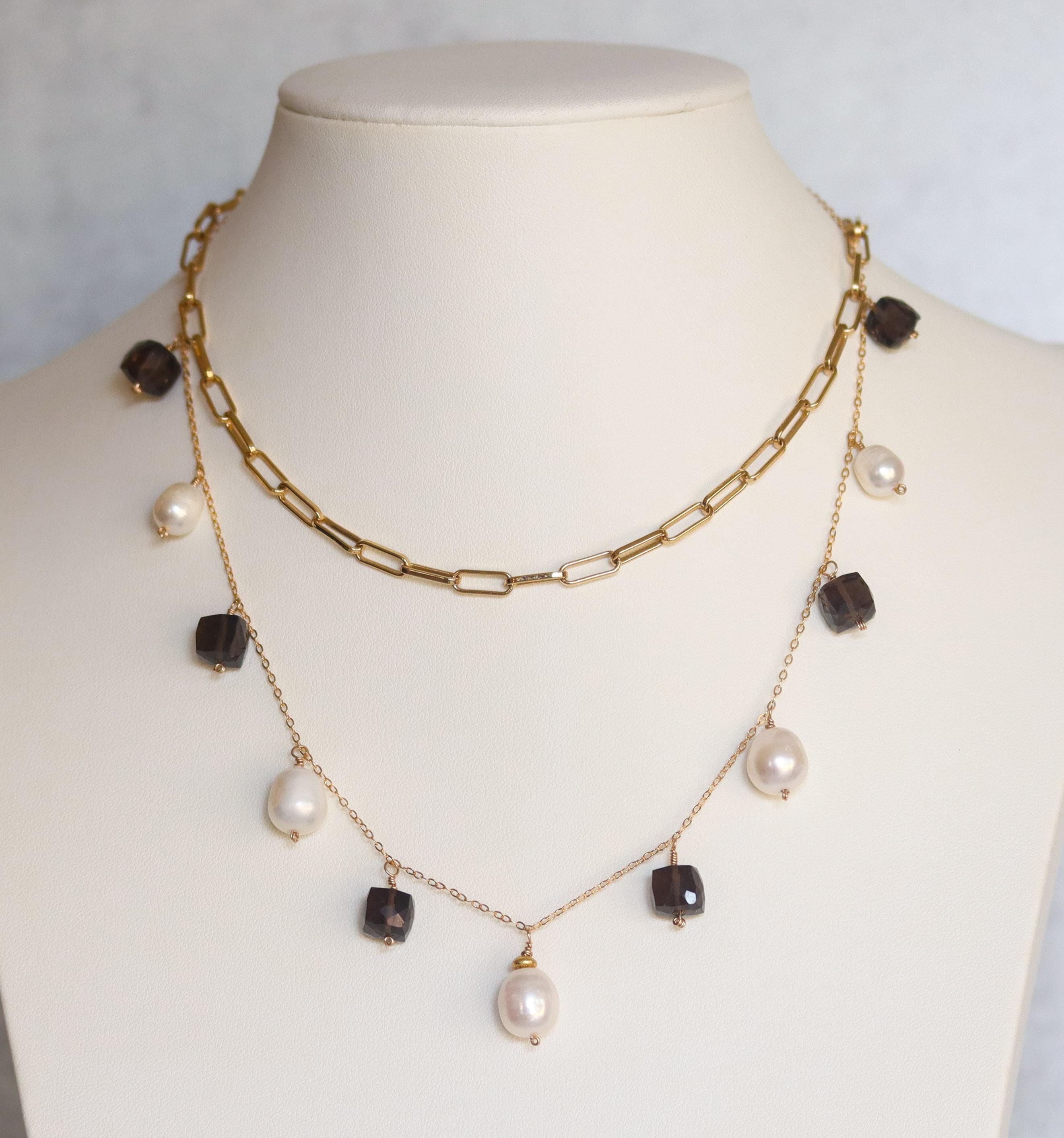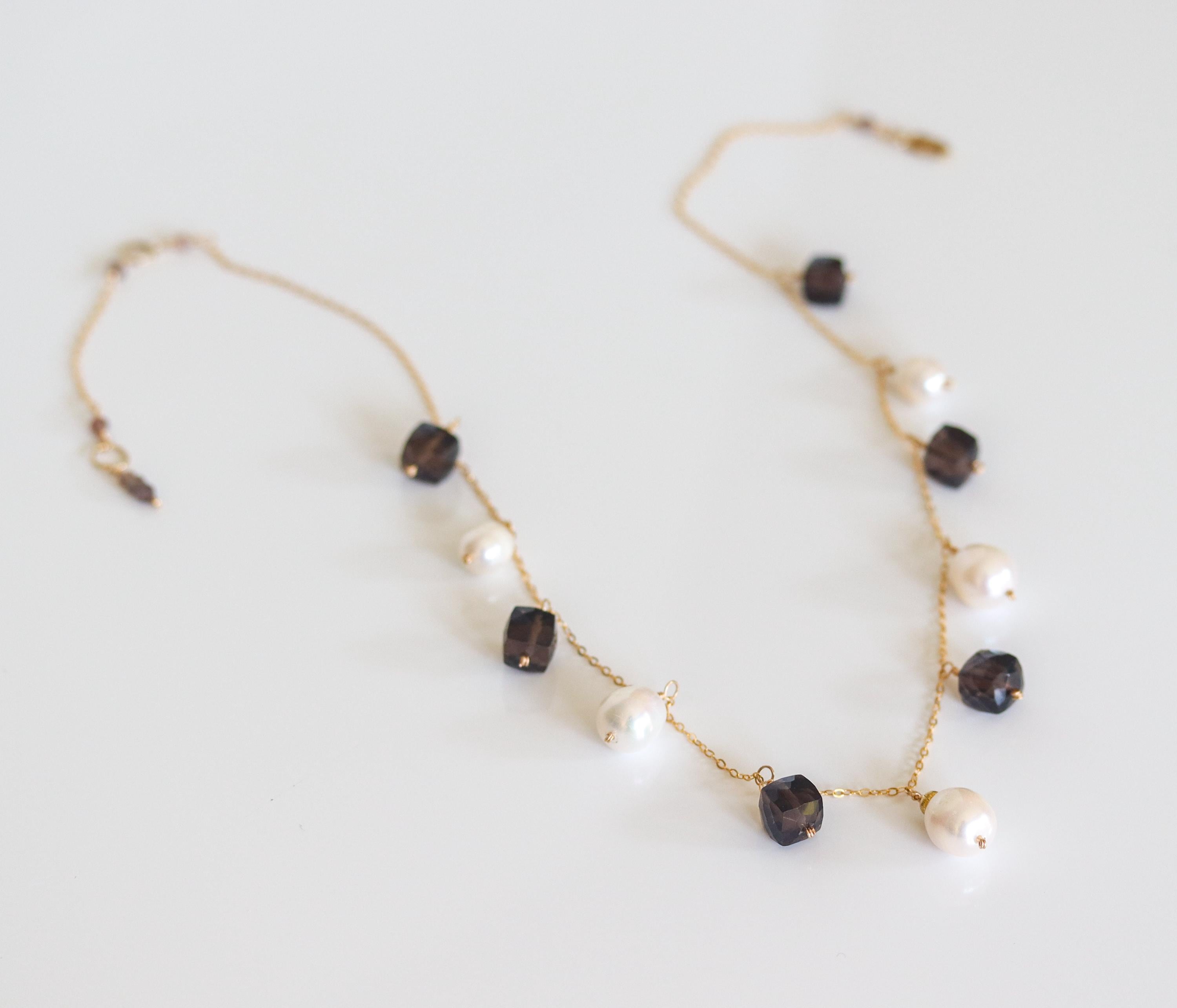 Add a touch of modern elegance to your jewelry collection with this luminous charm necklace. Designed with glowing baroque pearls and faceted smoky quartz cubes, each charm catches the light beautifully to create a balance of soft luster and rich depth.