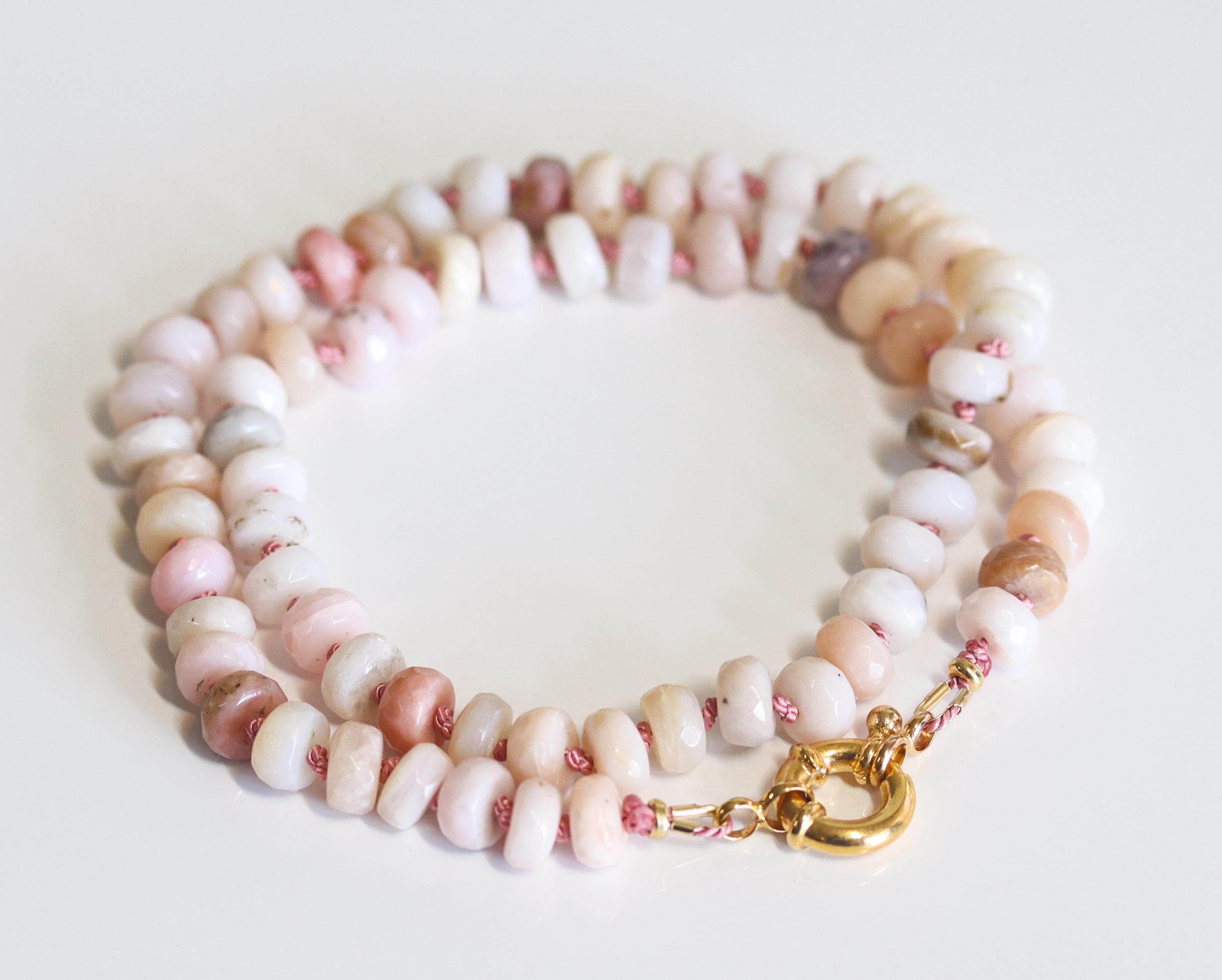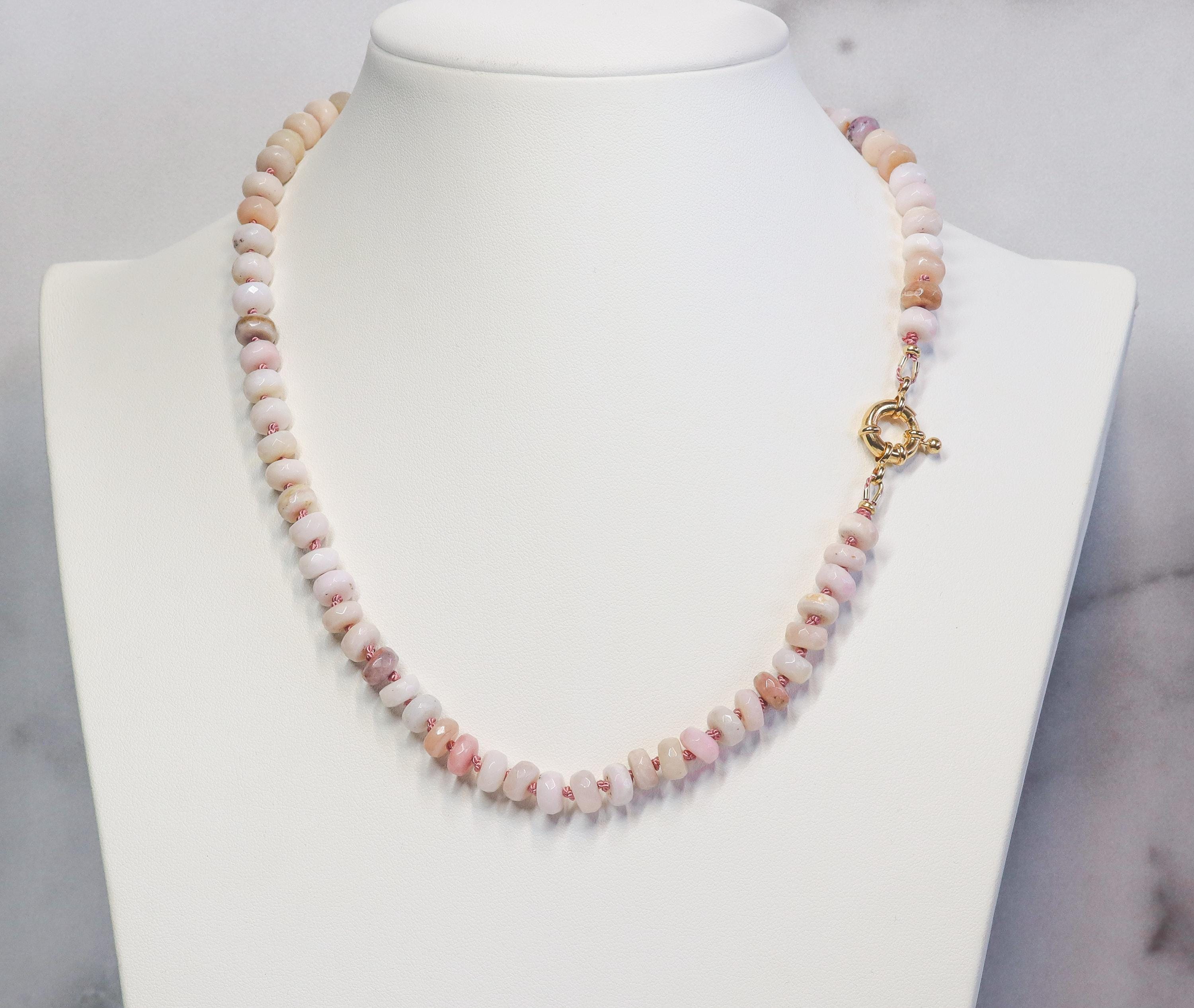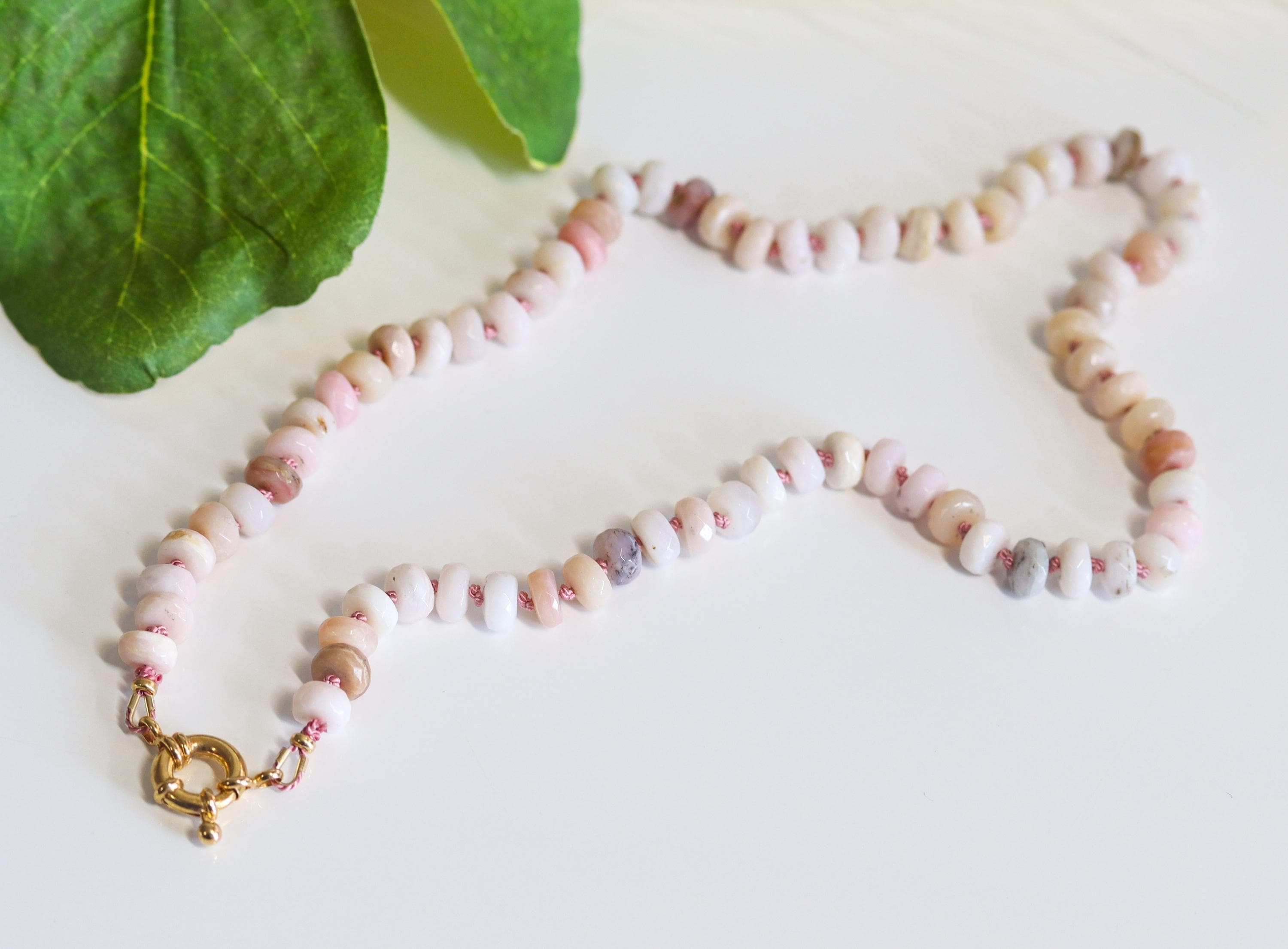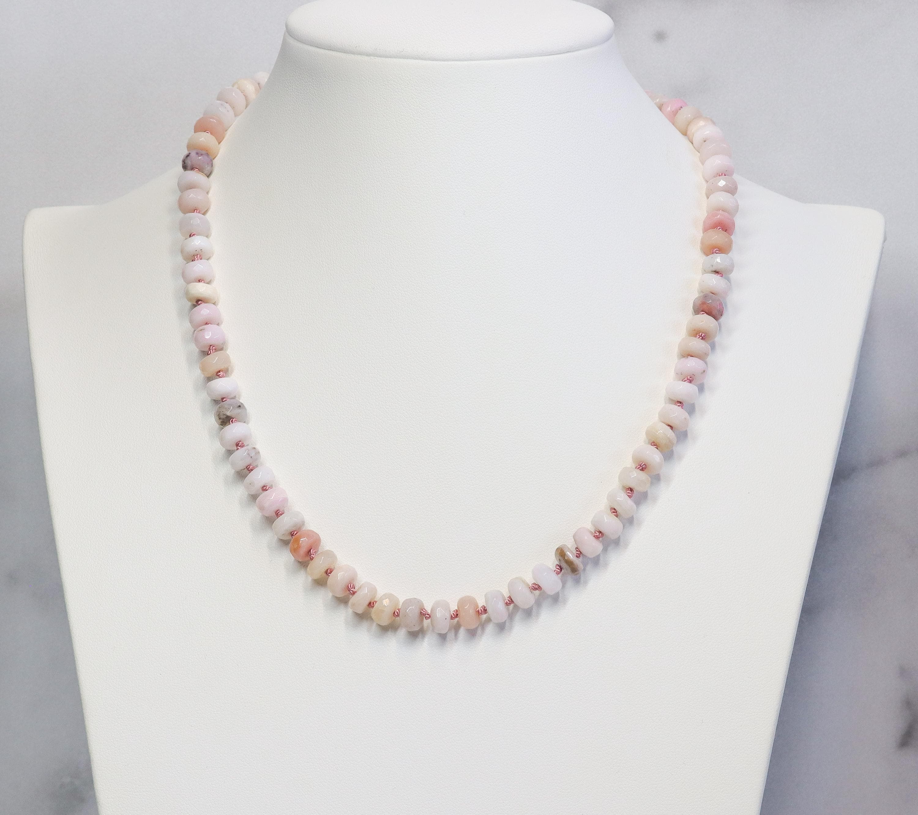 This soft, feminine necklace features Pink Peruvian Opal rondelles in shades ranging from pale blush to deep rose, accented with natural hints of grey for beautiful depth. Each opal bead is hand-knotted on pink silk, giving the necklace a fluid drape and a luxe, finished look.