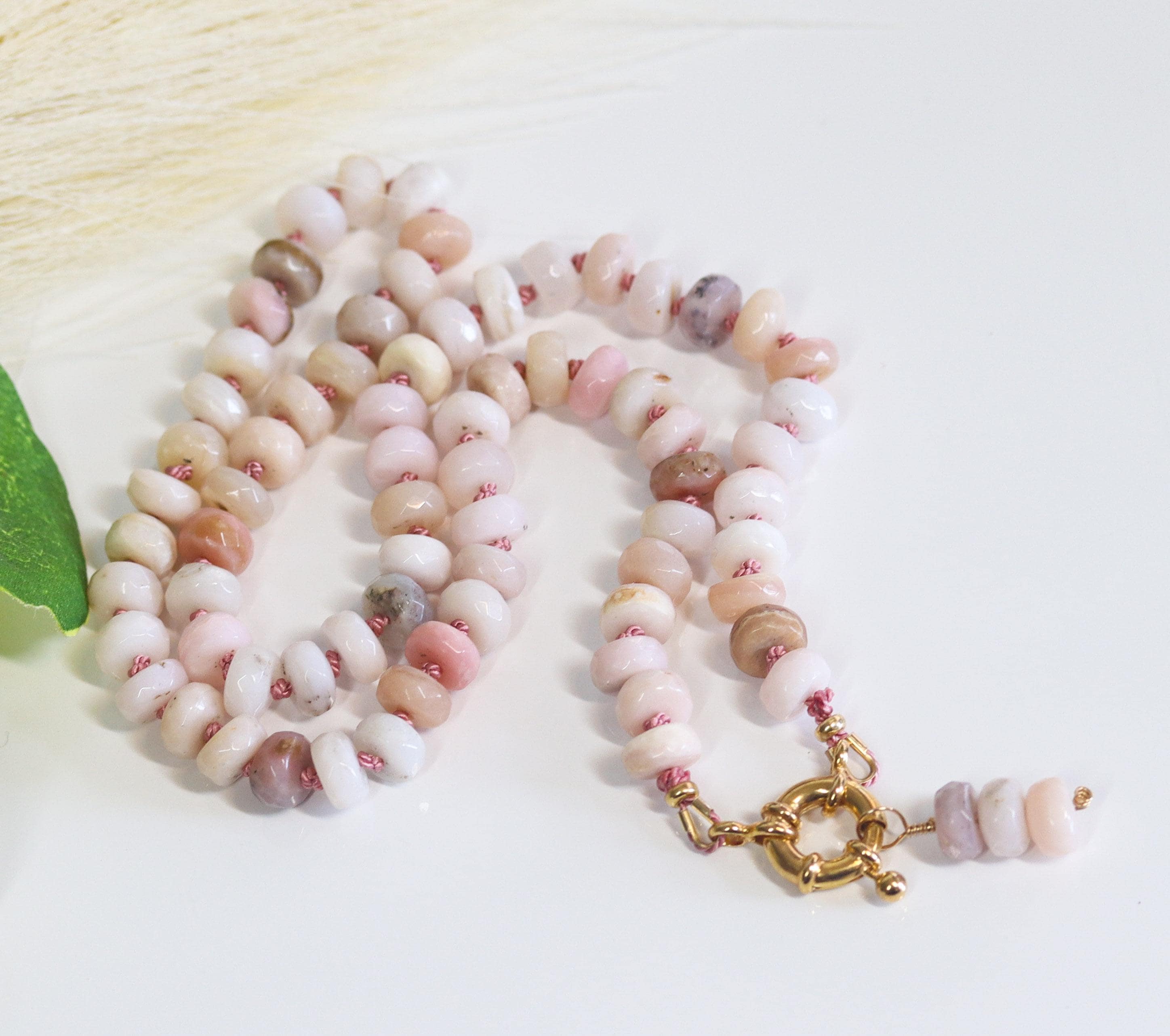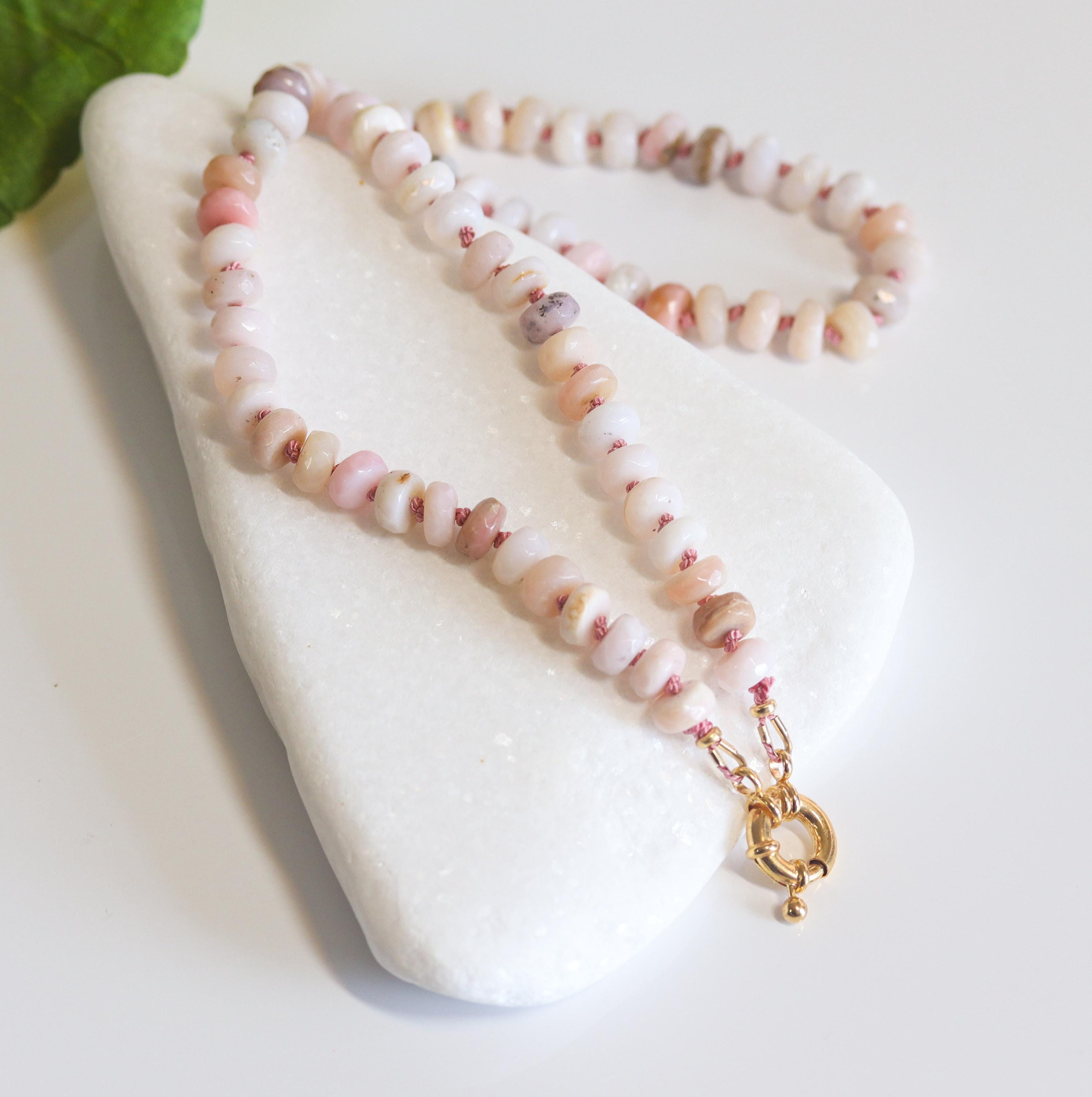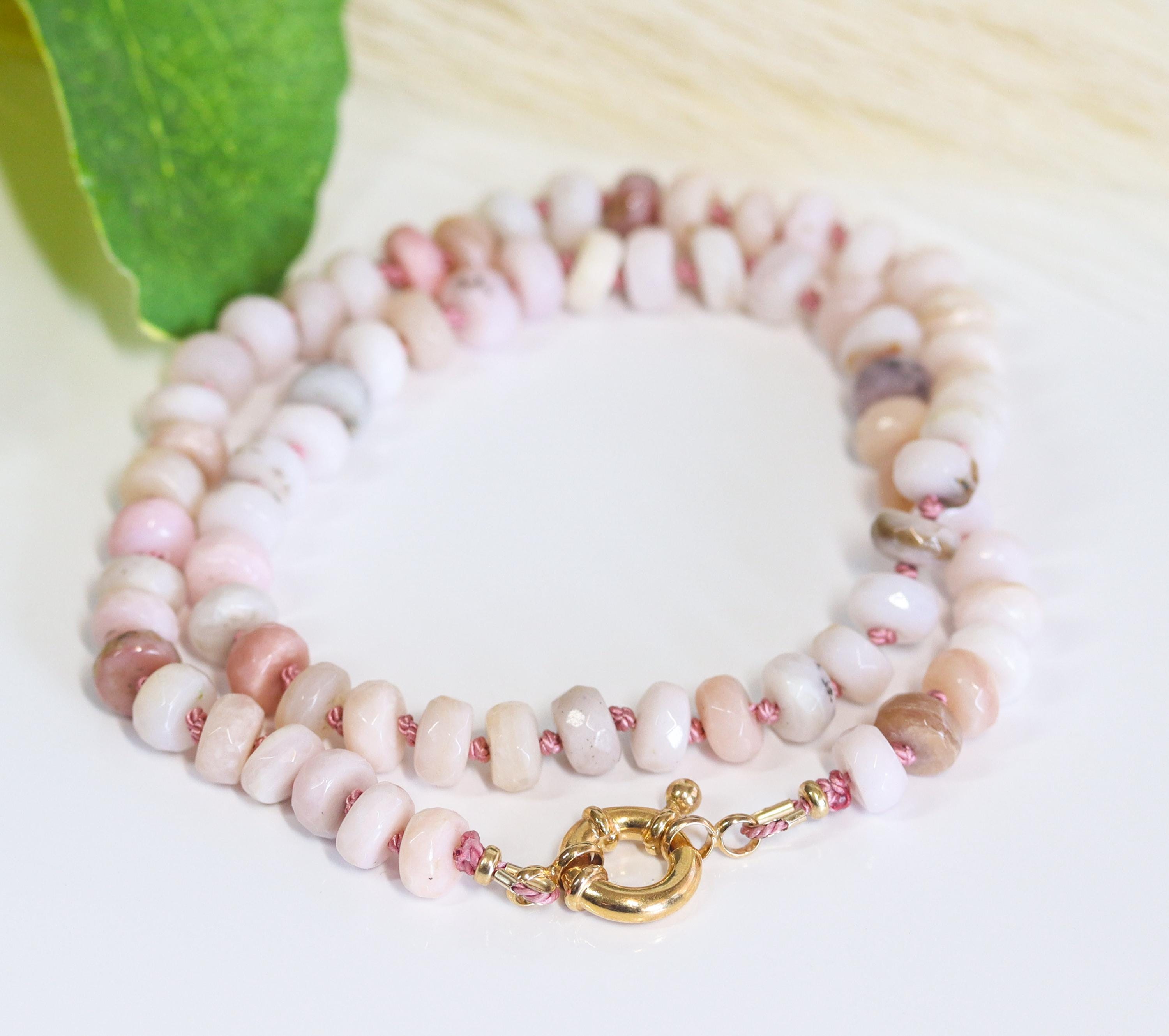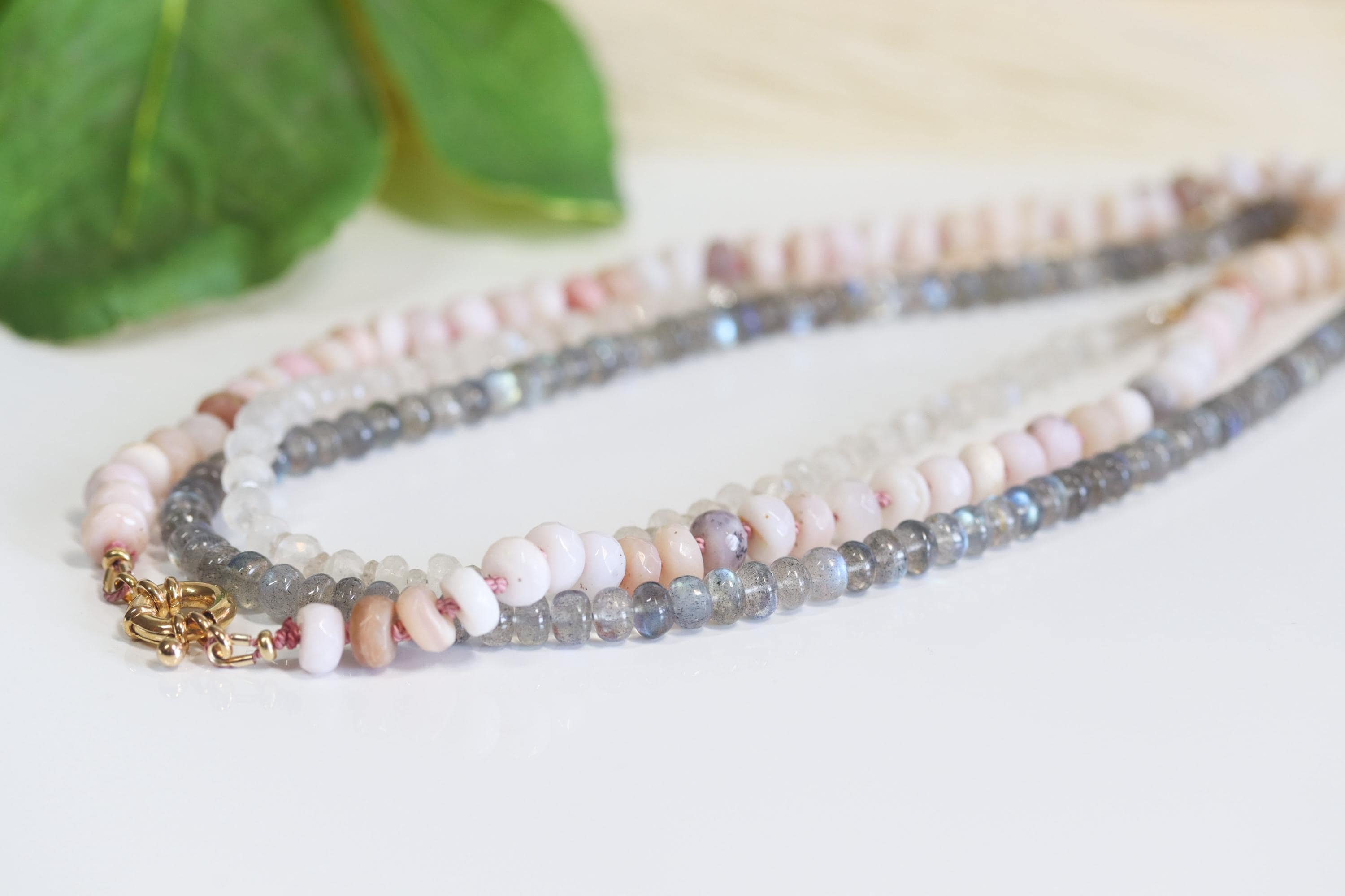 This soft, feminine necklace features Pink Peruvian Opal rondelles in shades ranging from pale blush to deep rose, accented with natural hints of grey for beautiful depth. Each opal bead is hand-knotted on pink silk, giving the necklace a fluid drape and a luxe, finished look.