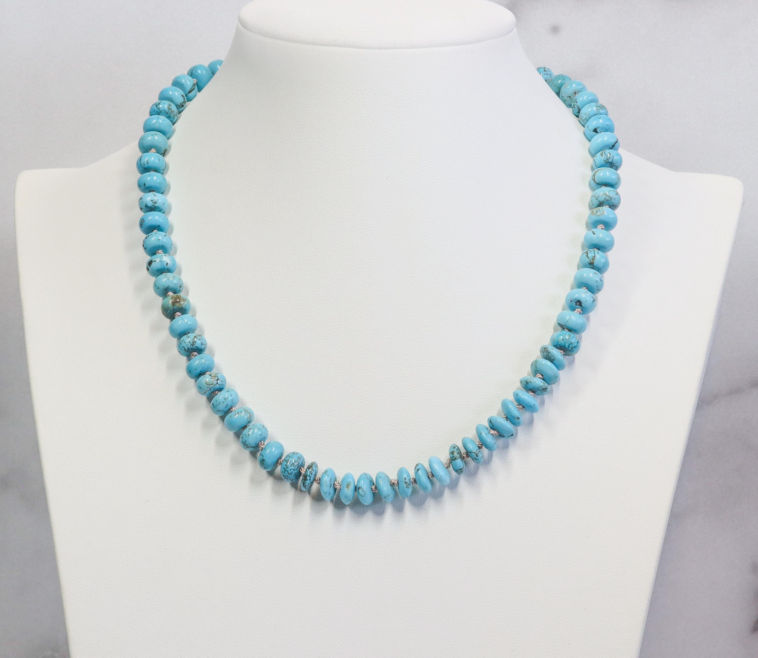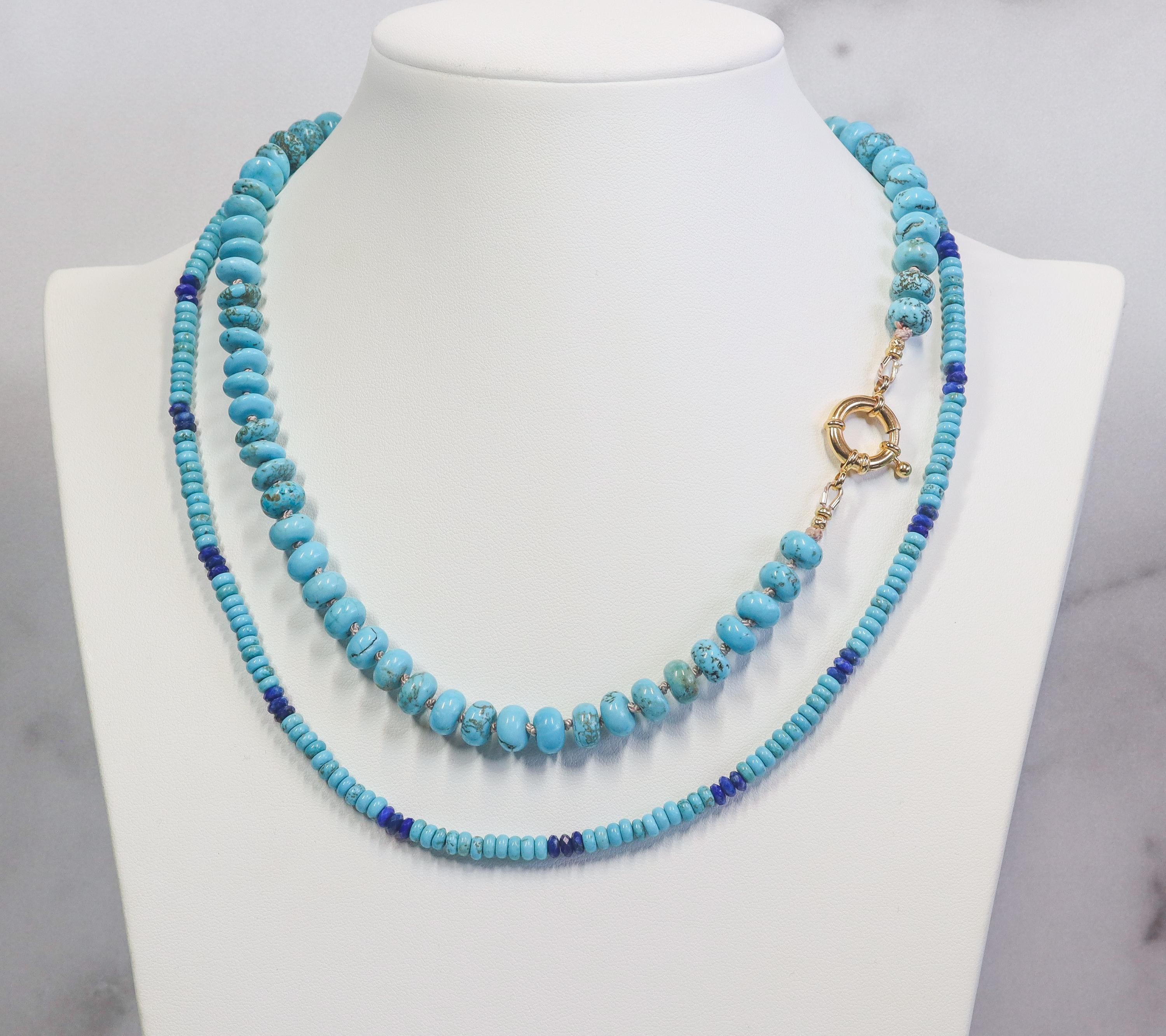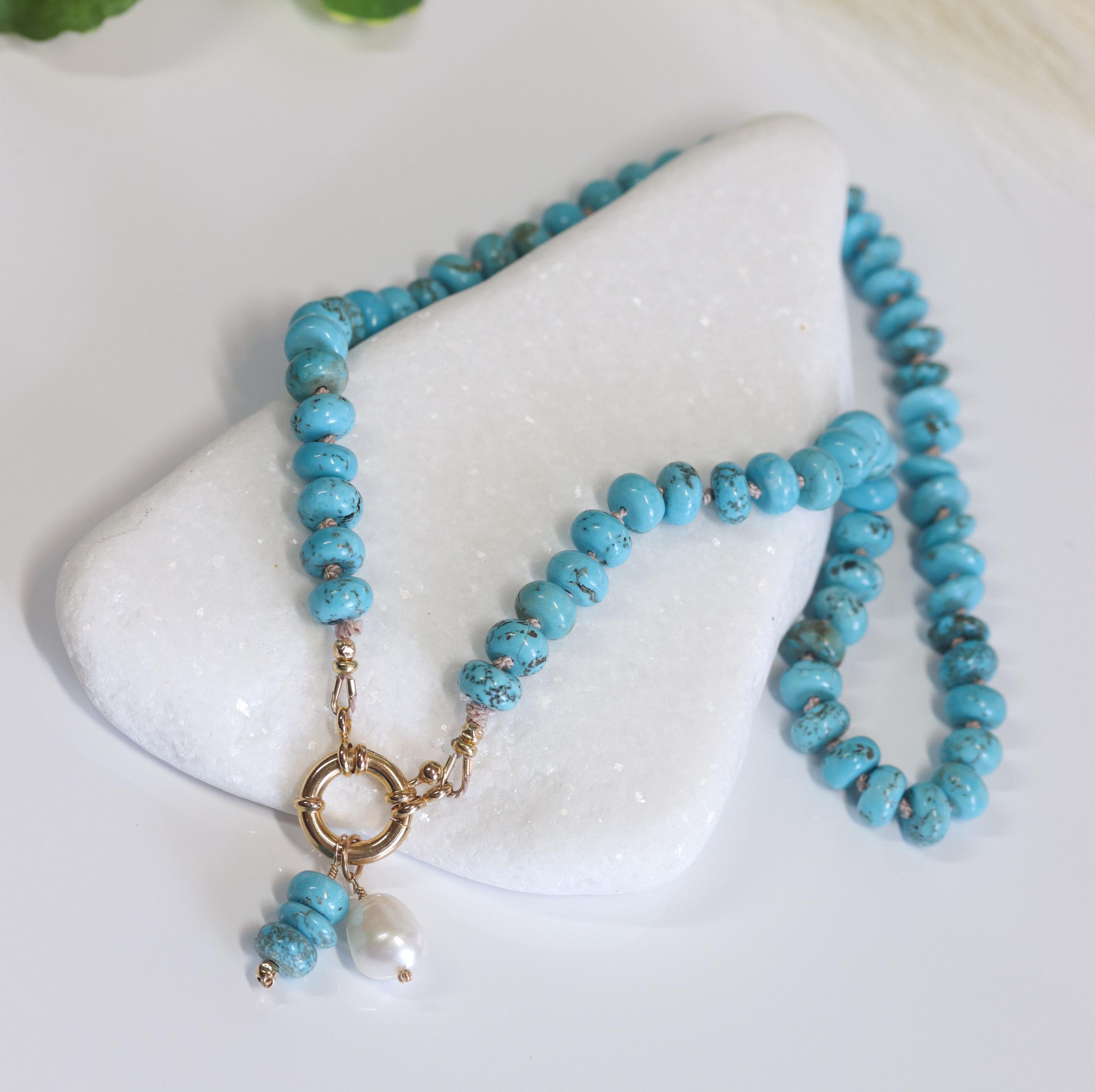 Wrap yourself in the tranquil elegance of the American Southwest with this Lone Mountain turquoise necklace. Hand knotted on luxurious silk and finished with a gold-filled sailor clasp, this piece radiates artisanal integrity and modern refinement. The genuine turquoise rondelles shimmer with natural matrix patterns—each bead telling its own story.