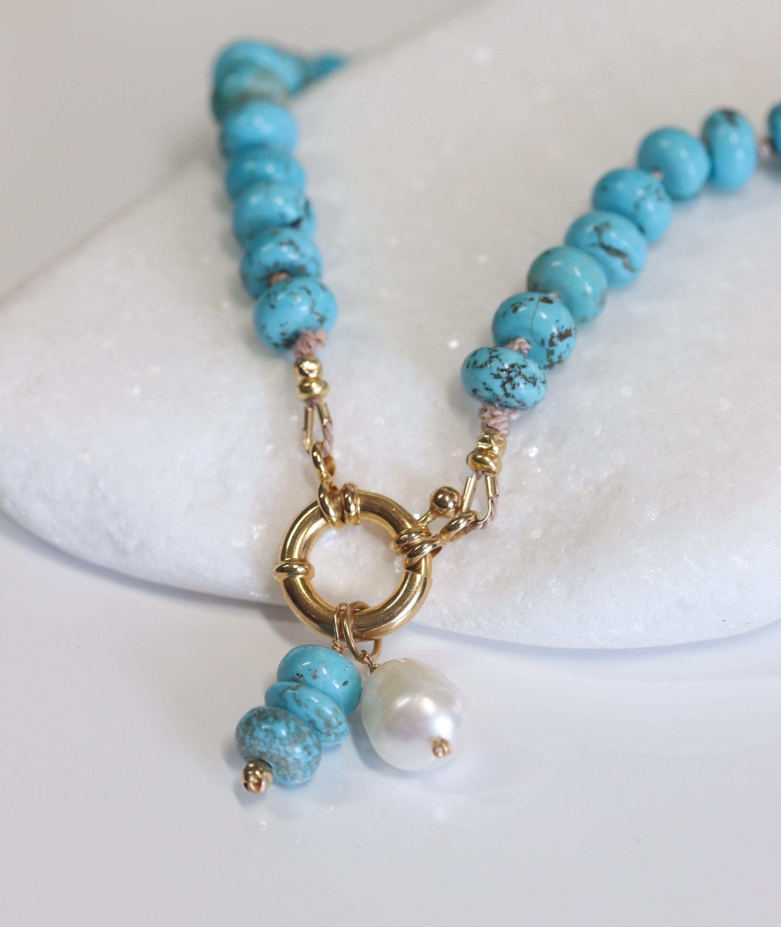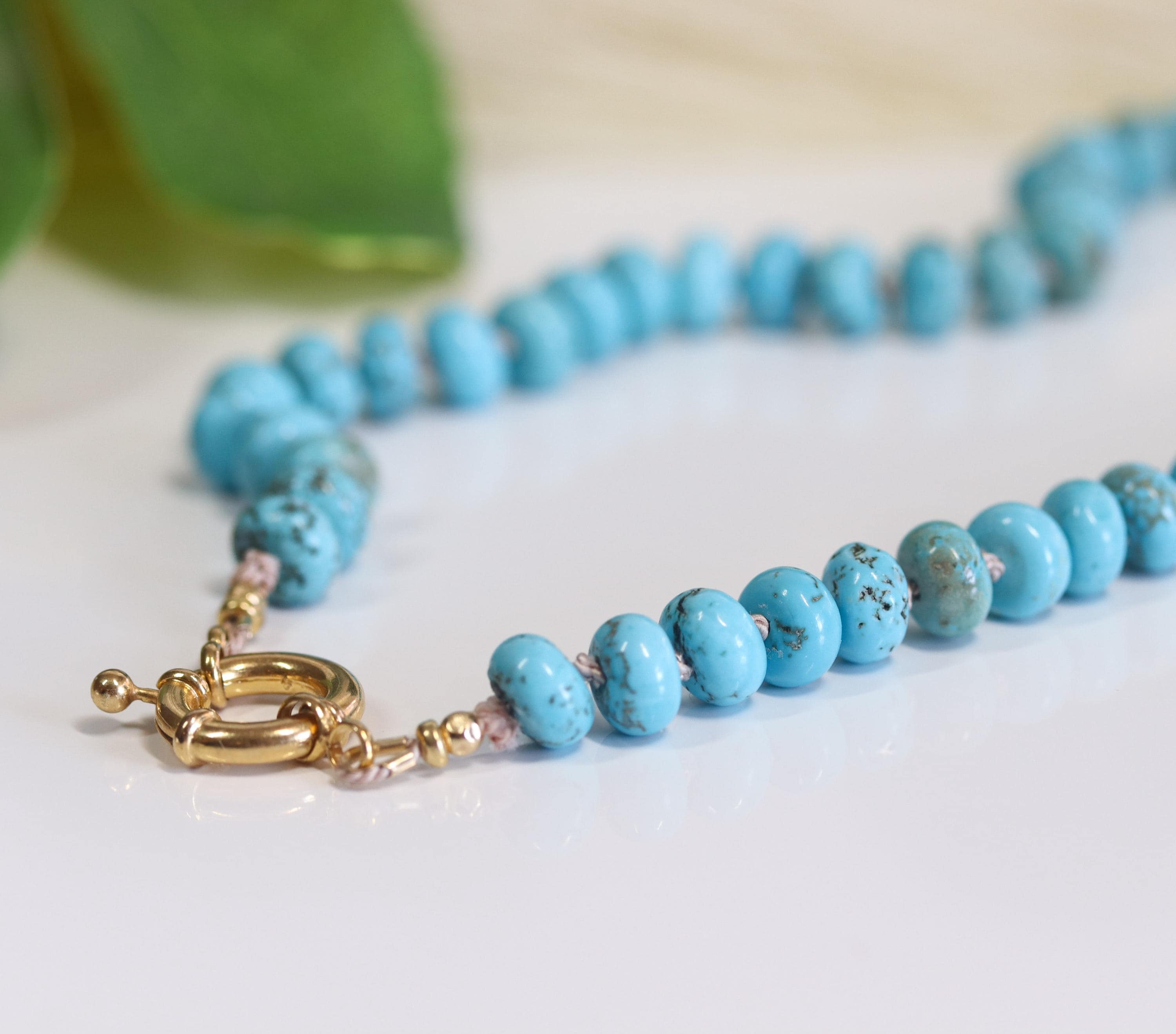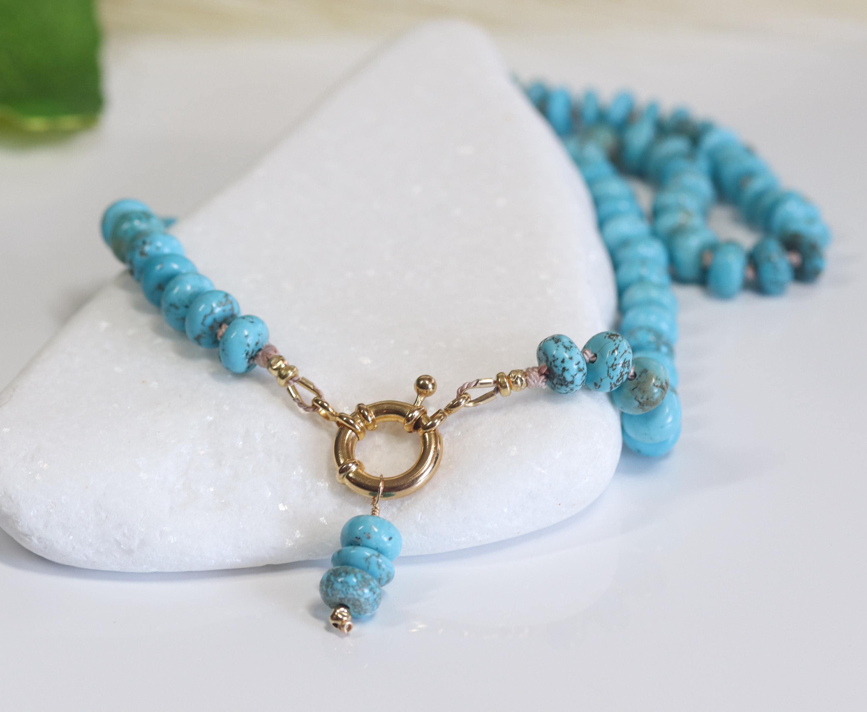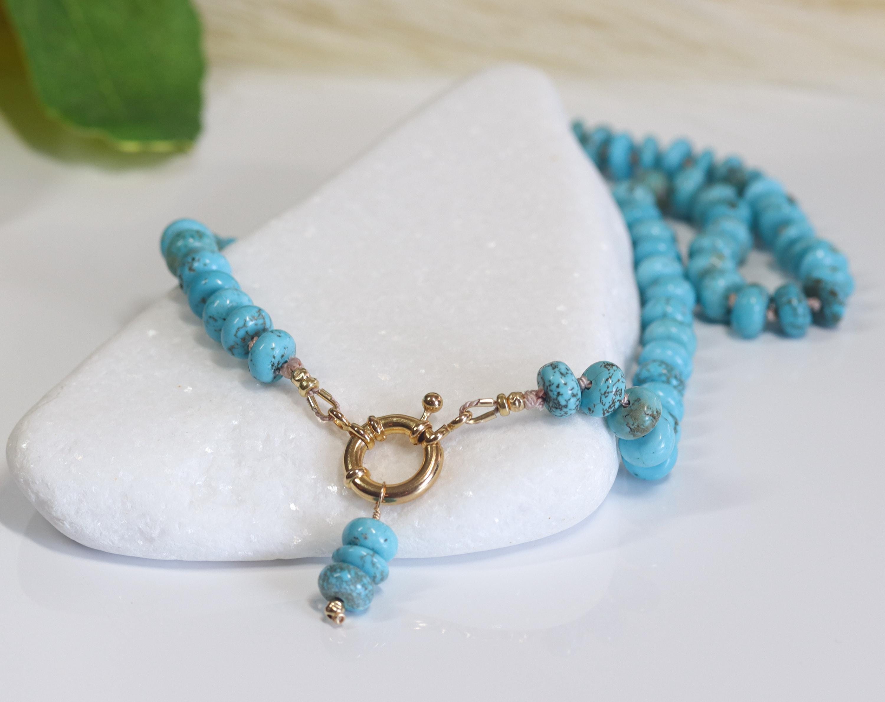 Wrap yourself in the tranquil elegance of the American Southwest with this Lone Mountain turquoise necklace. Hand knotted on luxurious silk and finished with a gold-filled sailor clasp, this piece radiates artisanal integrity and modern refinement. The genuine turquoise rondelles shimmer with natural matrix patterns—each bead telling its own story.