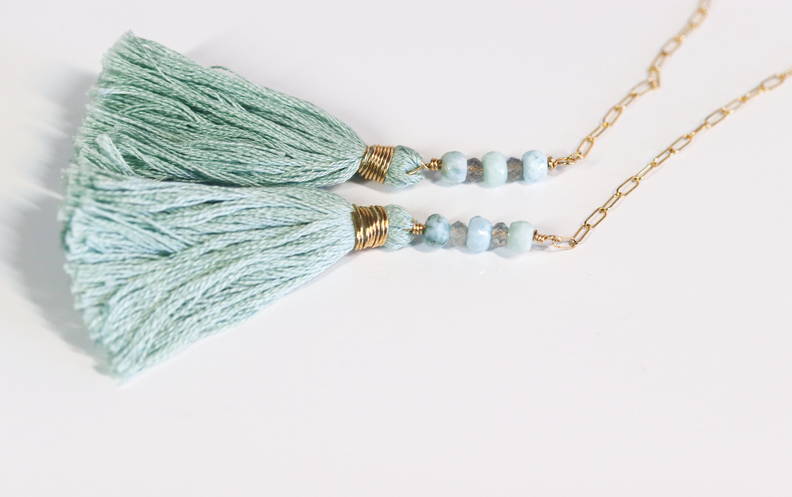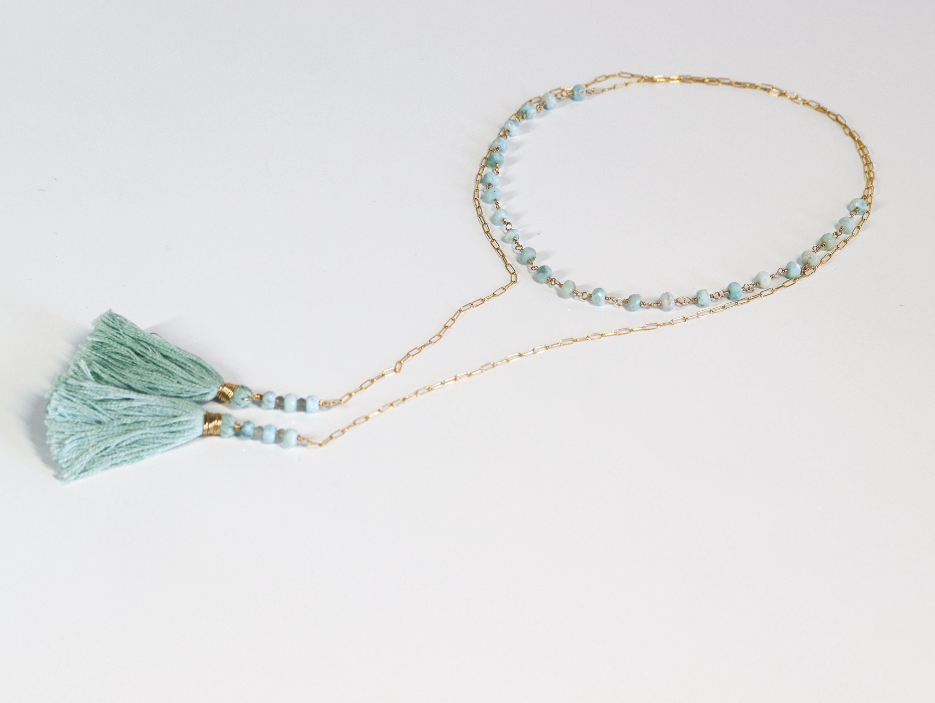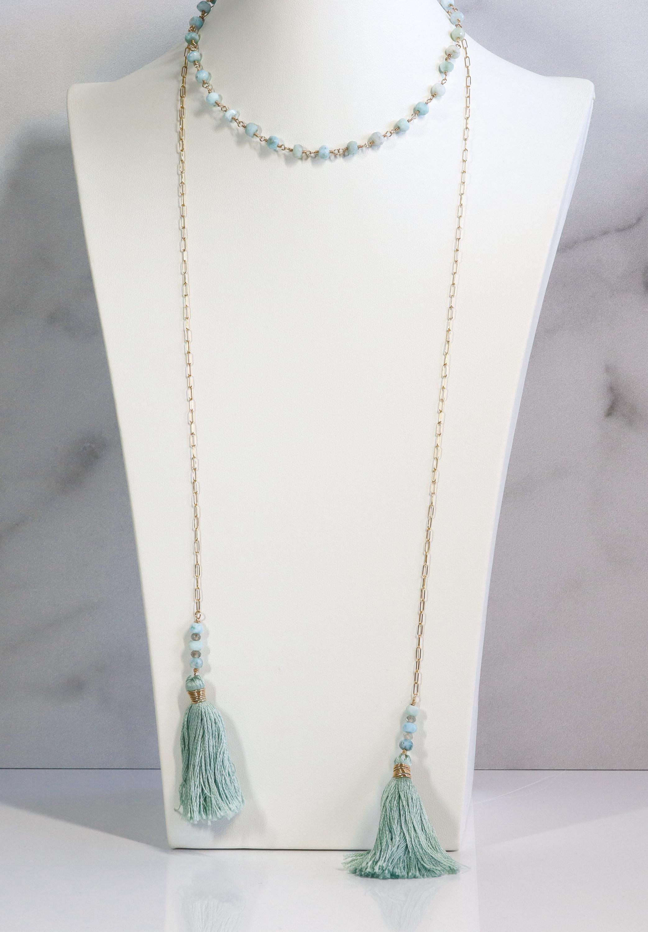 This long wrap necklace is made with genuine Larimar rondelles hand-wrapped in 14k gold-filled wire and linked together for a lightweight, easy-to-wear chain. The ends are finished with handcrafted cotton tassels accented with Larimar and Labradorite and wrapped in matching gold-filled wire.