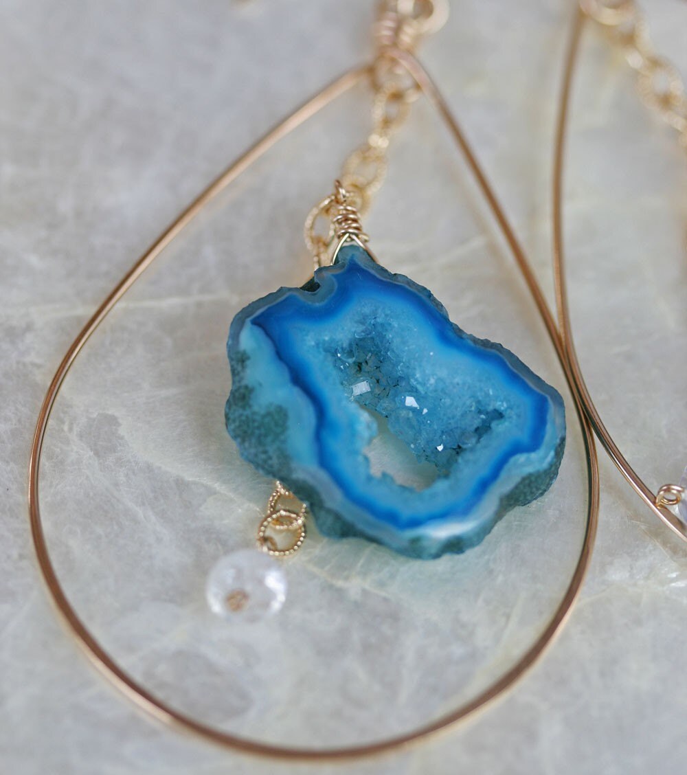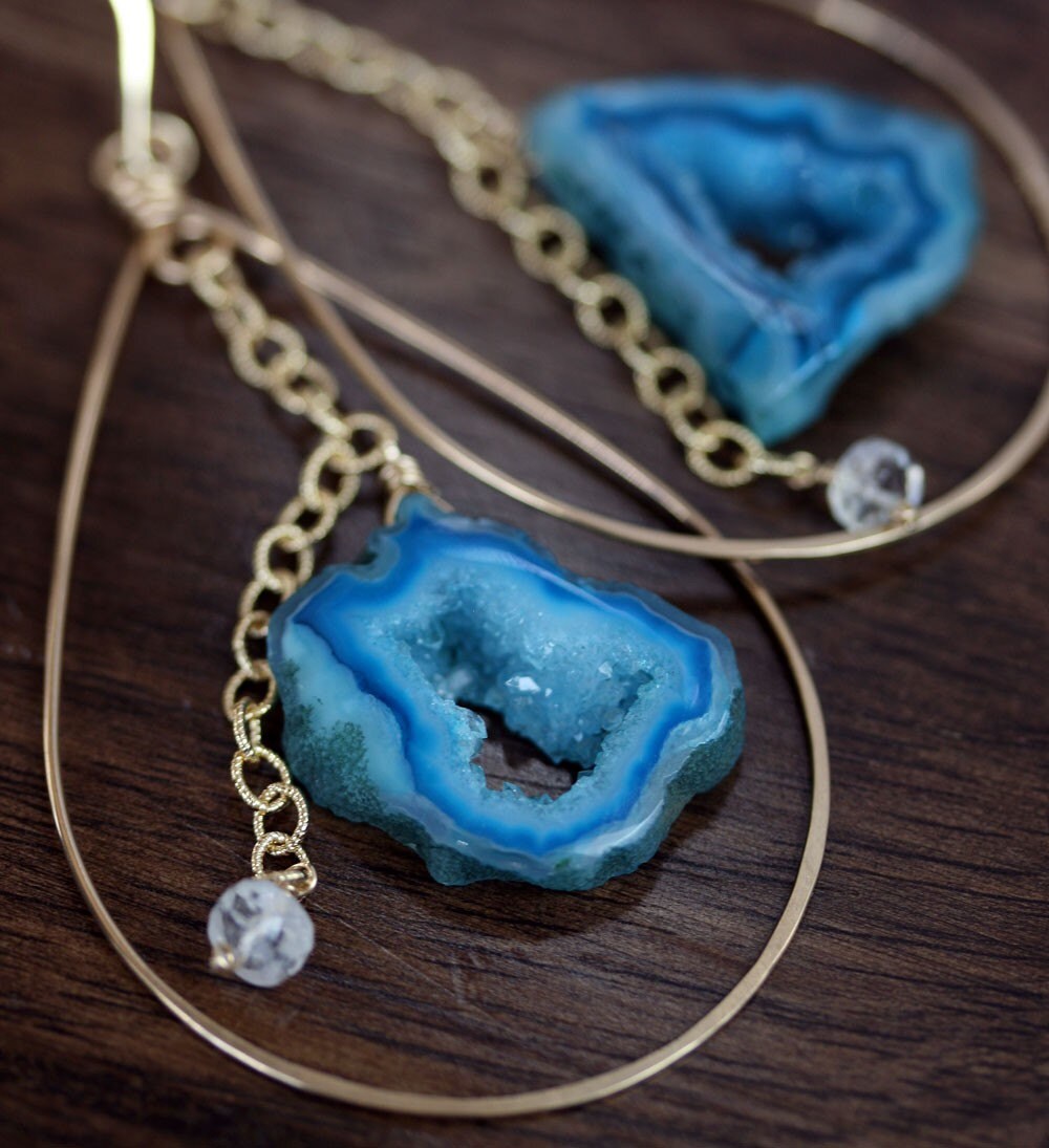 Stunning and colorful agate geode slices with glittering druzy inside creates the perfect statement earrings for your collection. This color way has bright shades of blues, teals, whites and sparkle (is that a color?). The hoop earring is handcrafted from 14k gold filled or sterling silver metal. The bottom of each hoop is hammered which creates a subtle texture and shine. Each geode slice hangs from a lovely, textured cable chain and is finished with a rainbow moonstone.