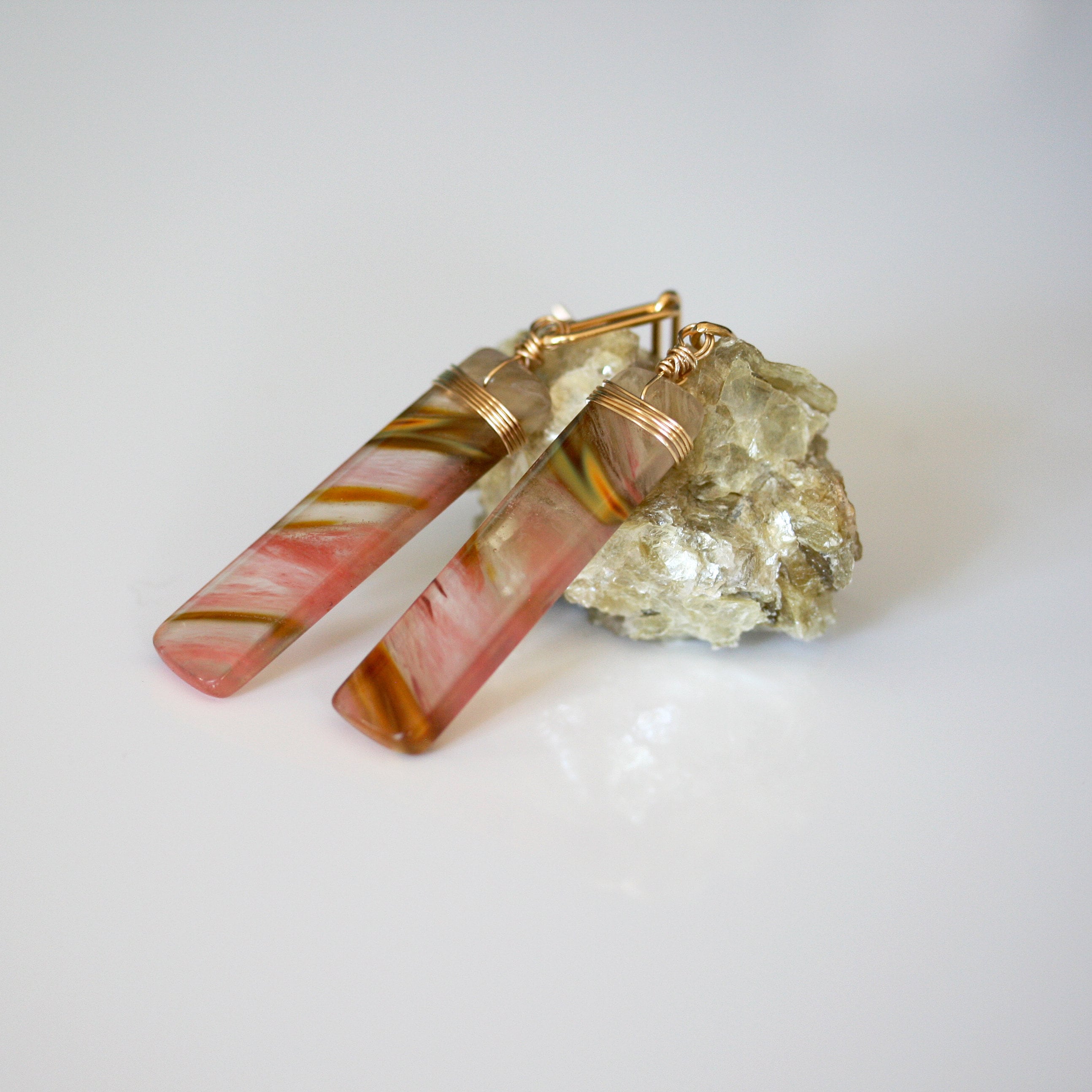 These Rectangle Drop Strawberry Quartz earrings are the perfect accessory for anyone looking to add a touch of elegance and uniqueness to their style. The stunning combination of clear quartz with wavy inclusions of strawberry pink, sienna brown, gold, and occasional flecks of black minerals creates a one-of-a-kind look that is sure to turn heads. The chunky gold rectangle paperclip style chain adds a touch of boldness and sophistication, making these earrings a great choice for both casual and formal occasions.