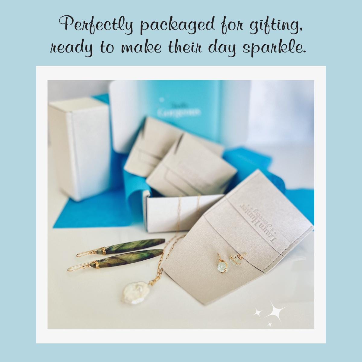 Your new jewelry or gift will be securely shipped in a custom white shipping box. Smaller items may arrive in a secure, padded mailer. Jewelry arrives in a branded jewelry pouch, perfect for storage, travel, or gifting. If desired, you can request a gift box option at checkout. Additionally, gift wrapping is provided for an extra $5, featuring kraft and silver paper tied with a festive teal, silver bow. During the holiday season, gift wrap will be holiday-themed by default, unless specified otherwise.
